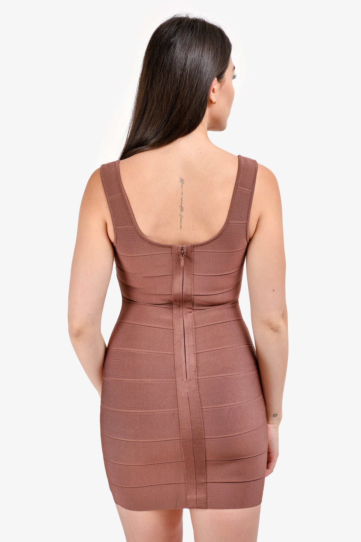 Refresh availabilityHerve Leger Brown Mini Dress. Scoop neckline. Sleeveless. Back zip closure. Tonal stitching.