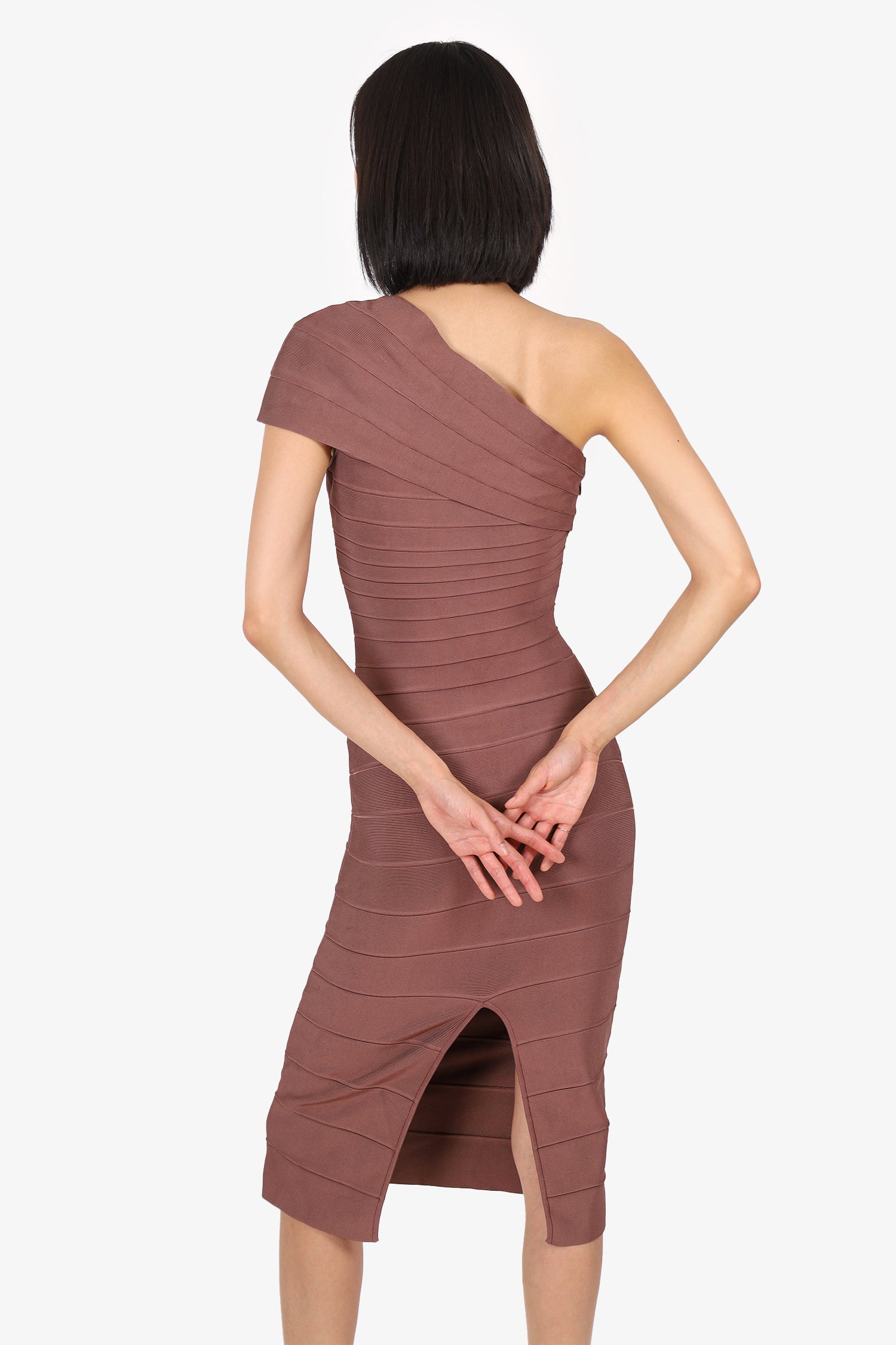 Refresh availabilityHerve Leger Brown One-shoulder Bandage Bodycon Midi Dress. Pull-on. One shoulder neckline. Overlay detail at neckline. Side zip with hook closure. Rear bottom slit at hemline. Tonal stitching.