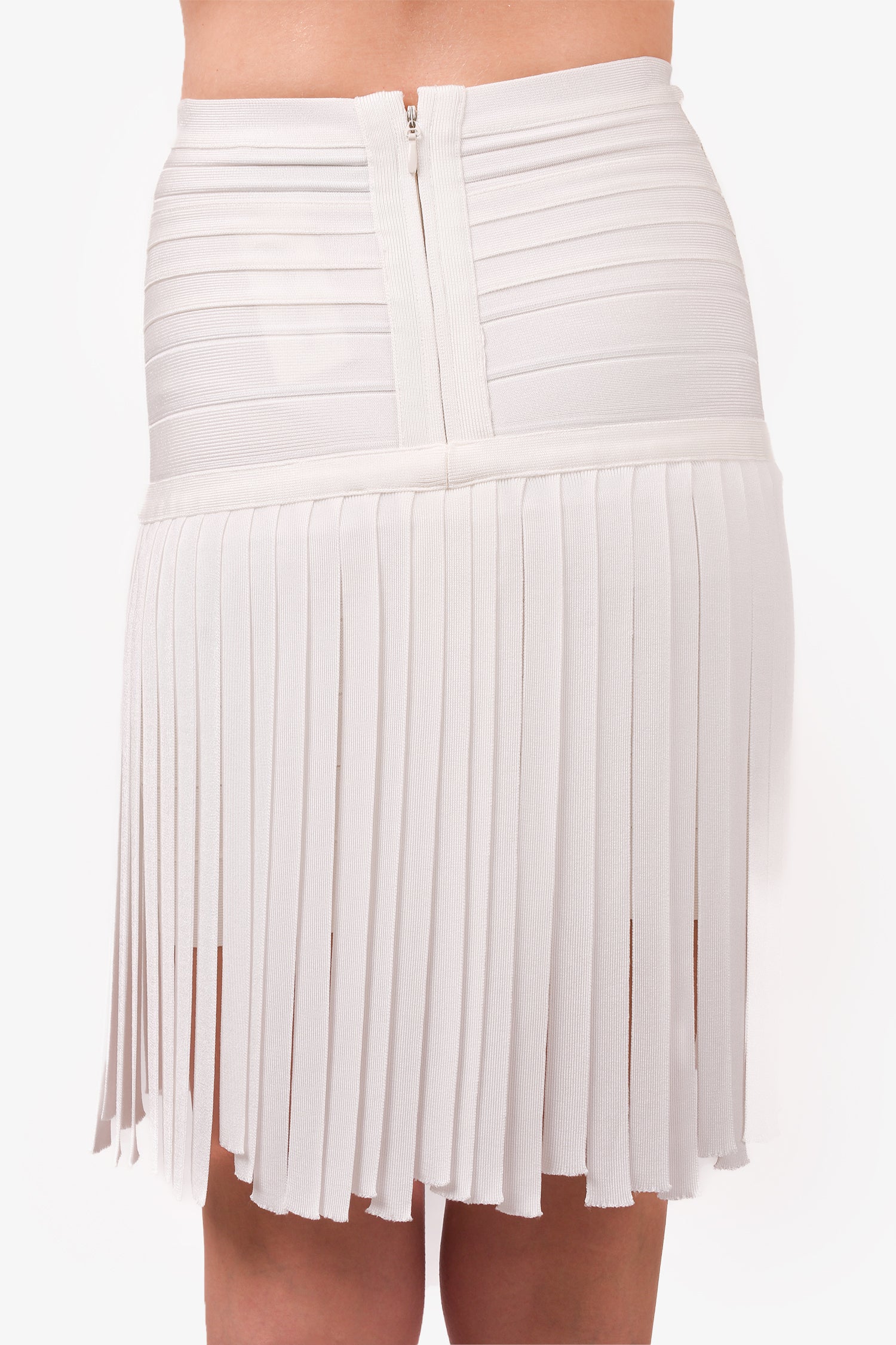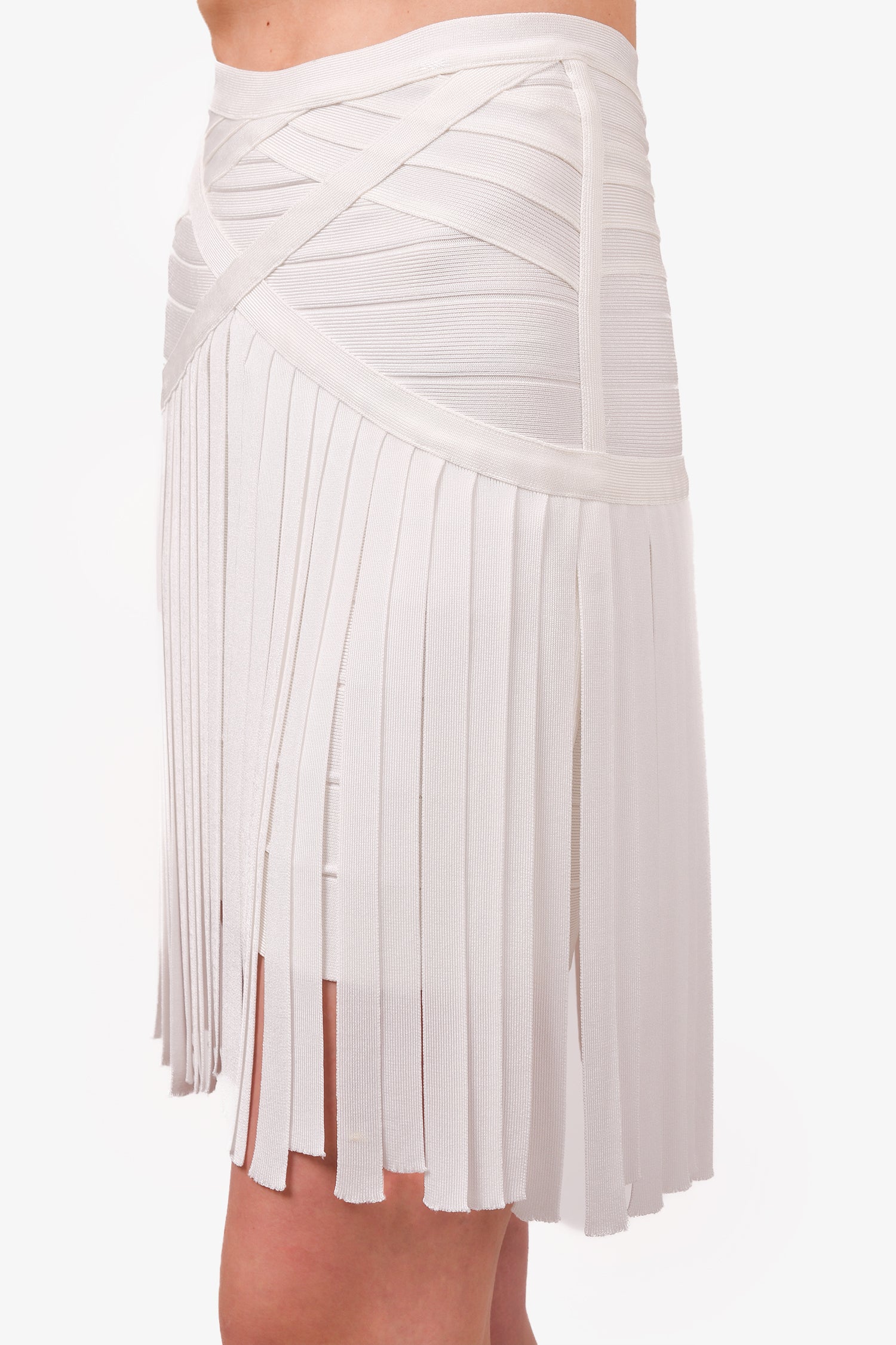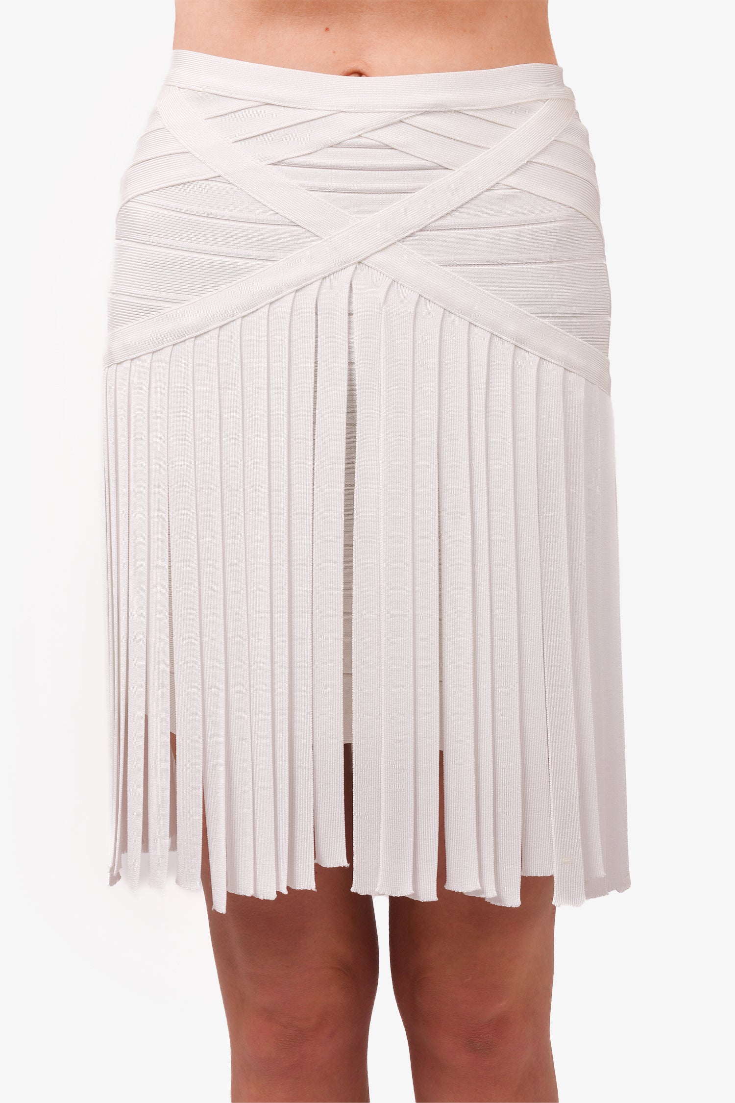 Refresh availabilityHerve Leger White Bandage Fringe Mini Skirt. Rear zip and hook closure. Unlined. Tonal stitching.