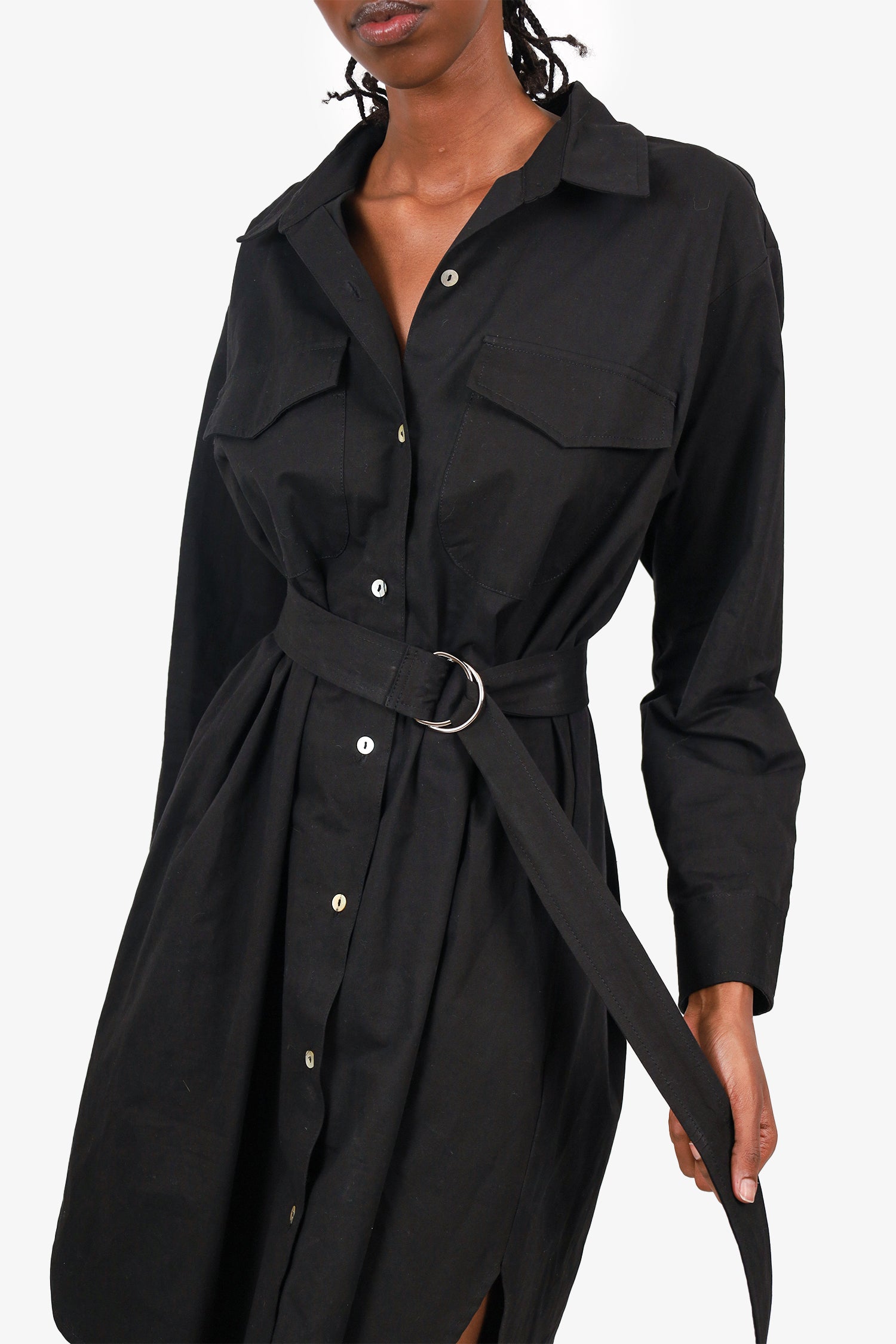 Refresh availabilityHorses Black Belted Button Down Shirt Dress. Collared-neckline. Front button-up closure. Removable belt at waistline with sliding buckle closure. Sleeve cuffs with button-up closure. 4 exterior pockets; 2 chest flap, 2 side slip. Side vents at bottom of dress. Silver-tone hardware. Tonal stitching.