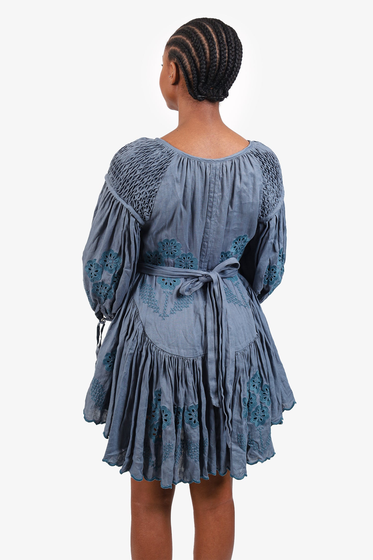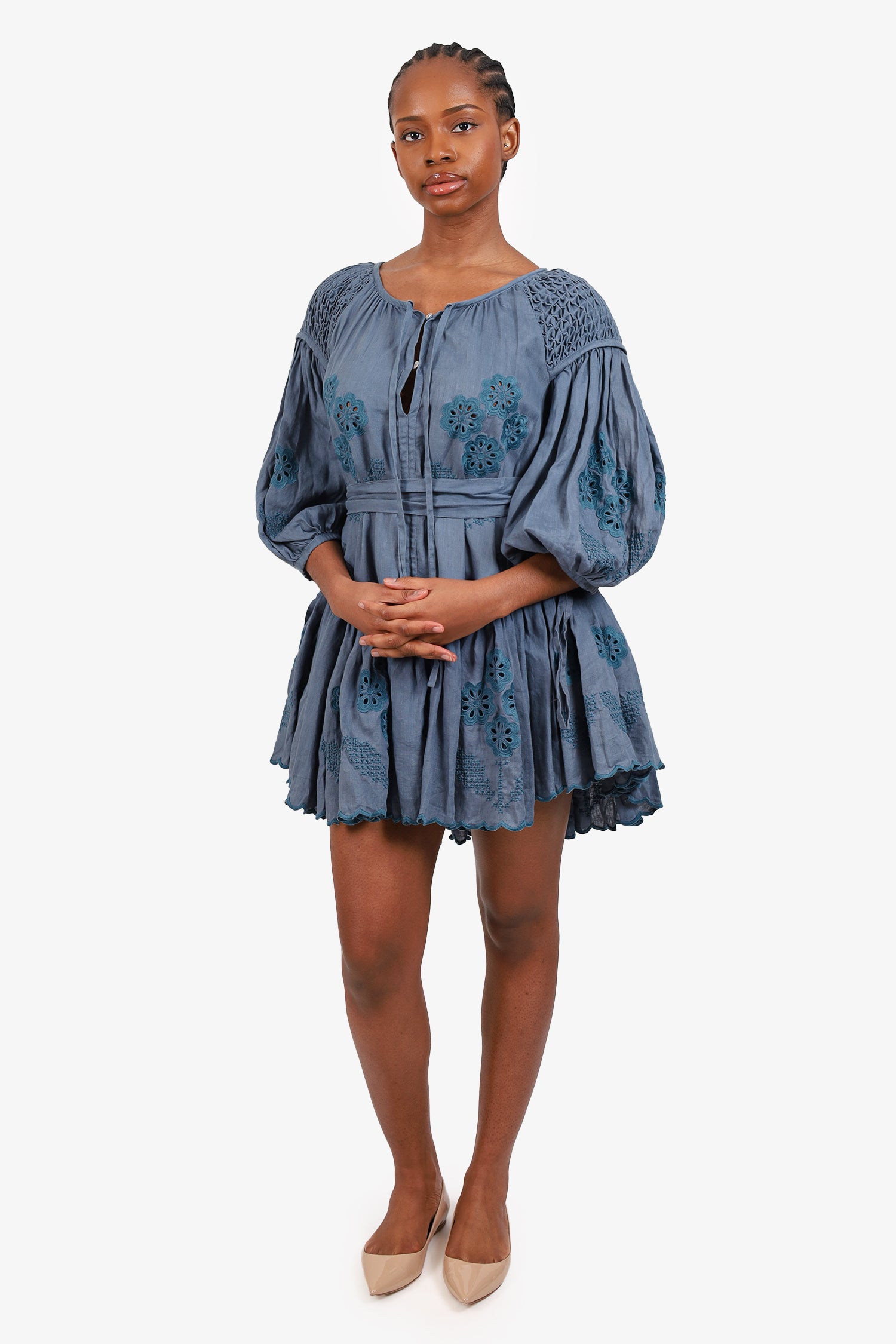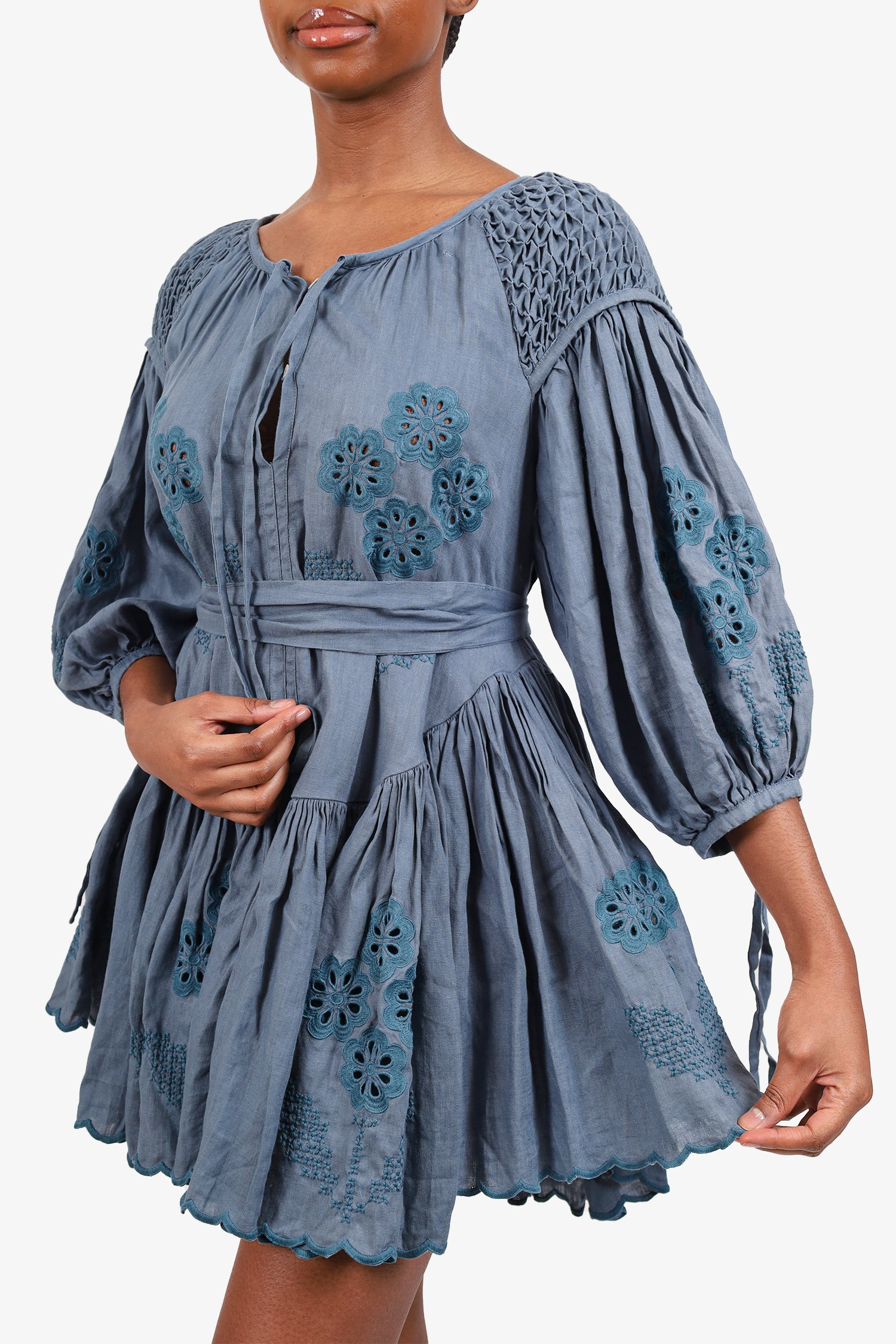 Refresh availabilityInnika Choo Blue Eyelet Long Sleeve Mini Dress. Slip-on. Round neckline. Front button-up closure with tie-up closure at front neckline. Sleeve cuffs with button-up closure and tie-up closure. Perforated eyelet detail throughout. Tonal stitching.