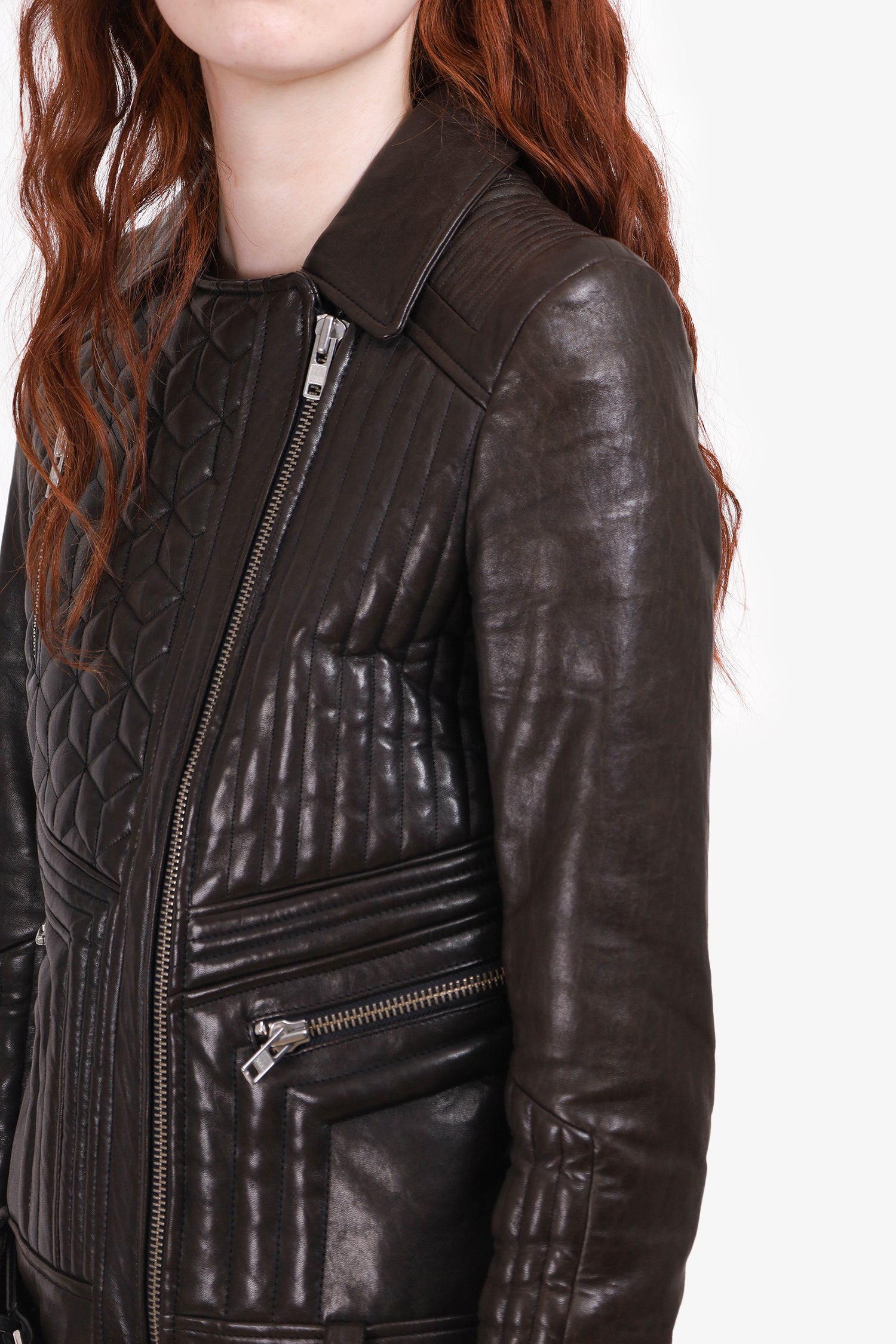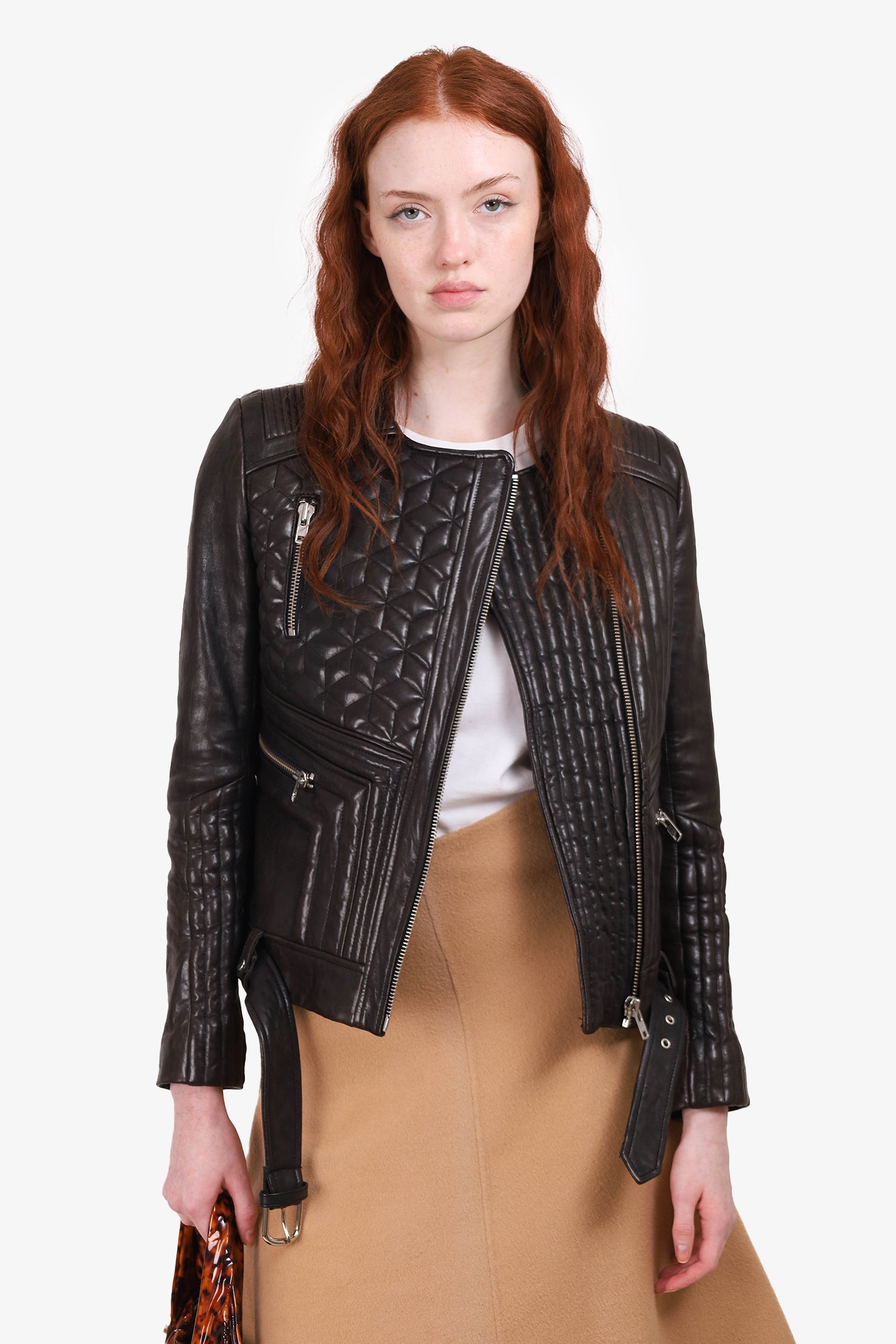 Refresh availabilityIRO Black Padded Leather Jacket. Collared neckline. Front zip closure. 3 front zip pockets. Removable/adjustable pull through belt around waistline. Silver-tone hardware. Lined. Tonal stitching.