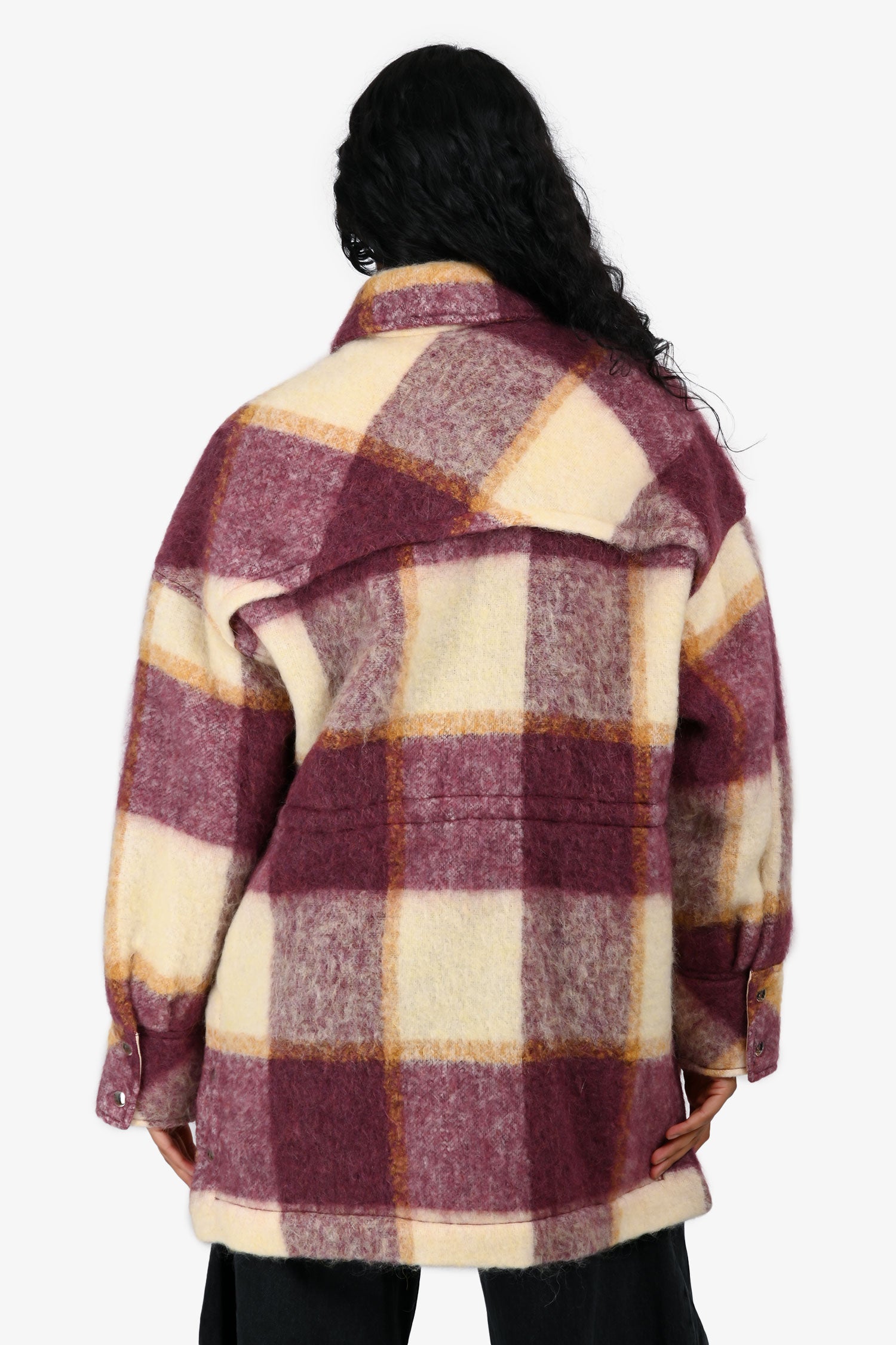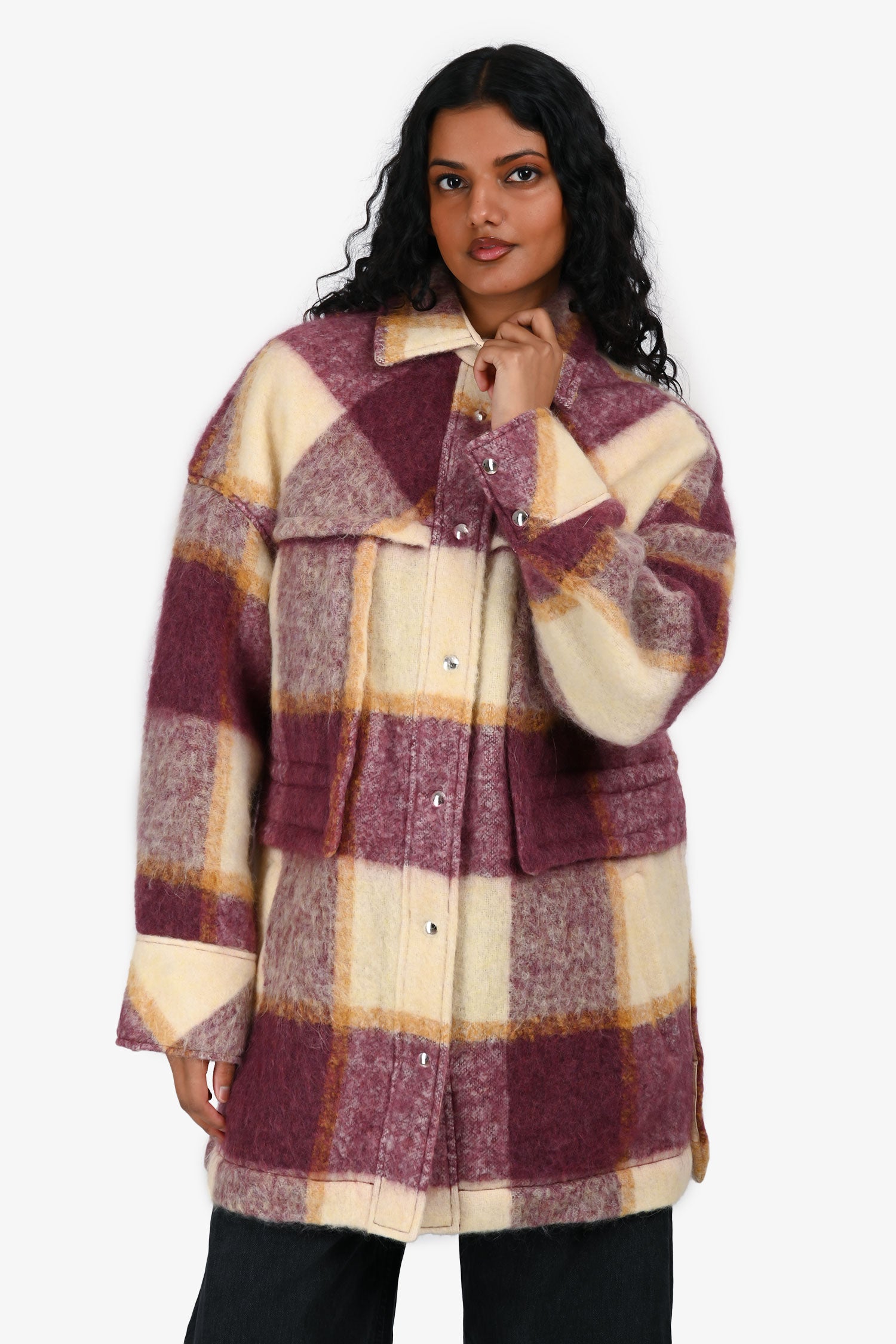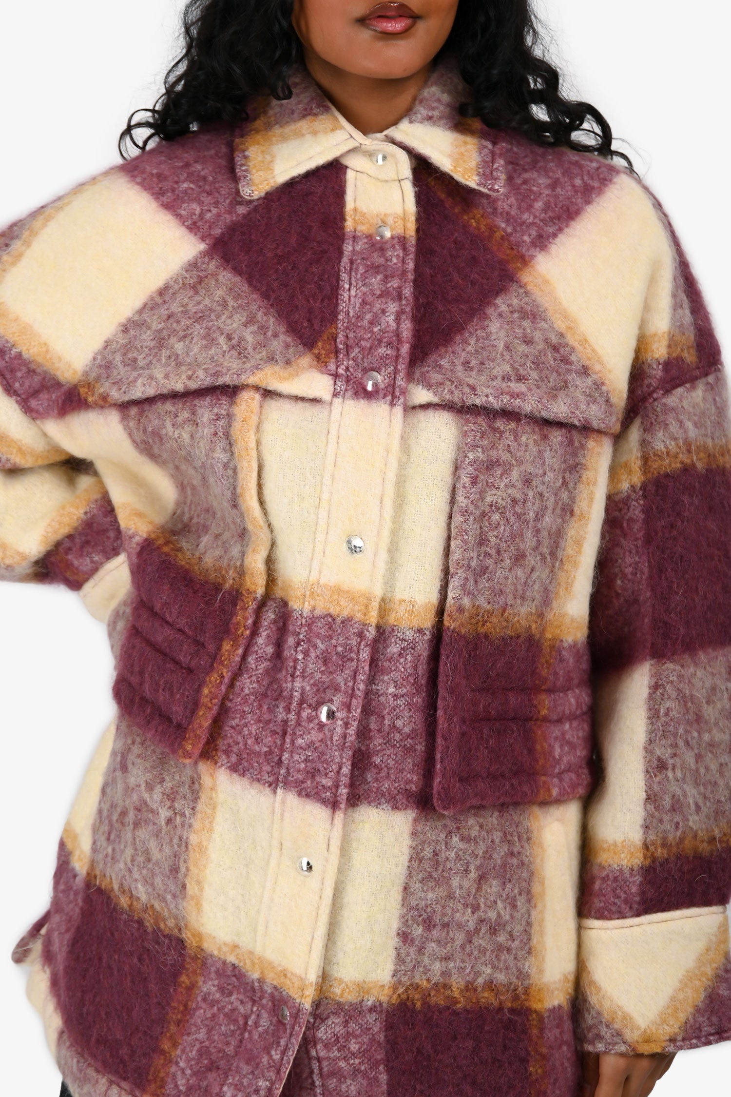 Refresh availabilityIRO Cream/Burgundy Mohair/Alpaca Blend Plaid Shirt Jacket. Slip-on. Collared neckline. Front snap button-up closure. 2 front pockets. Snap-button closures on the hem. Silver-tone hardware. Tonal stitching.