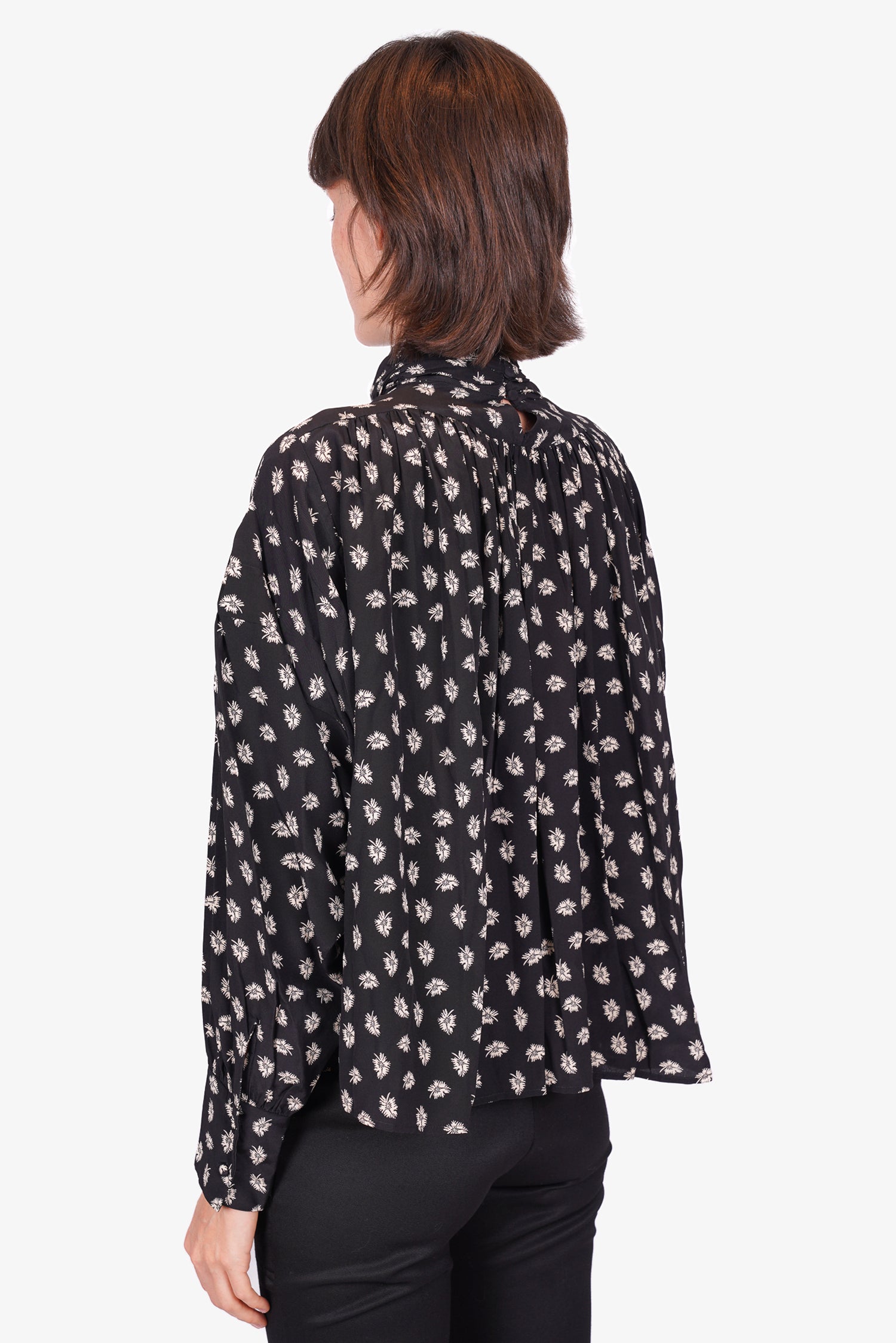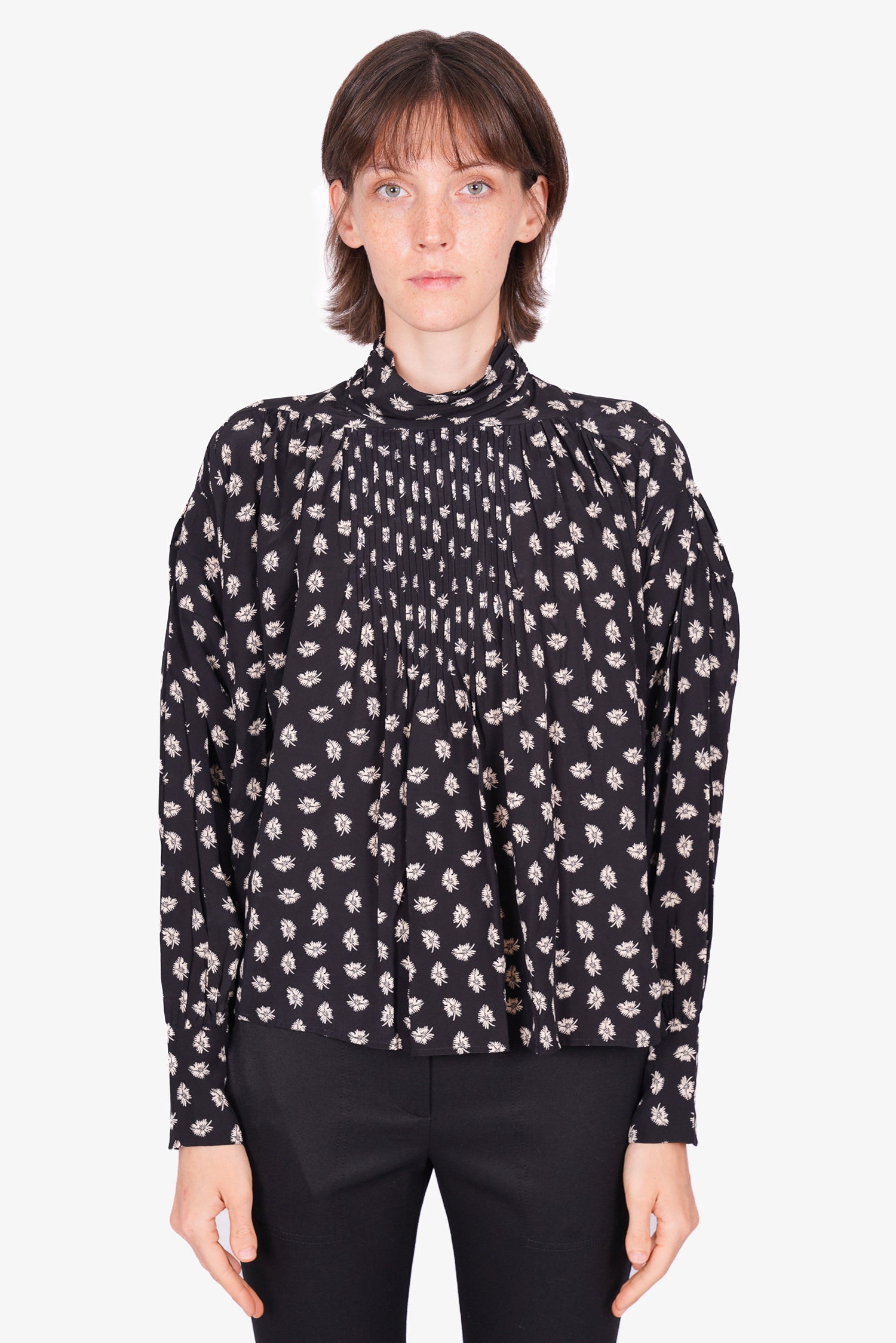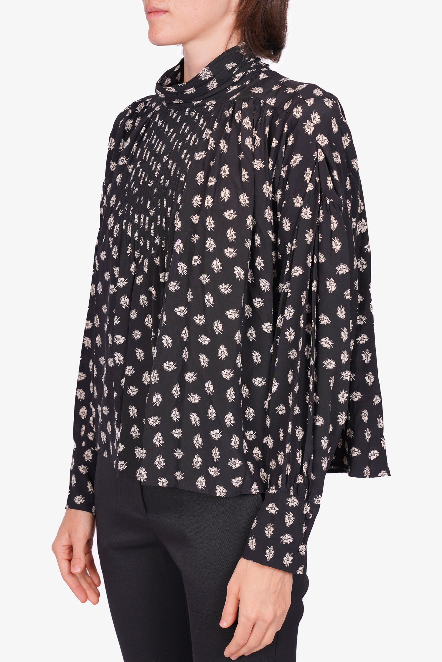 Refresh availabilityIsabel Marant Black Floral Print Blouse. Mock neckline with button closure. Winged Sleeves. Tonal stitching.