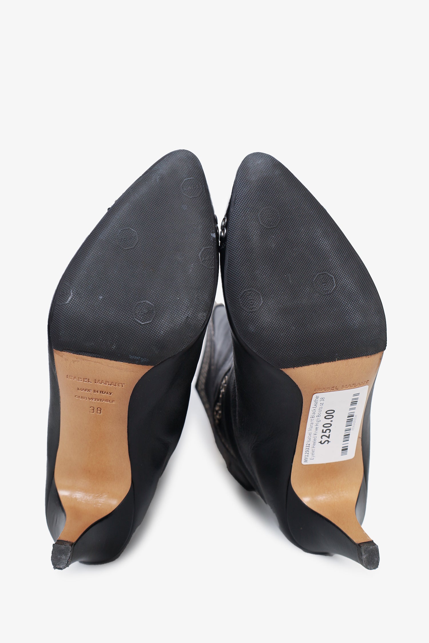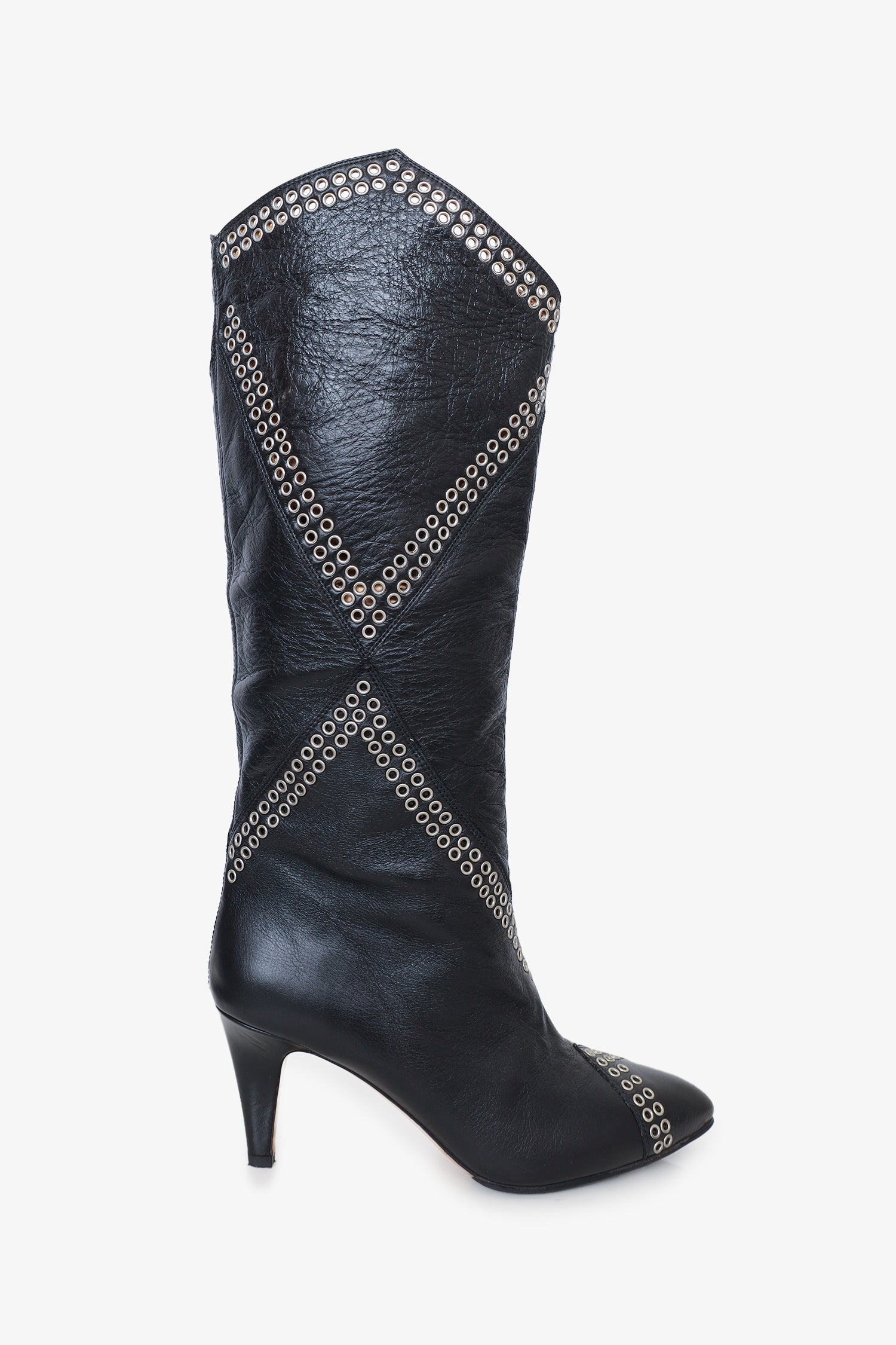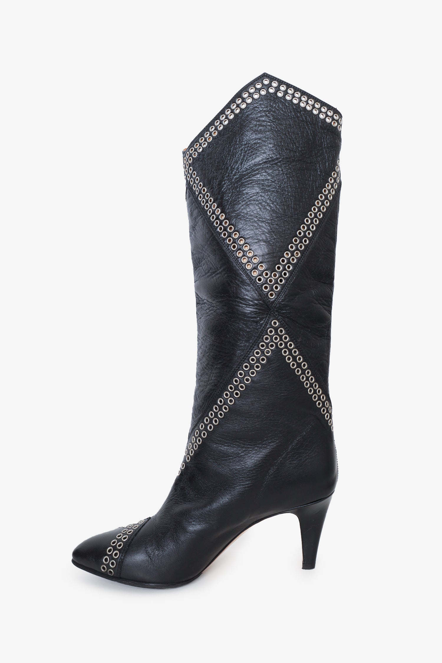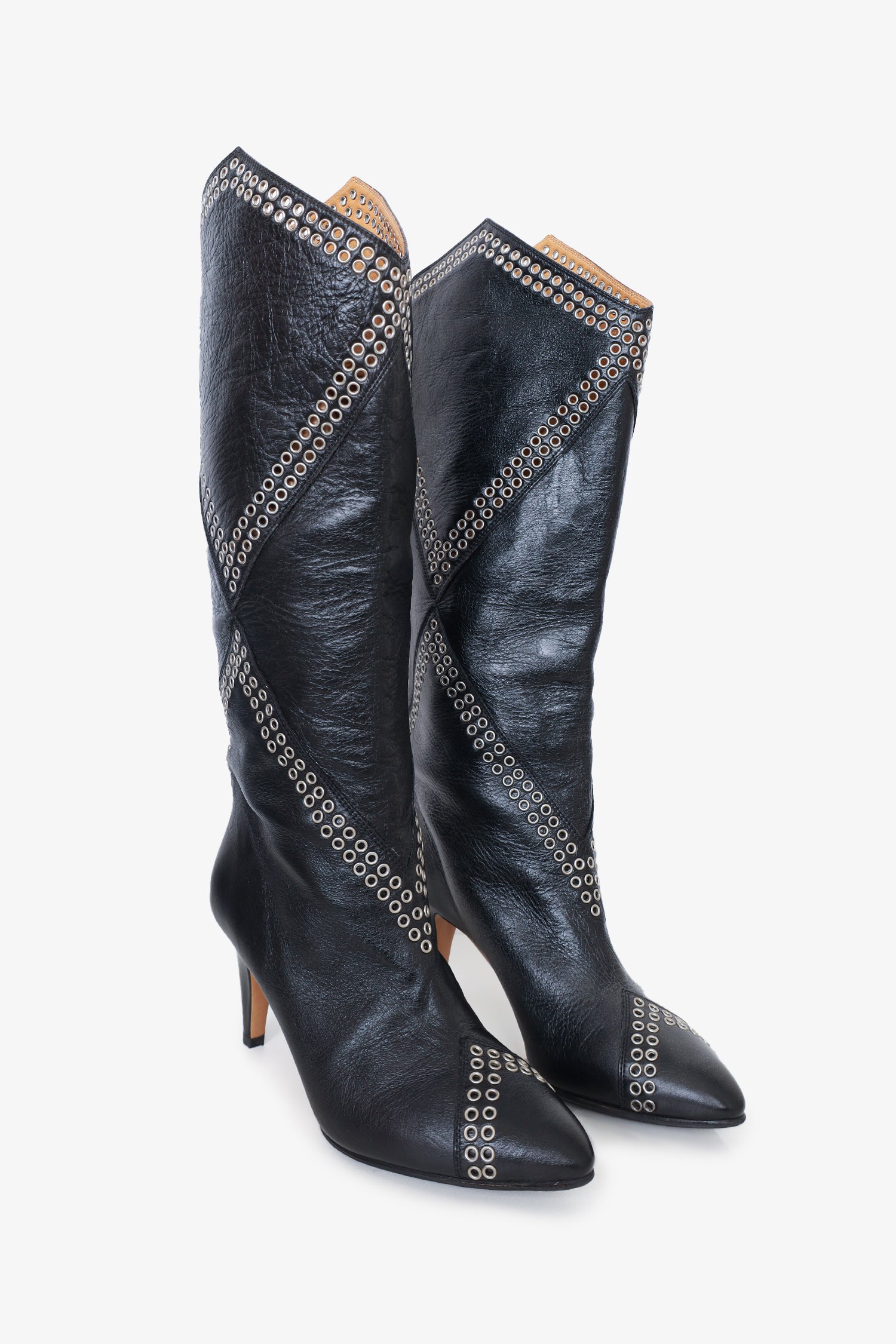 Refresh availabilityIsabel Marant Black Leather Eyelet Heeled Knee High Boots. Pull-on. Pointed toe. Tonal stitching.