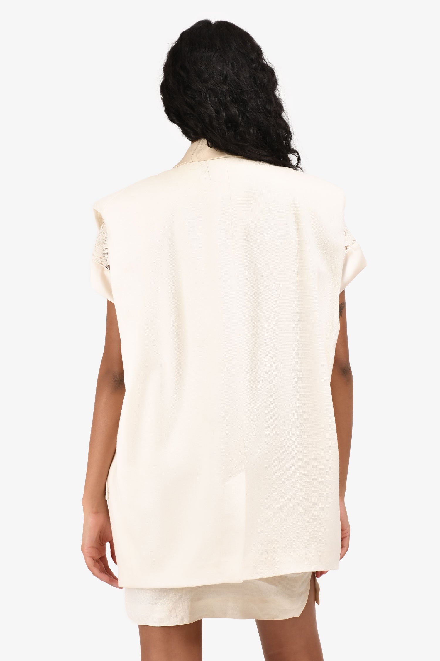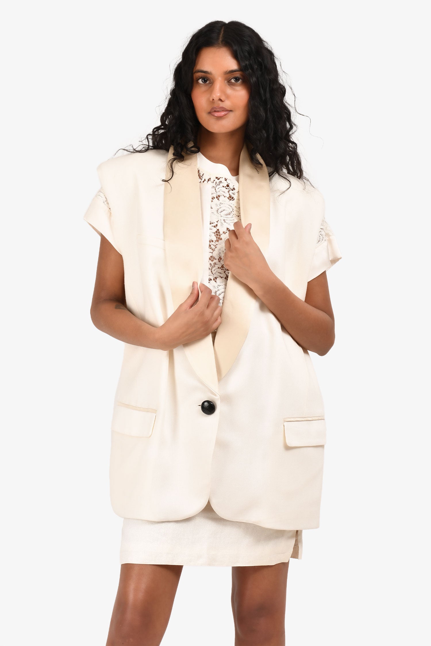Refresh availabilityIsabel Marant Cream Satin Lapel Oversized Vest. Fully lined. Single front button closure. Two front flap pockets. Padded shoulders. Tonal stitching.