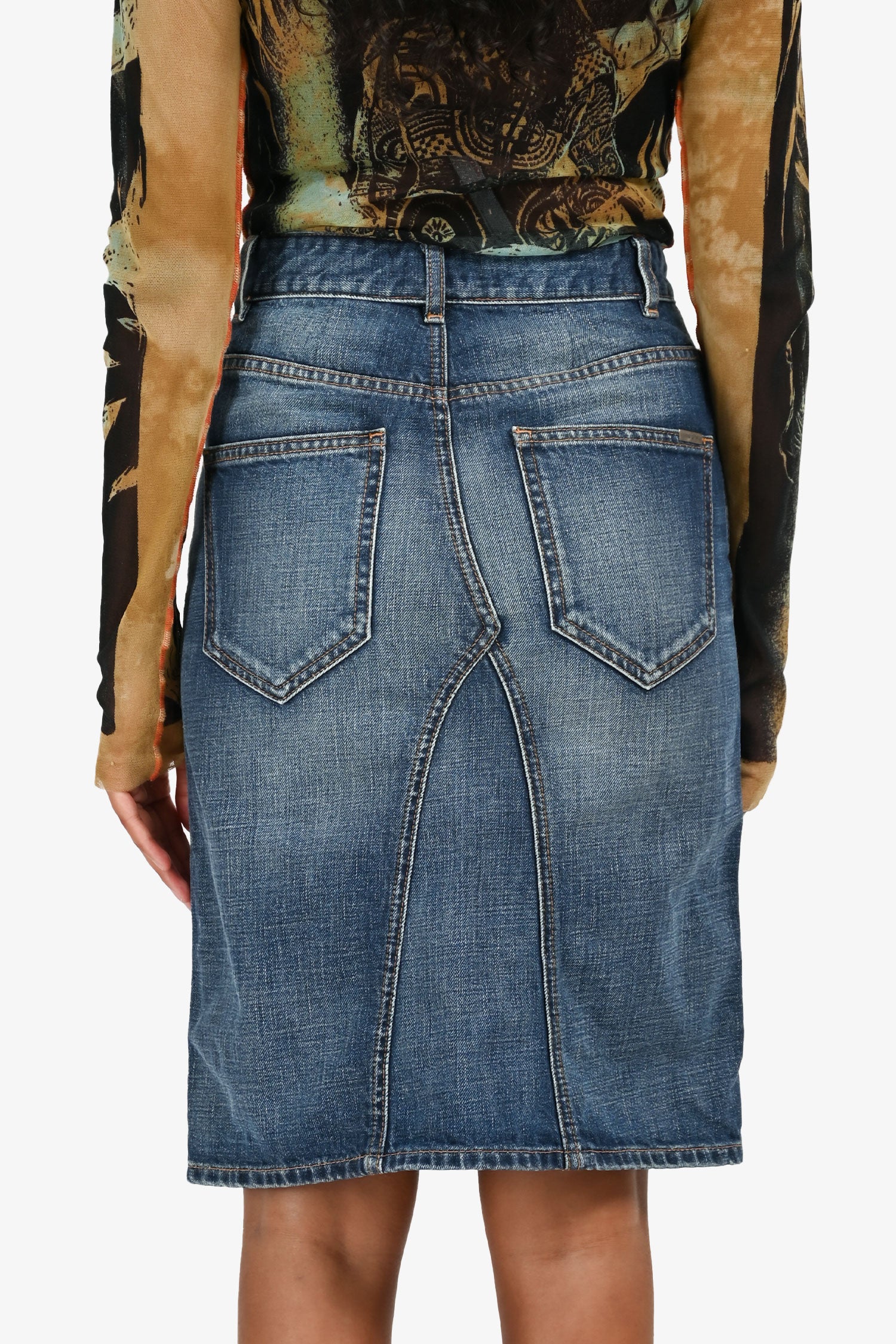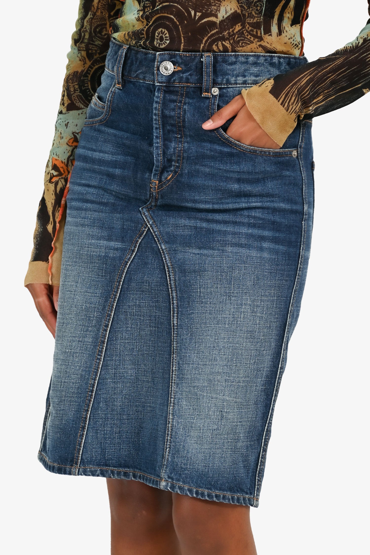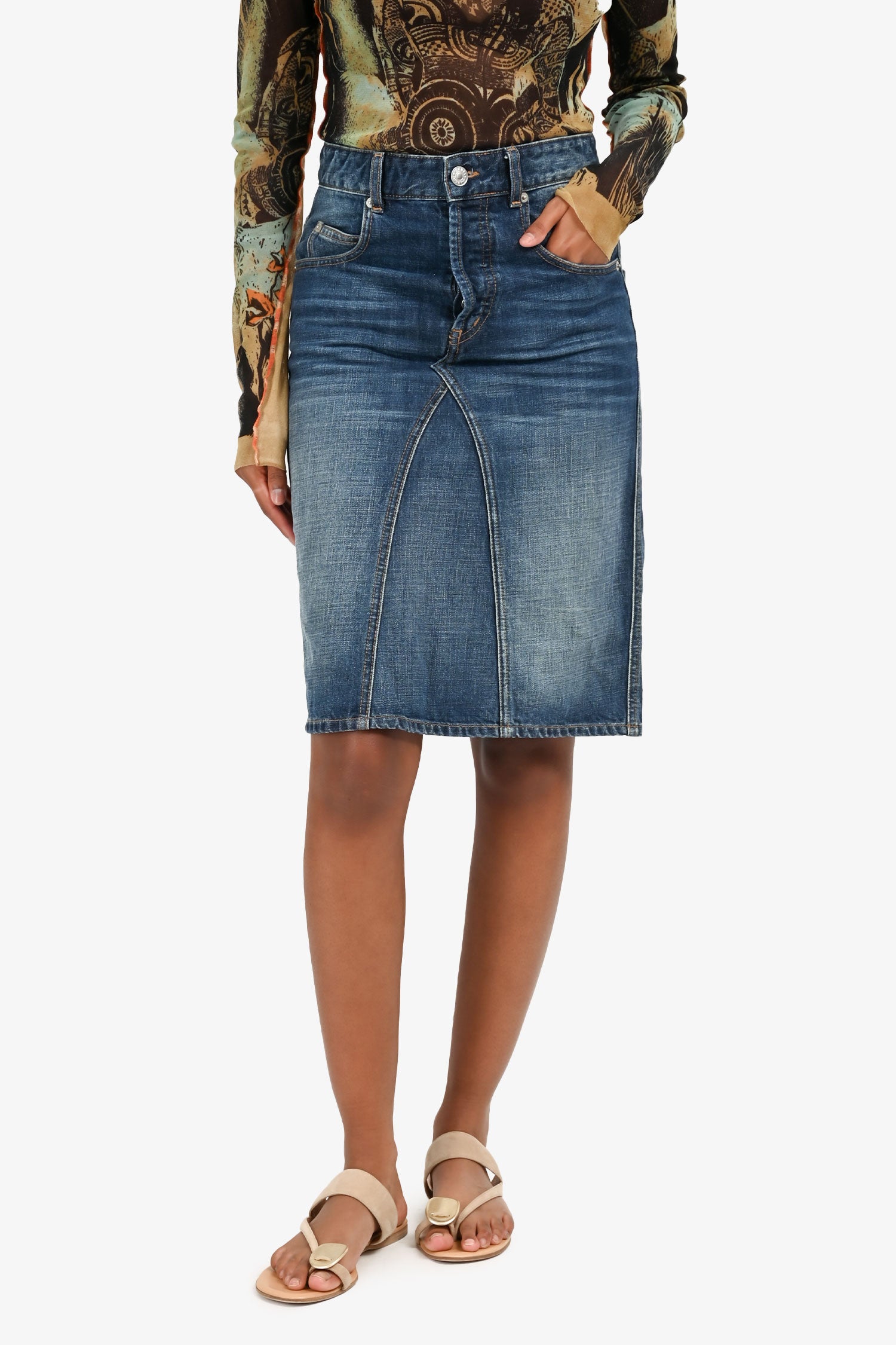 Refresh availabilityIsabel Marant Etoile Blue Denim Midi Jean Skirt. Zip fly with button closure. Classic five-pocket styling. Center front slit. Faded wash detailing. Tonal stitching.