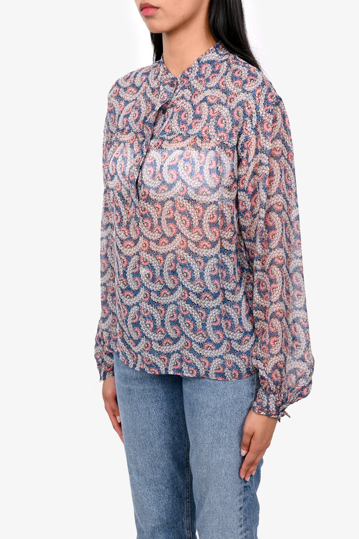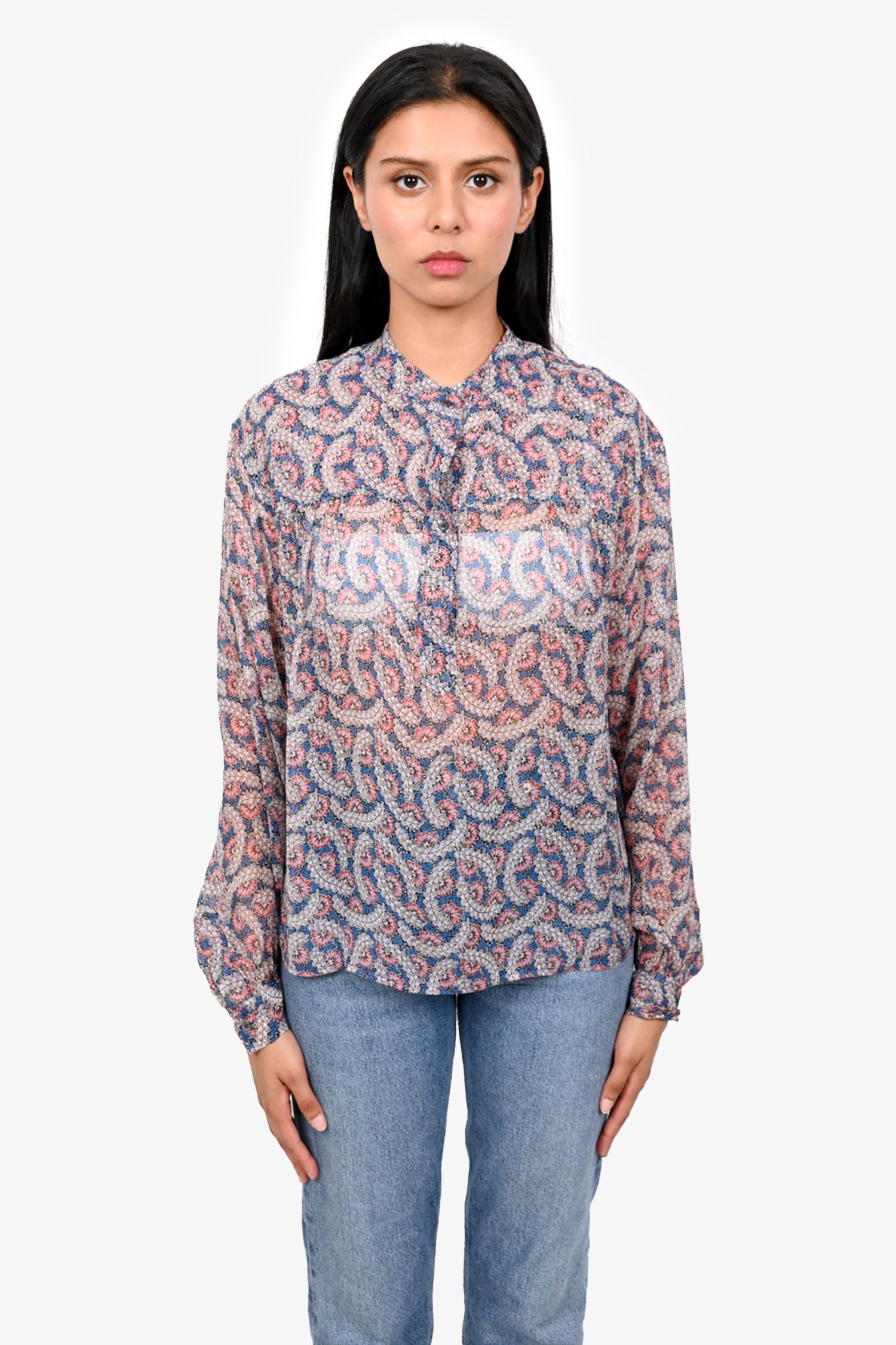 Refresh availabilityIsabel Marant Etoile Blue/Pink Printed Sheer Silk Top. Pull-on. Snap button closures at the front. Tonal stitching. Button closure on the cuffs.