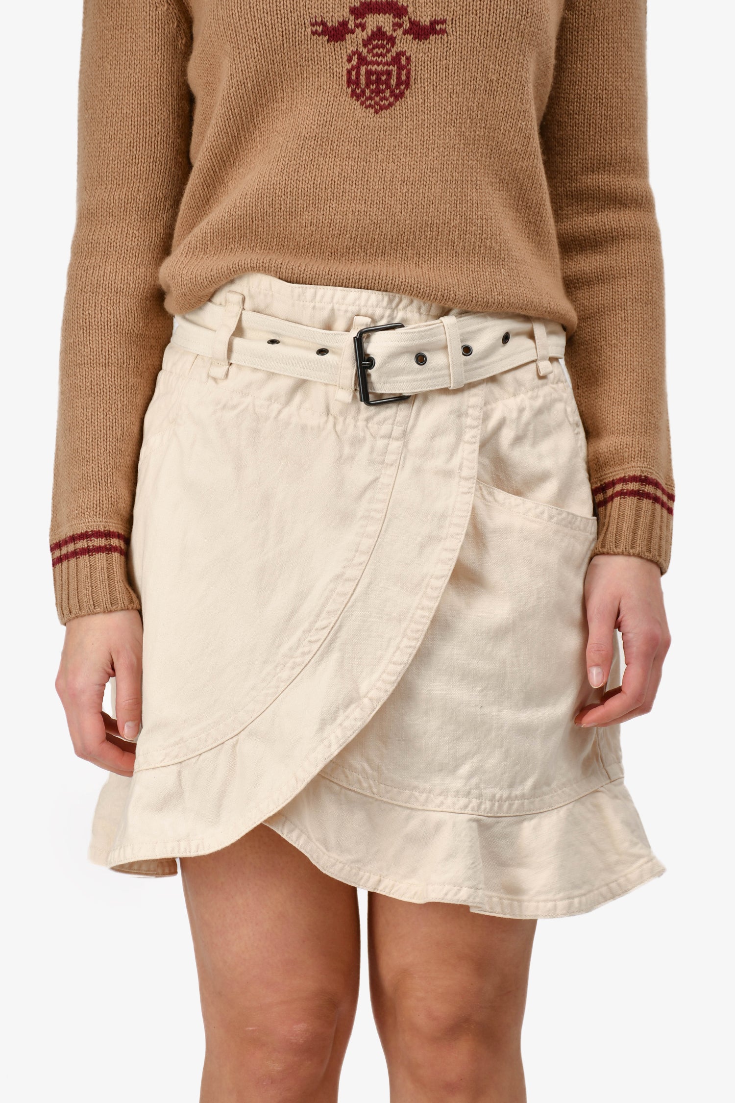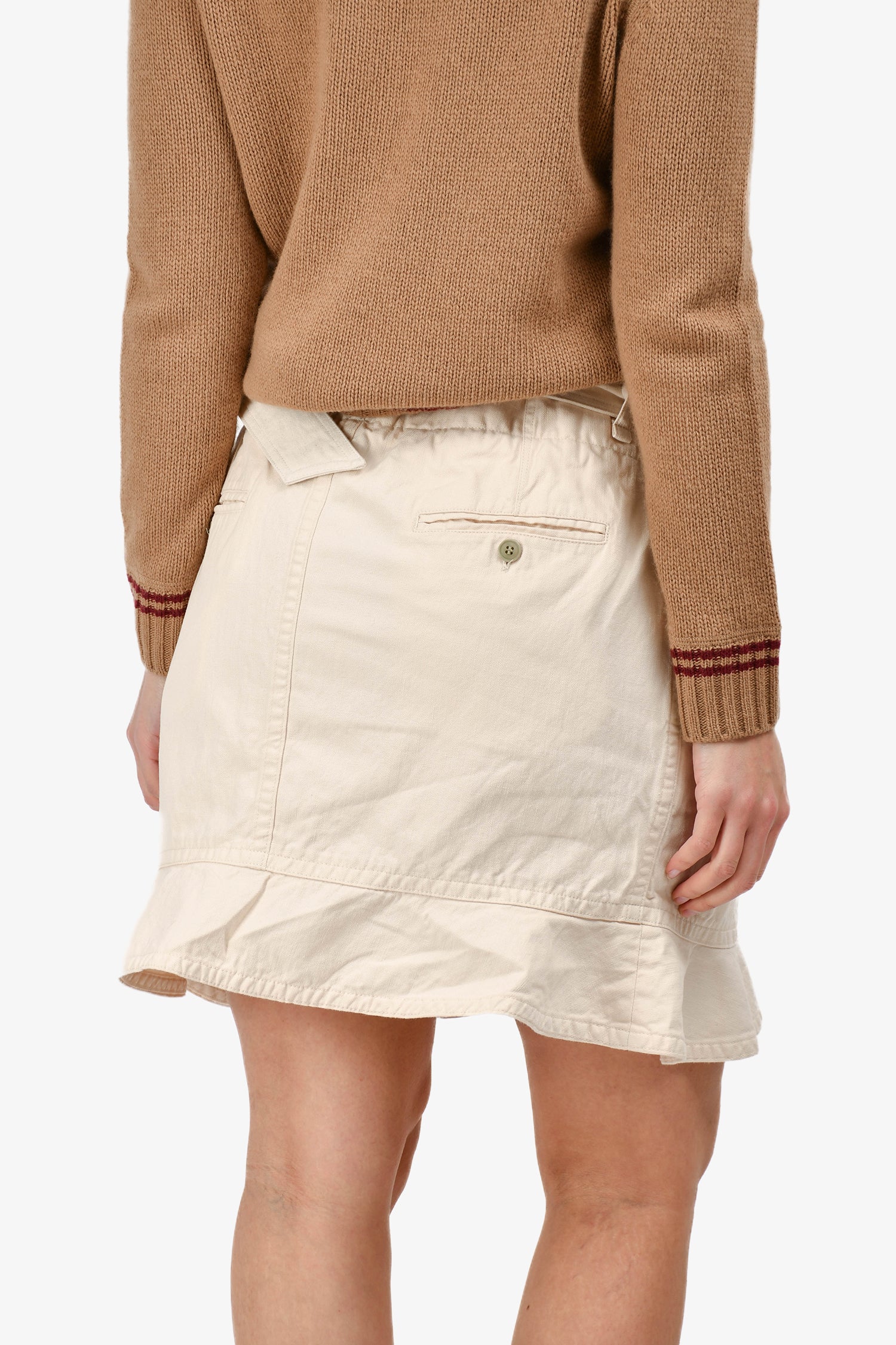 Refresh availabilityIsabel Marant Etoile Cream Ruffled Belted Denim Mini Skirt. Front button closure. Waist belt with buckle closure. 2 front slip pockets and 2 rear slip pockets. Unlined. Tonal stitching.