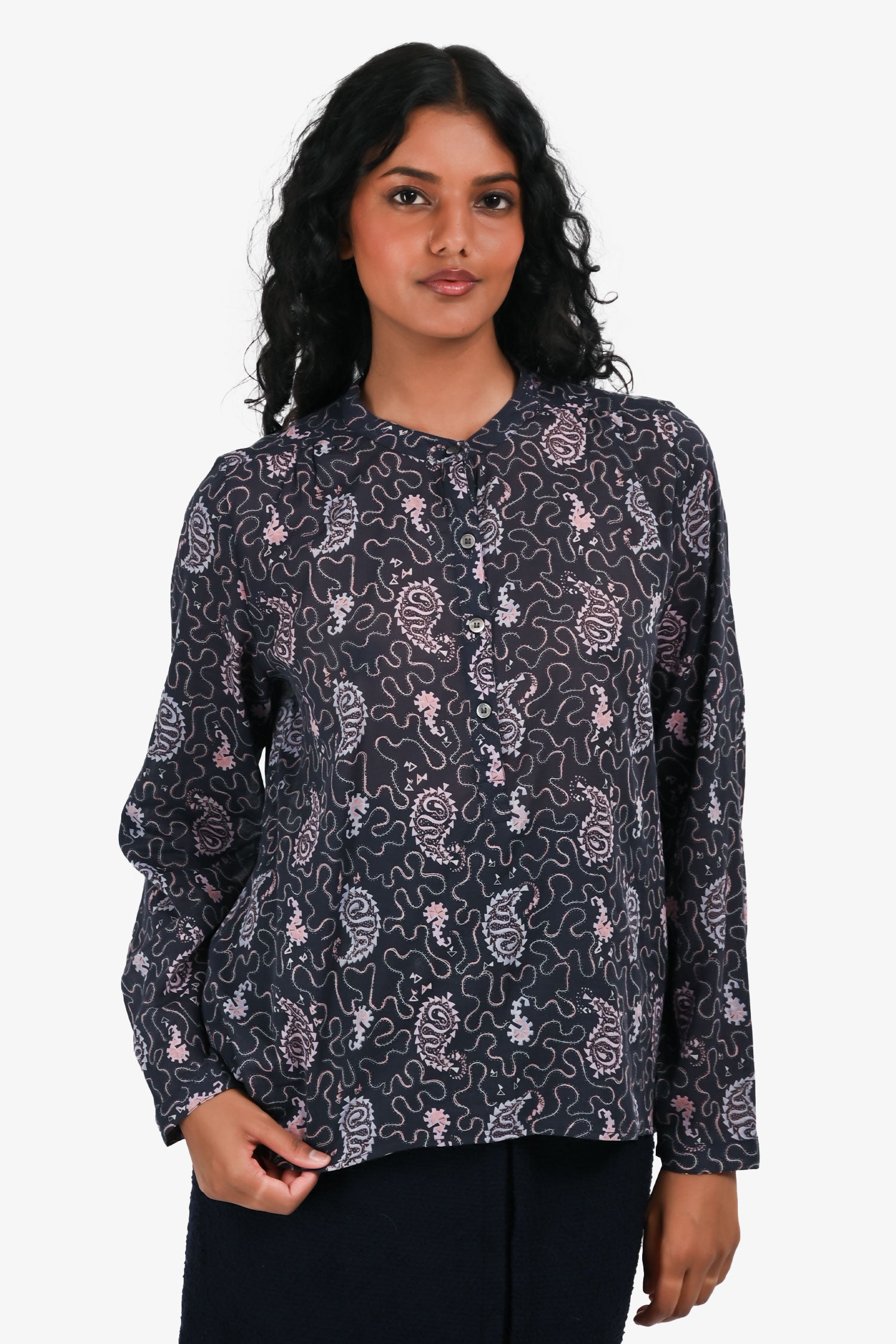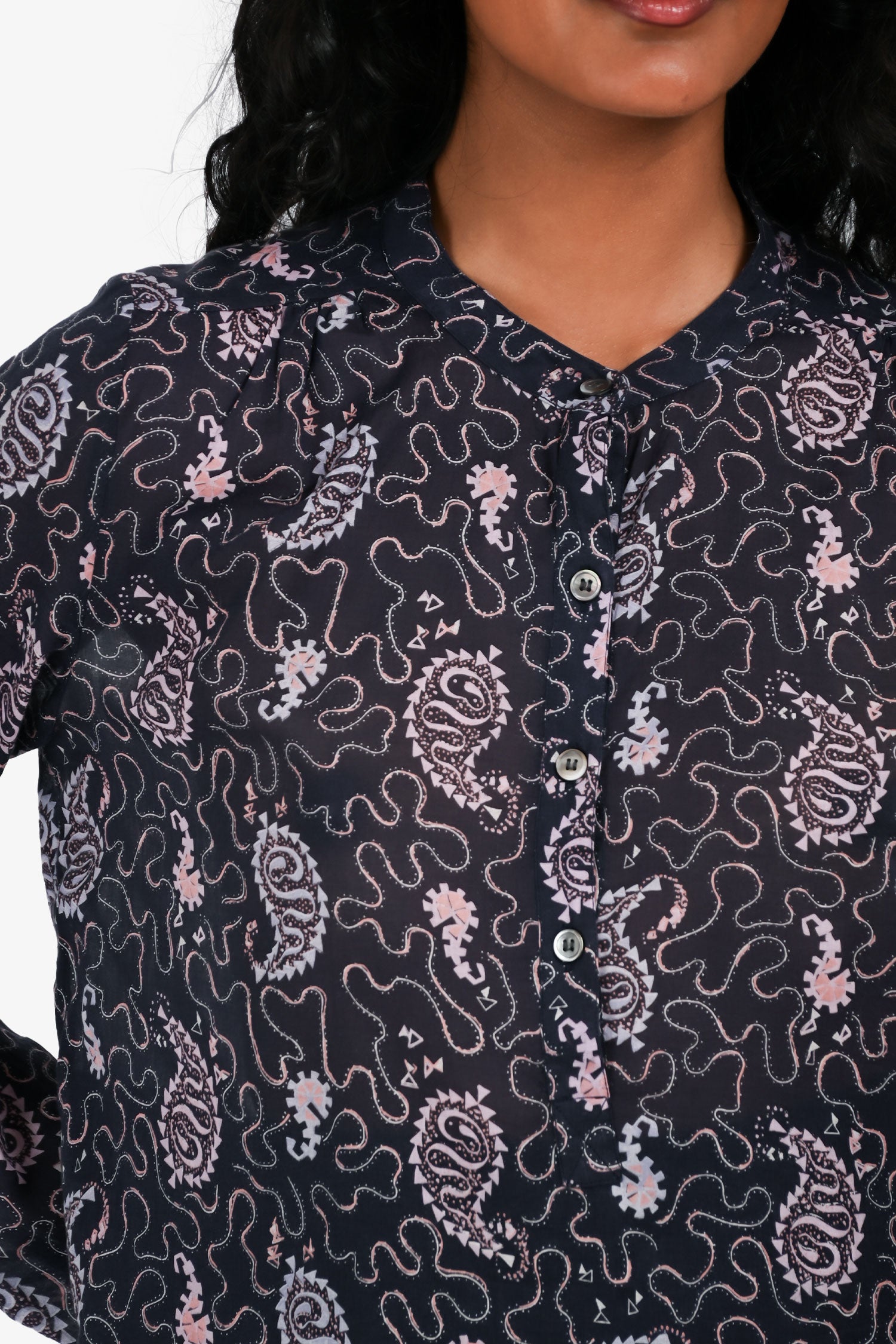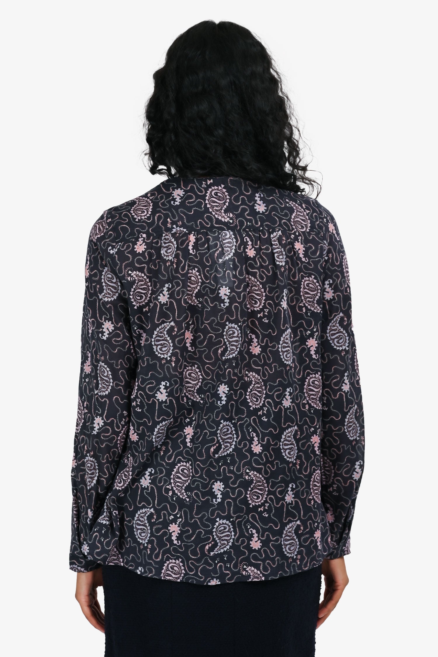 Refresh availabilityIsabel Marant Etoile Navy/Pink Patterned Sheer Blouse. Front button closure. Round neckline with tie detail. Long sleeves with buttoned cuffs. Tonal stitching.
