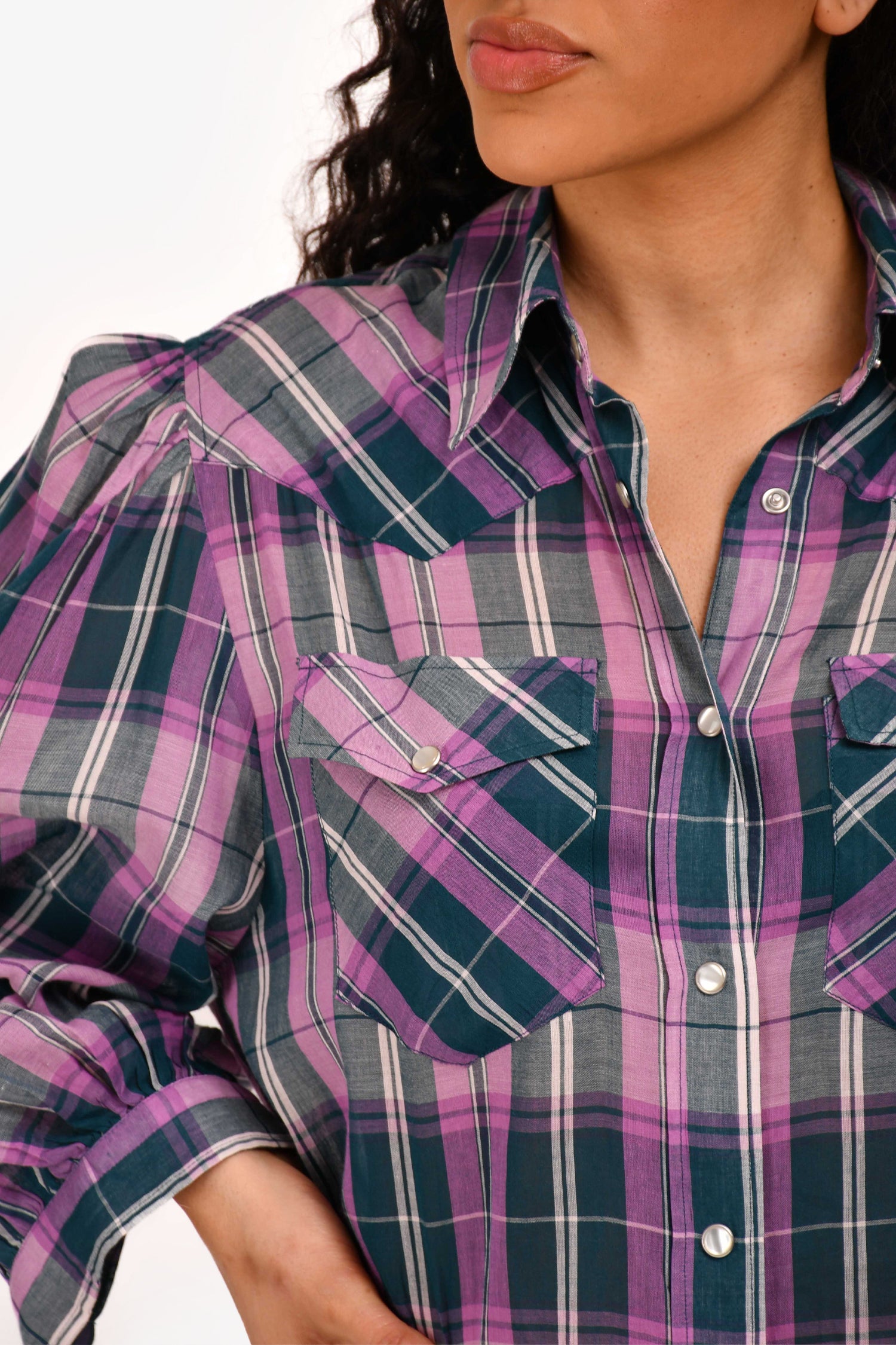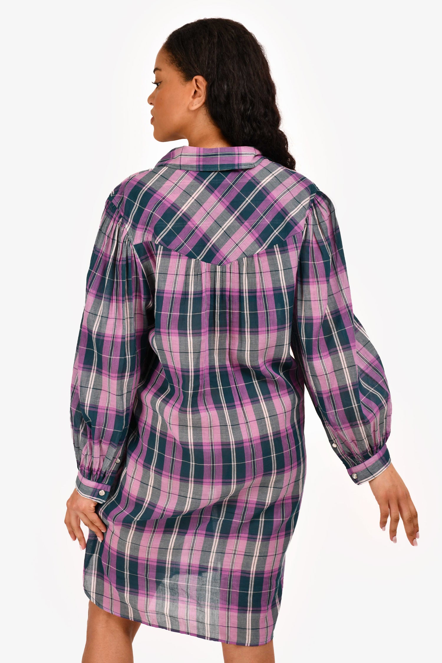 Refresh availabilityIsabel Marant Etoile Purple/ Teal Plaid Cotton Printed 'Britany' Shirt Dress. Point collar. Button front closure. Long sleeves with buttoned cuffs. Two front flap pockets. Curved hem. Tonal stitching.