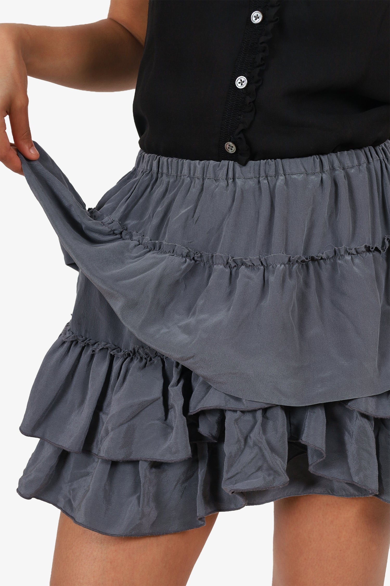 Refresh availabilityIsabel Marant Grey Silk Tired Ruffled Mini Skirt. Slip-on. Elasticated waistband. Tonal stitching.
