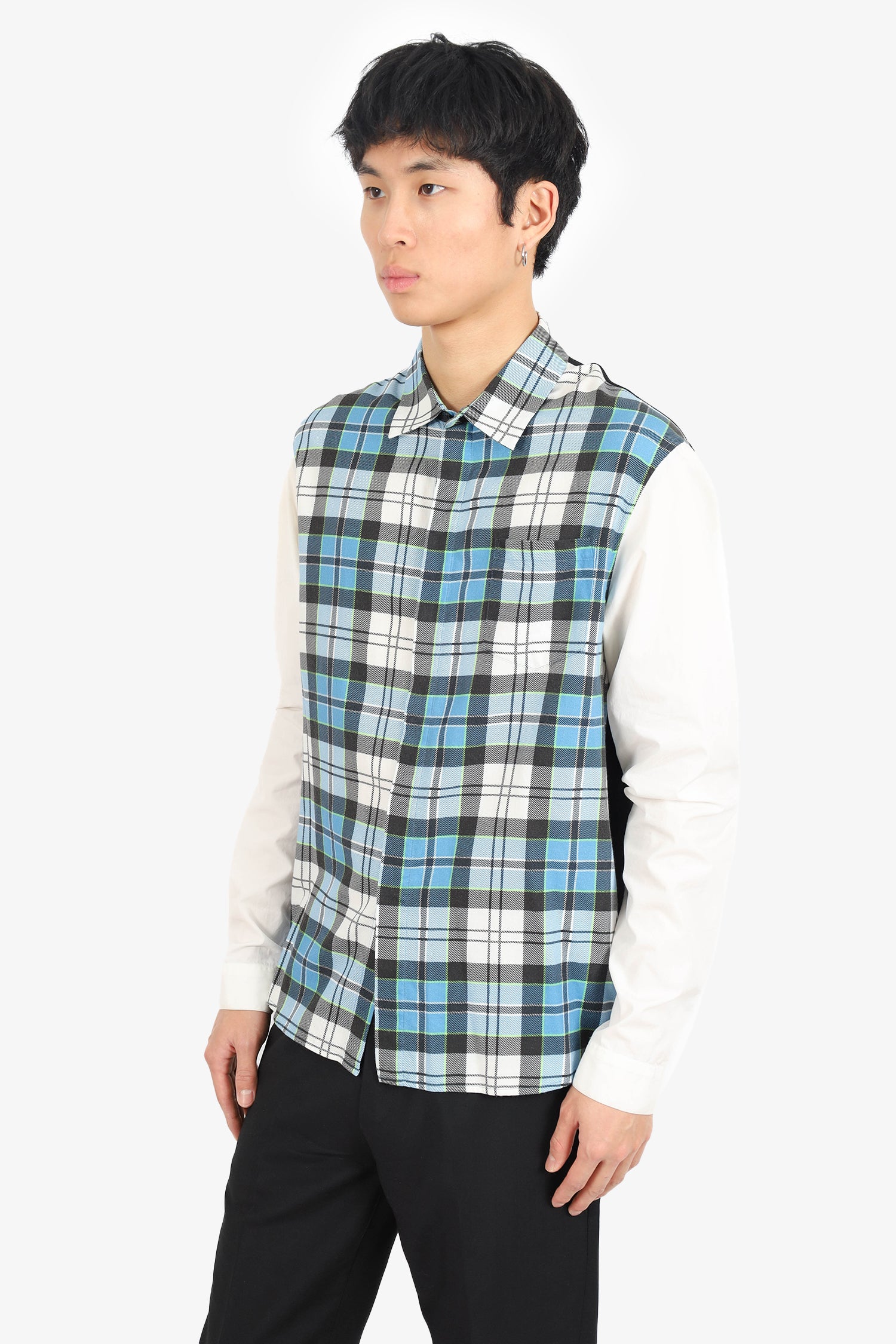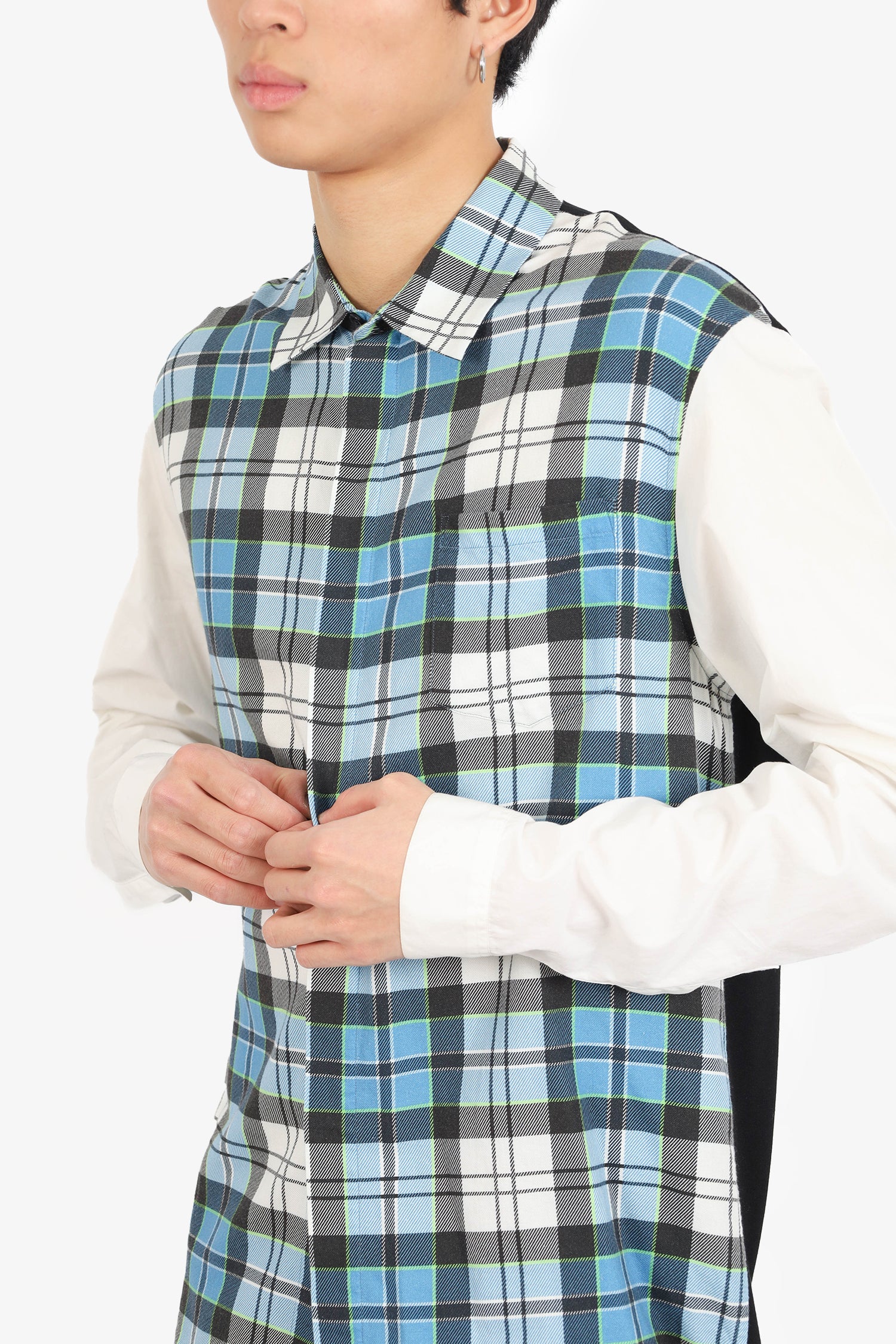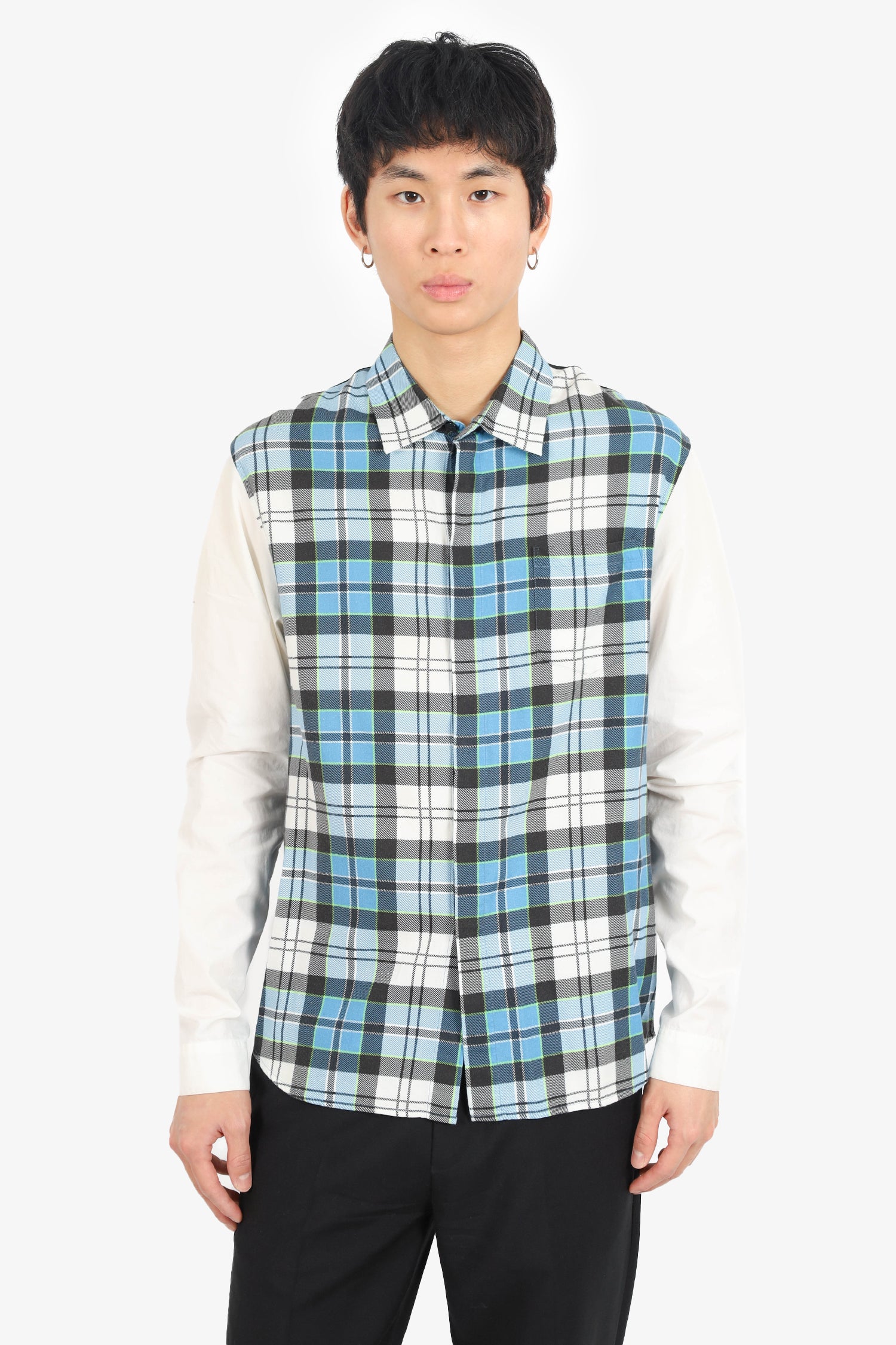 Refresh availabilityJ.W. Anderson Green/White Plaid Long Sleeve Shirt. Collared neckline. Front and cuff button-up closure. High-low bottom hem. Unlined. Tonal stitching.