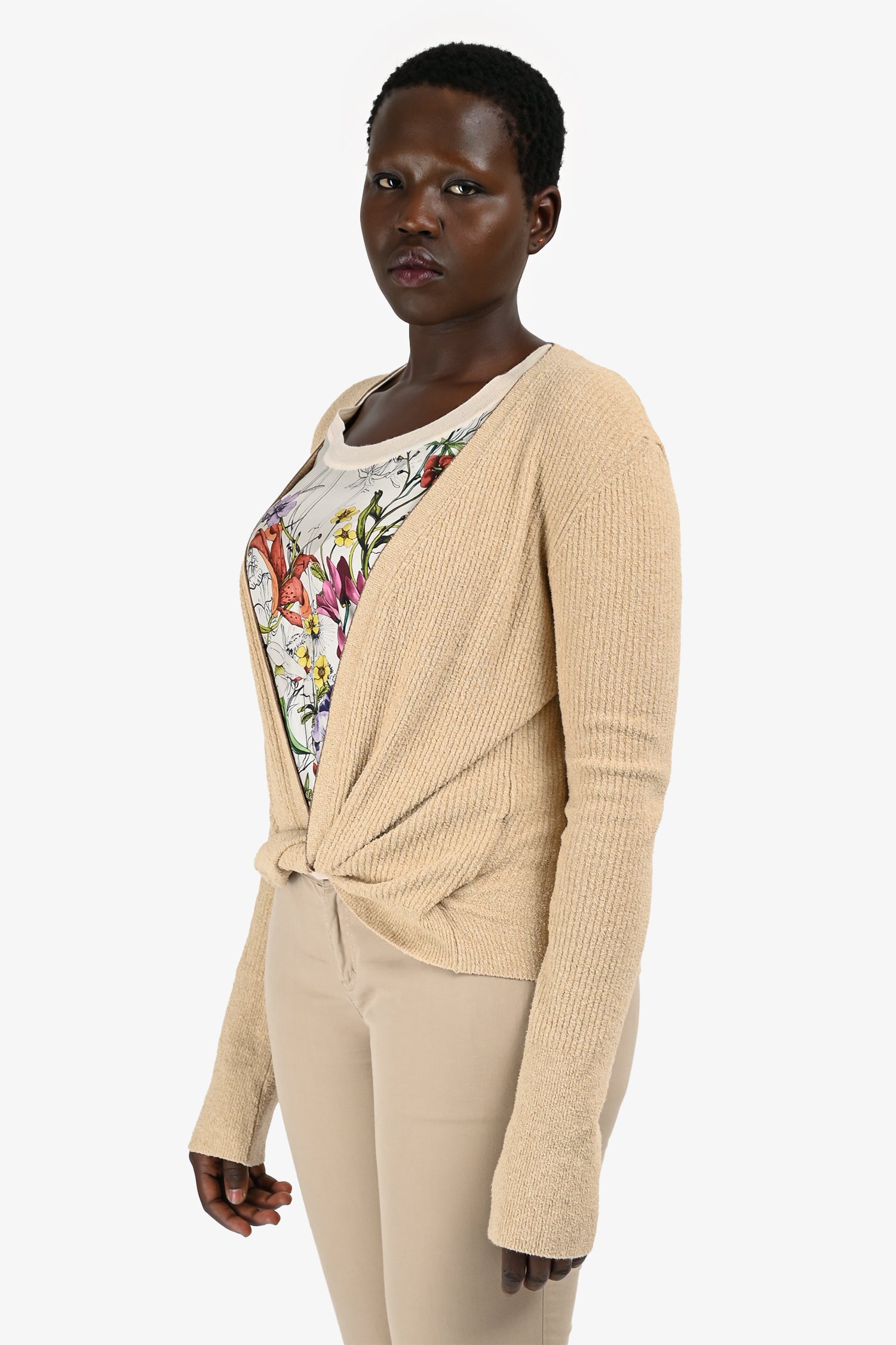 Refresh availabilityJacquemus Beige Cotton Blend Knit Open Tied Sweater. Brown contrast trim. Ribbed long sleeved. Front waist tie. Tonal stitching.