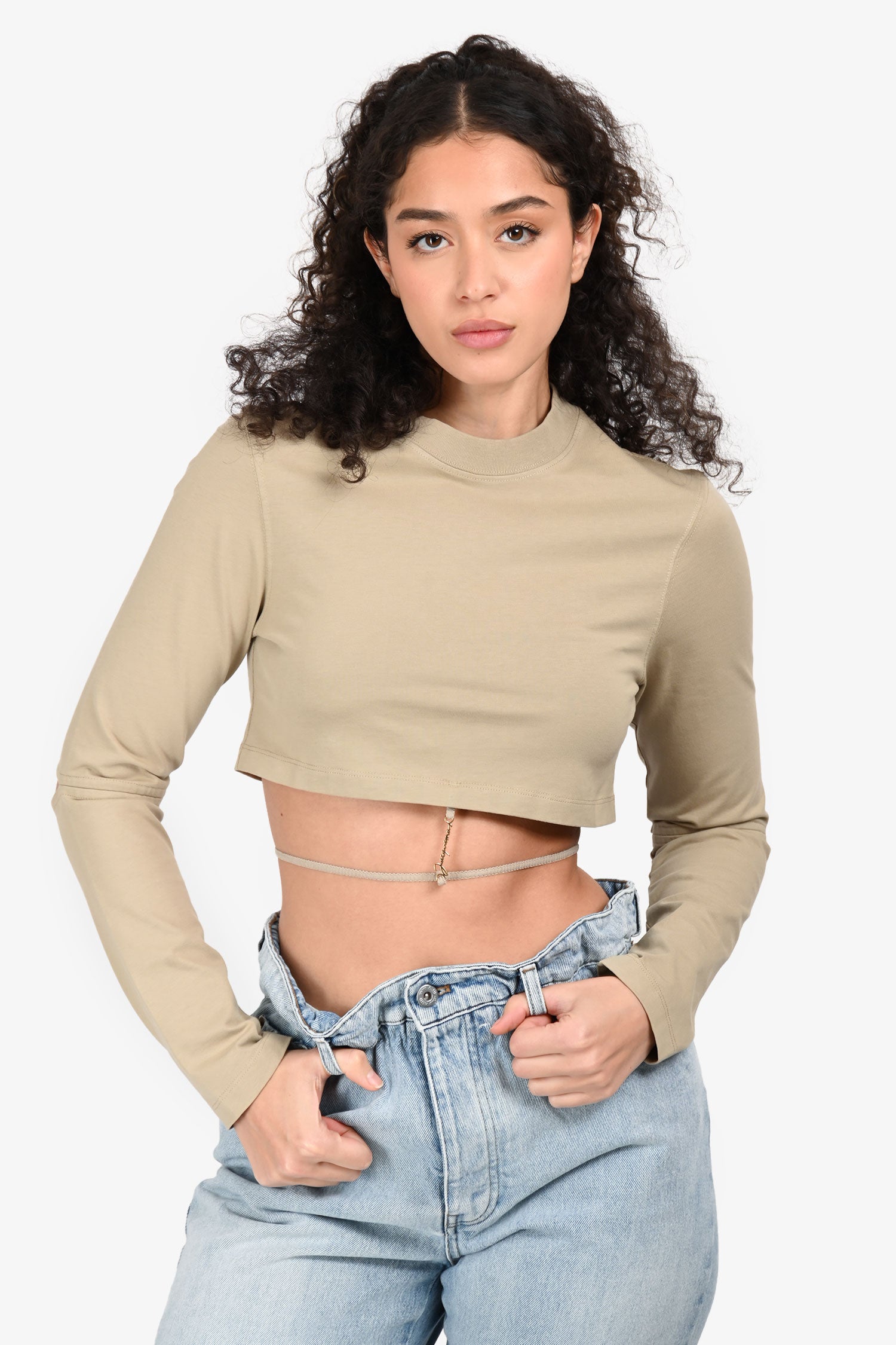 Refresh availabilityJacquemus Beige Logo Strap Cut Out Elbow Crop Top. Slip-on. Crew neckline. Long sleeves with cut-out elbow detailing. Gold-tone hardware. Tonal stitching.