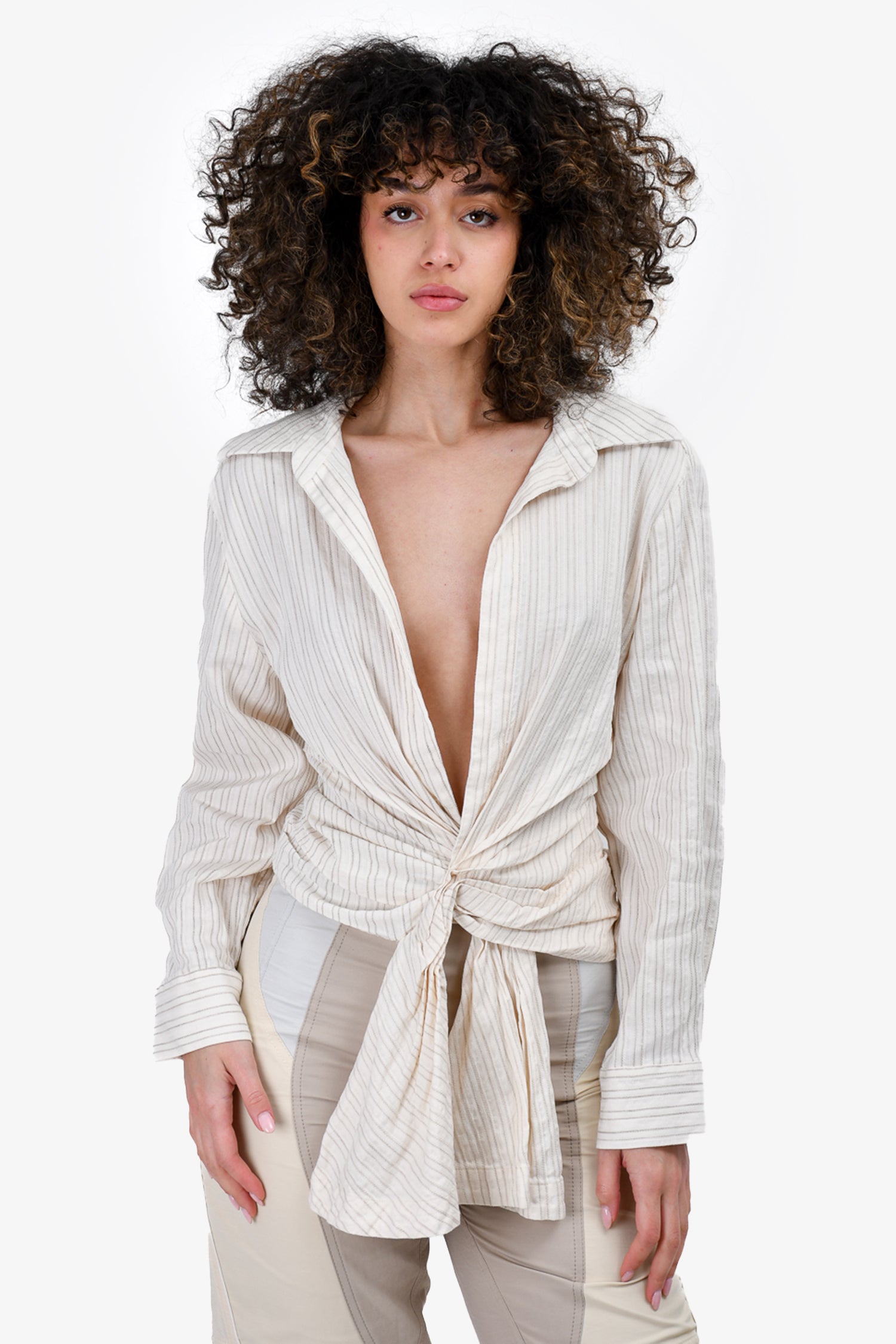 Jacquemus Beige Striped Cotton/Linen 'La Bomba' Tie Front Top Size 40