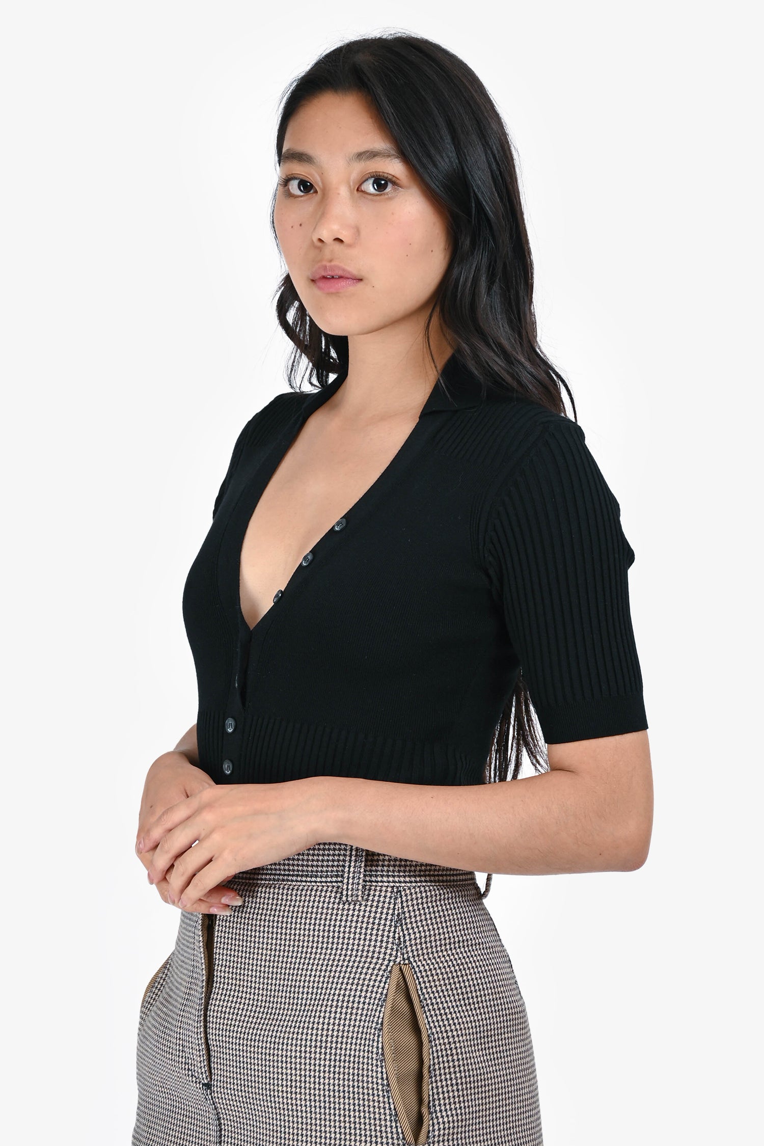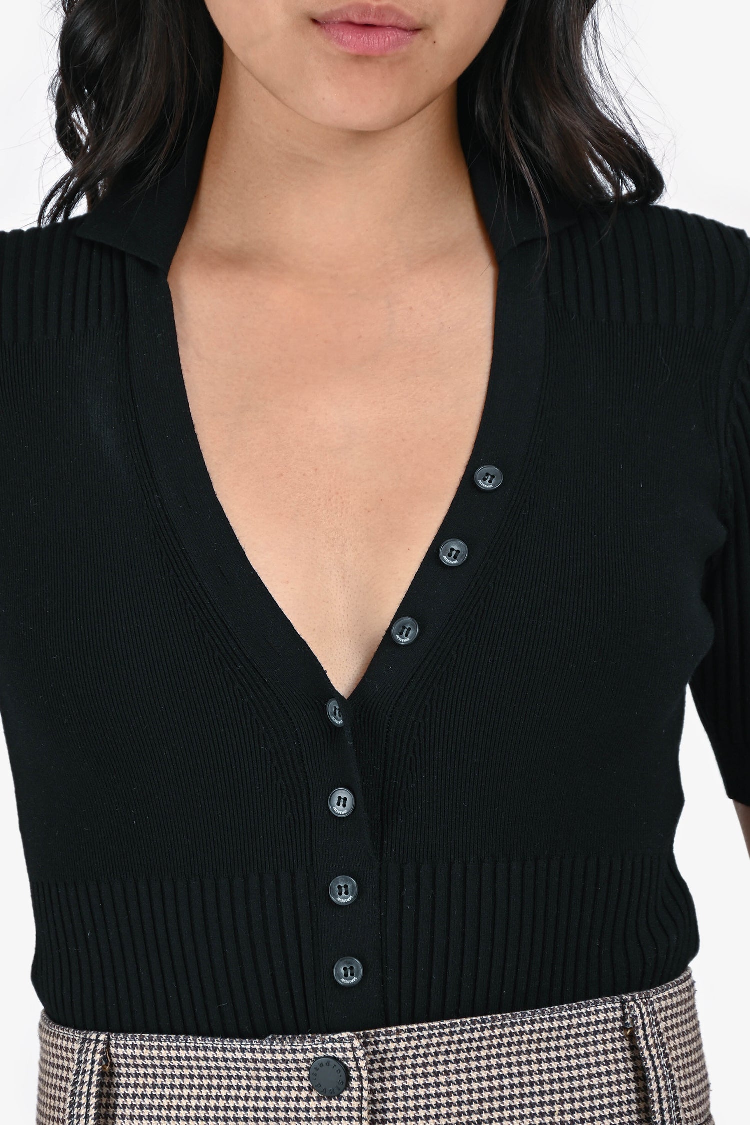 Refresh availabilityJacquemus Black Le Body Yauco Ribbed Knit Short Sleeves Bodysuit. V-neckline. Snap button closure at the base. Fitted silhouette. Tonal stitching.