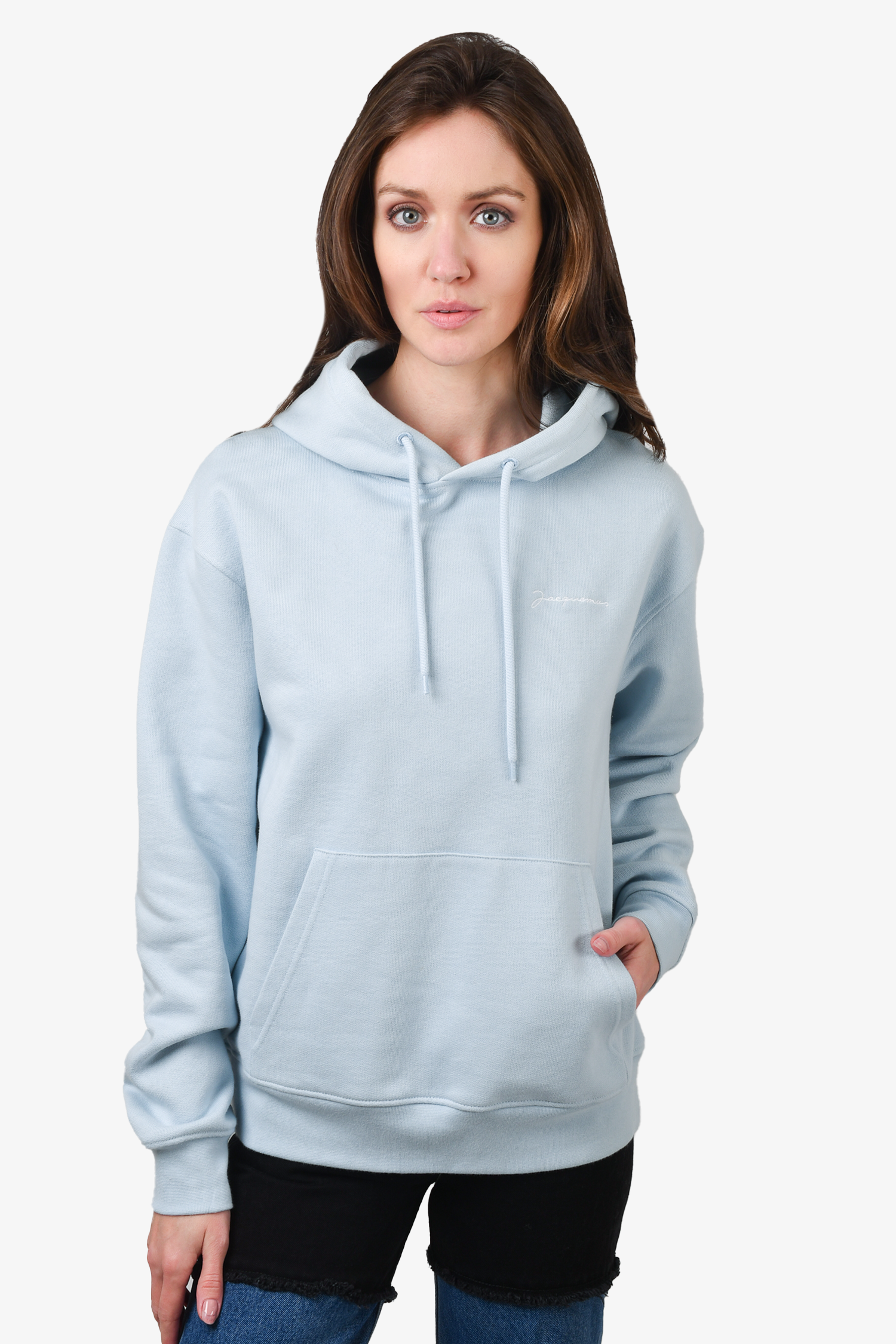 Refresh availabilityJacquemus Blue Embroidered Logo Hooded Sweater. Pull-on. Front pocket. Ribbed cuffs and hem. Tonal stitching.