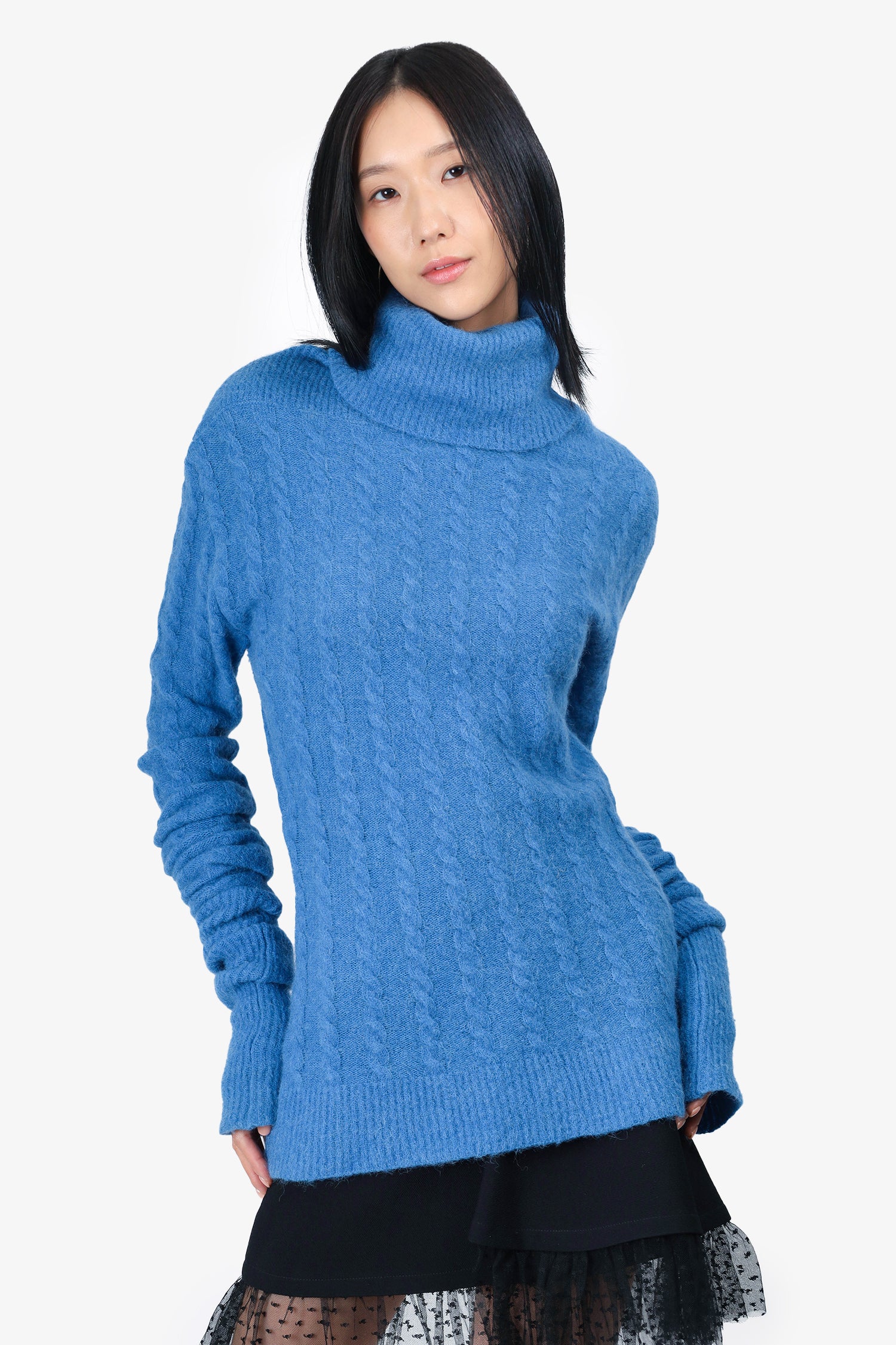Refresh availabilityJacquemus Blue La Maille Sofia Turtleneck Sweater. Fold-over neckline. Pull-on. Ribbed detailing on trimmings. Extra long sleeve detailing. Unlined. Tonal stitching.
