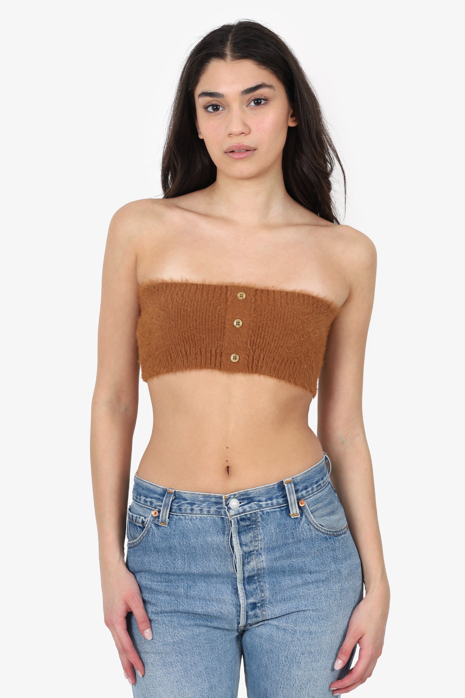 Refresh availabilityJacquemus Brown Knit Bandeau Top. Pull-on. Front button-up detail. Tonal stitching.