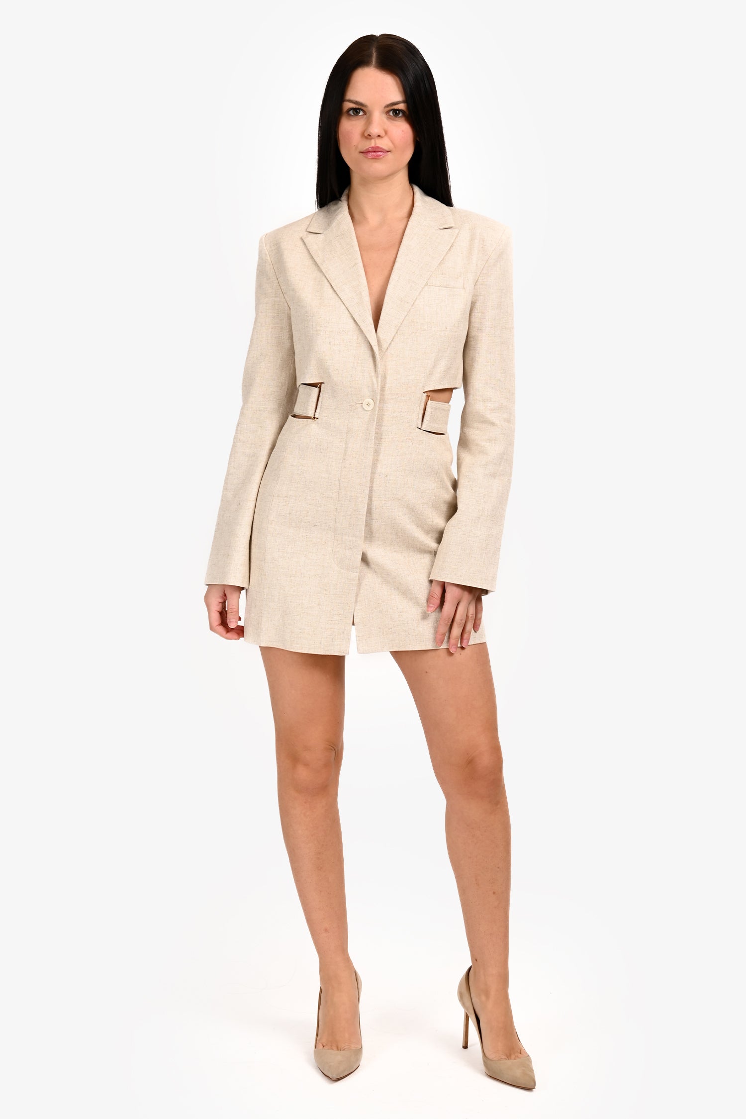 Refresh availabilityJacquemus Brown Linen Cut-Out Belted Blazer Dress. Notched lapel neckline. Single-breasted front button closure. Padded shoulders. Cuffs with button-up closures. Cut-out detailing at the waist with rear button closure. 1 rear welt pockets. Fully lined interior. Gold-tone hardware. Tonal stitching.