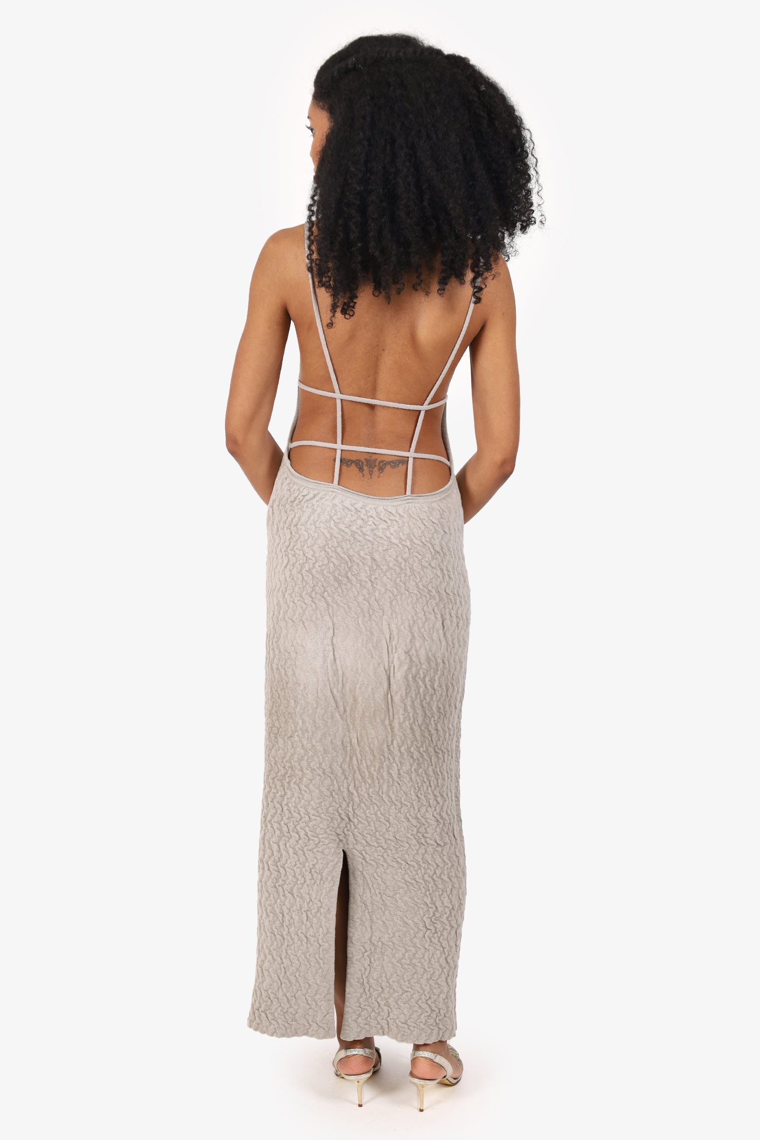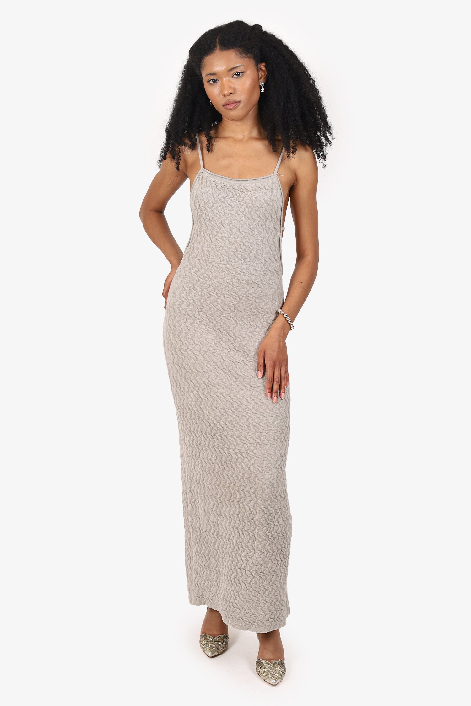 Refresh availabilityJacquemus Grey Textured Knit Midi Low Back Dress. Slip-on. Round-neckline. Rear straps. Single rear vent. Tonal stitching.