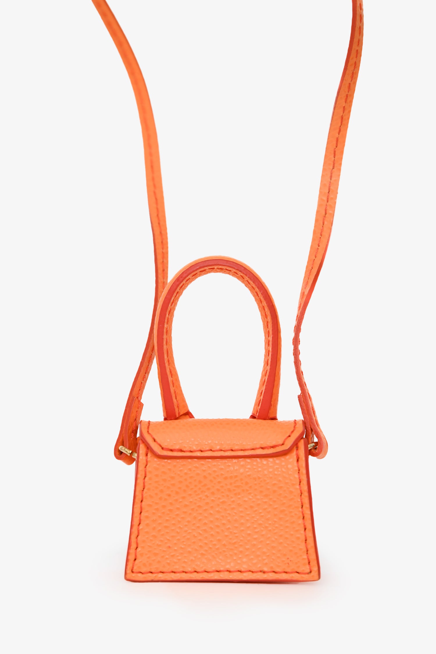 Refresh availabilityJacquemus Orange Leather Micro Le Petit Chiquito Bag. Front fold-over flap with magnetic button closure. Top handle. Attached crossbody strap. Gold-tone hardware. Tonal stitching.