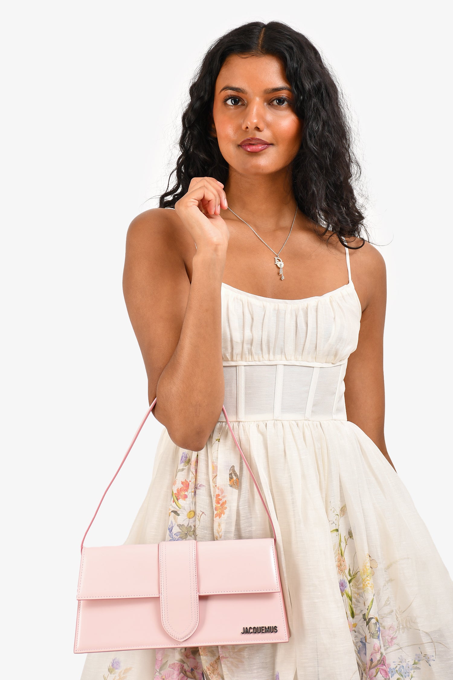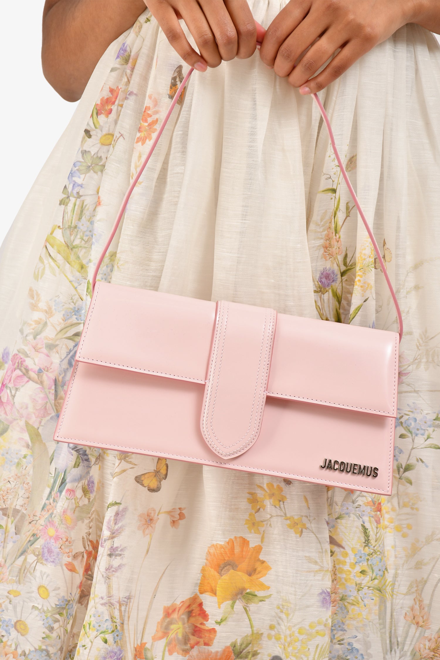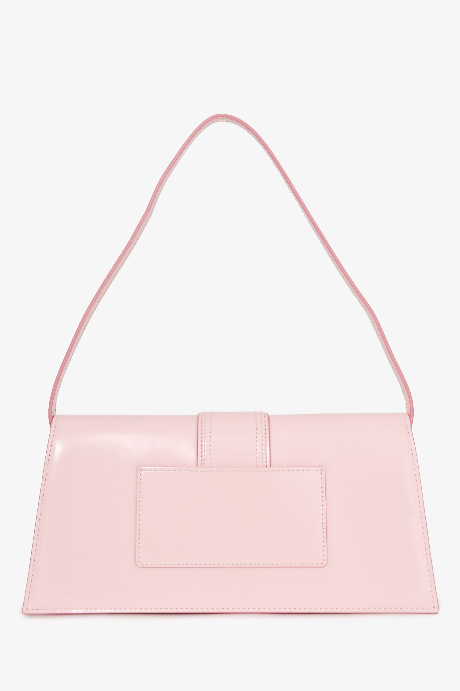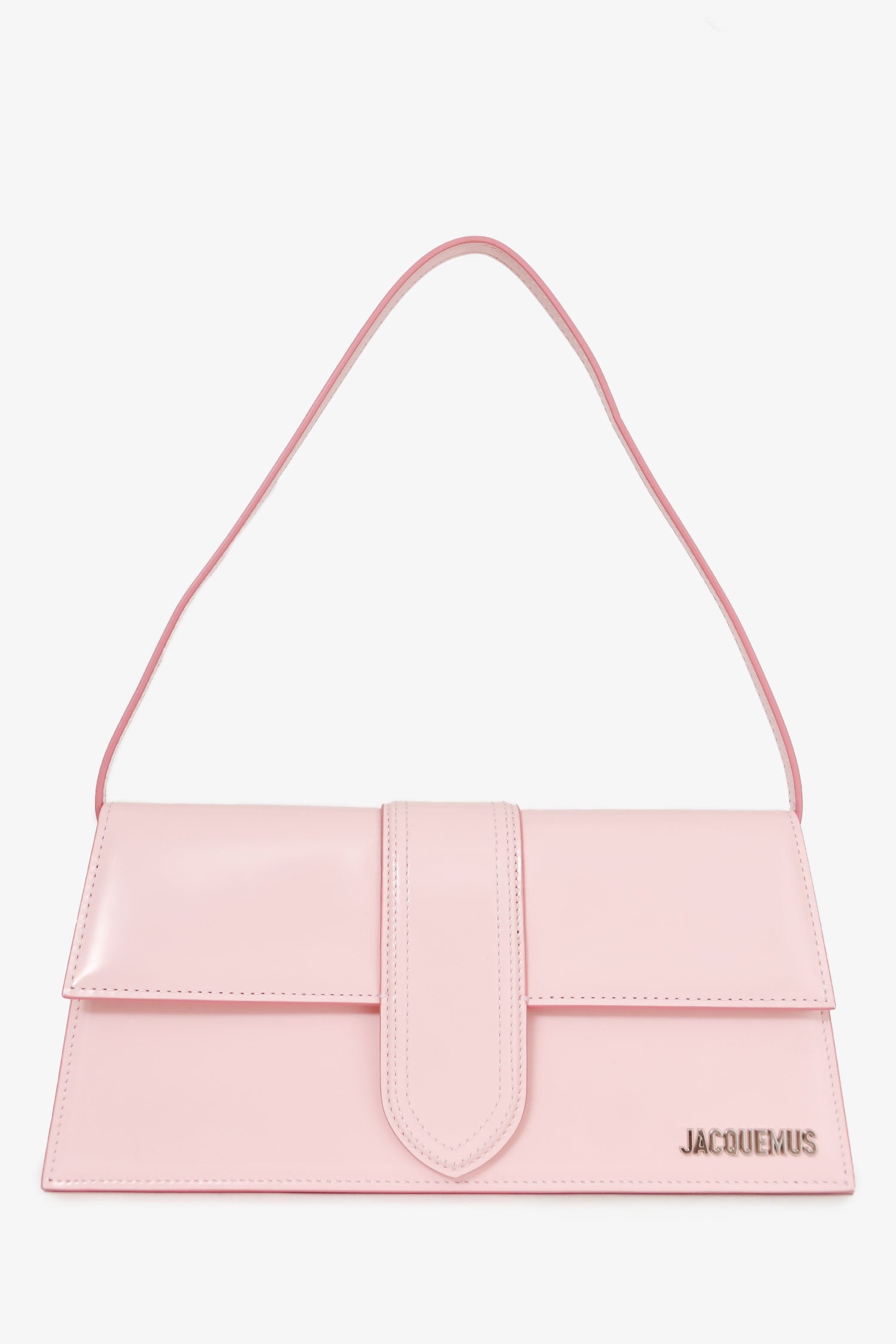 Refresh availabilityJacquemus Pale Pink 'Le Bambino Long' Shoulder Bag. Flap front with magnetic snap closure and silver-tone logo plaque. Top handle. Lined interior with slip pocket. Single exterior back slip pocket. Tonal stitching.