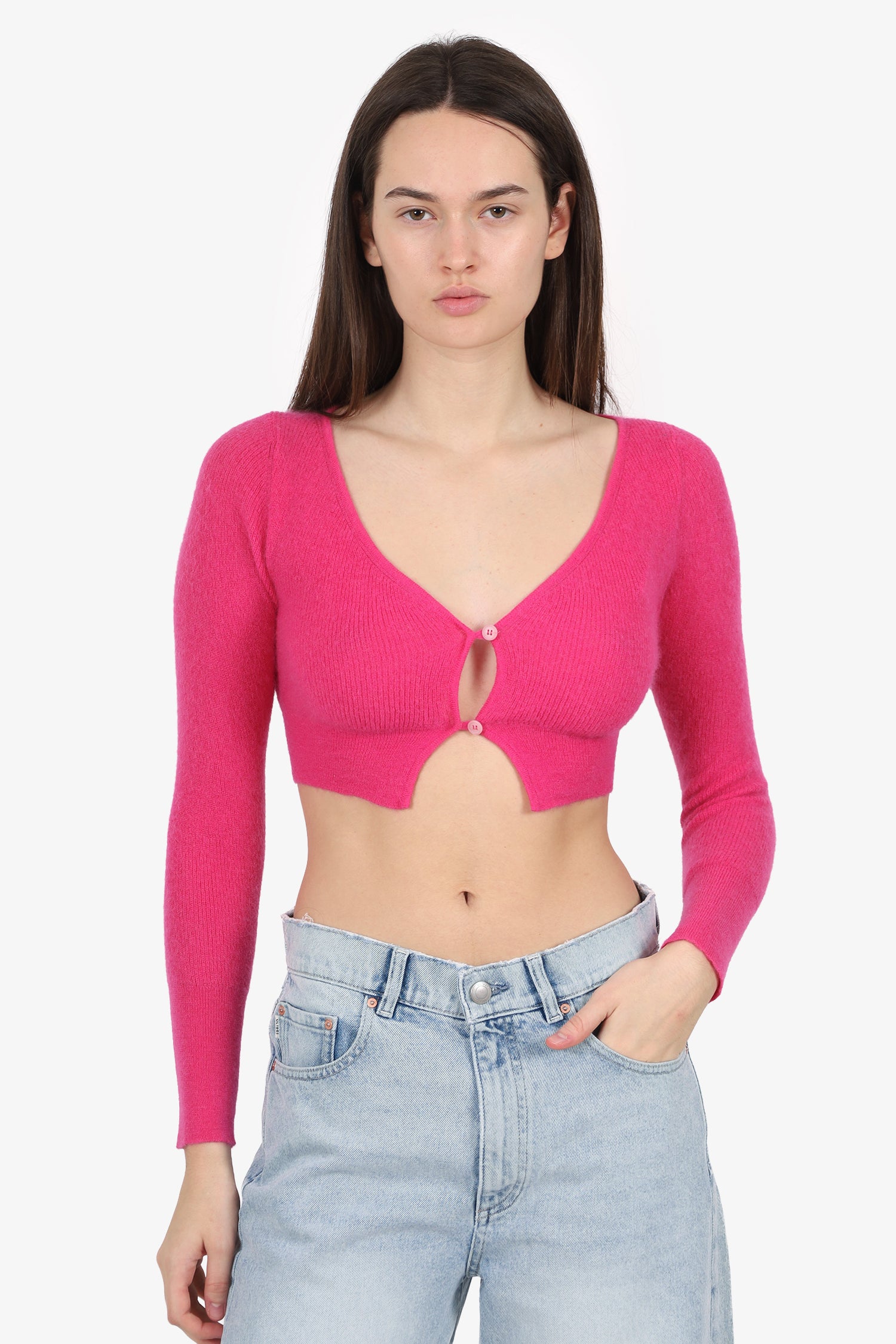 Refresh availabilityJacquemus Pink Mohair Long Sleeve Cropped Cardigan. Pull-on. V-neckline. Front button-up closure. Tonal stitching.
