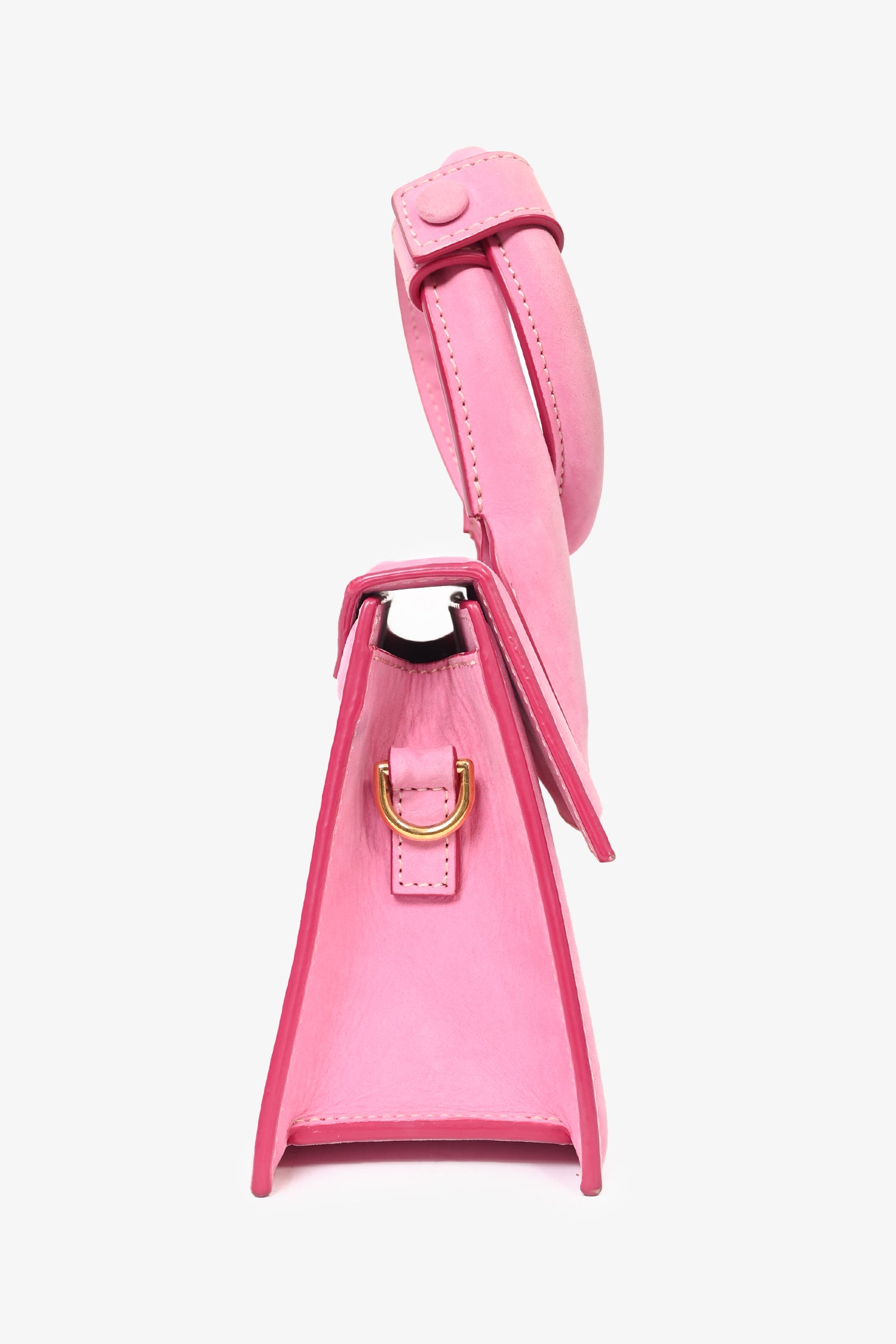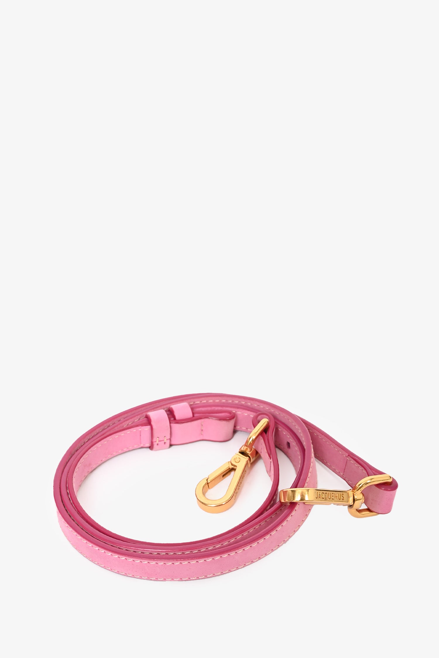 Refresh availabilityJacquemus Pink Suede Le Chiquito Noeud Top Handle with Strap. Fold over flap closure. Gold-tone hardware. 1 interior wall-slip pocket. Removable and adjustable strap. Contrast stitching.