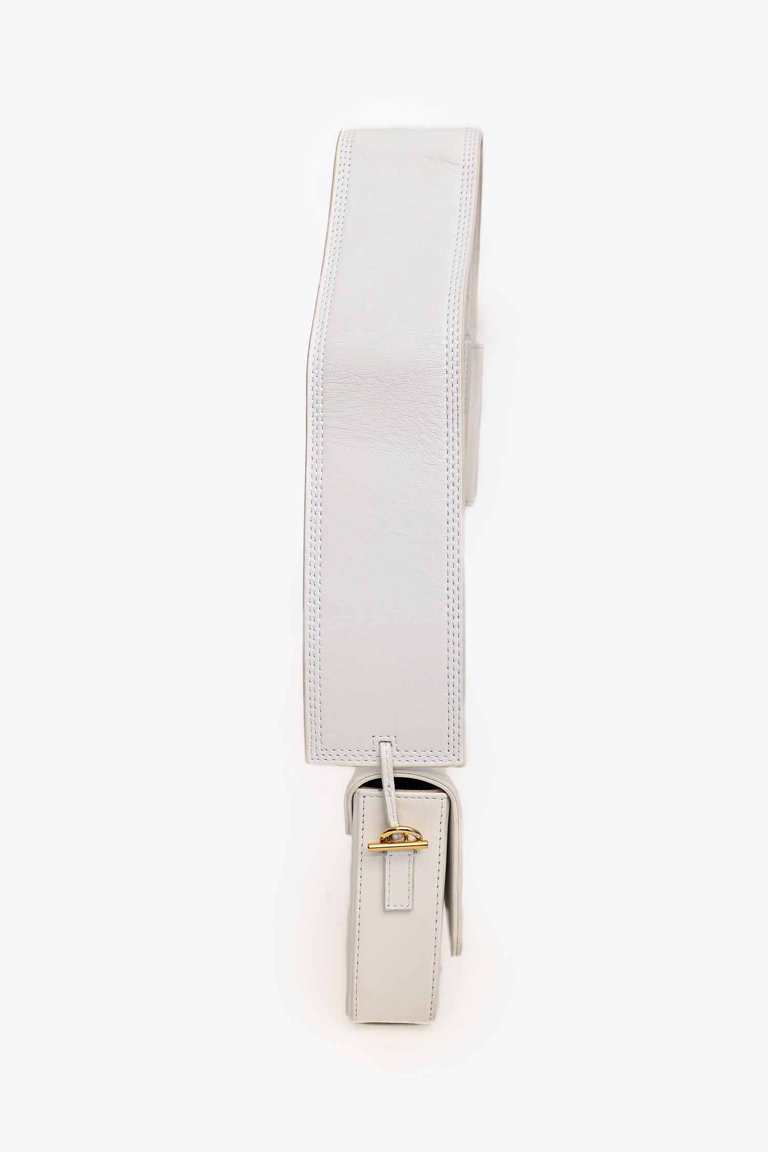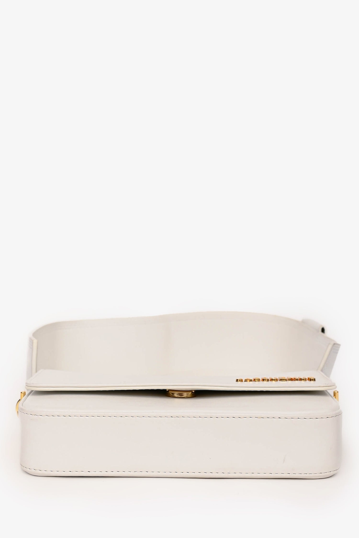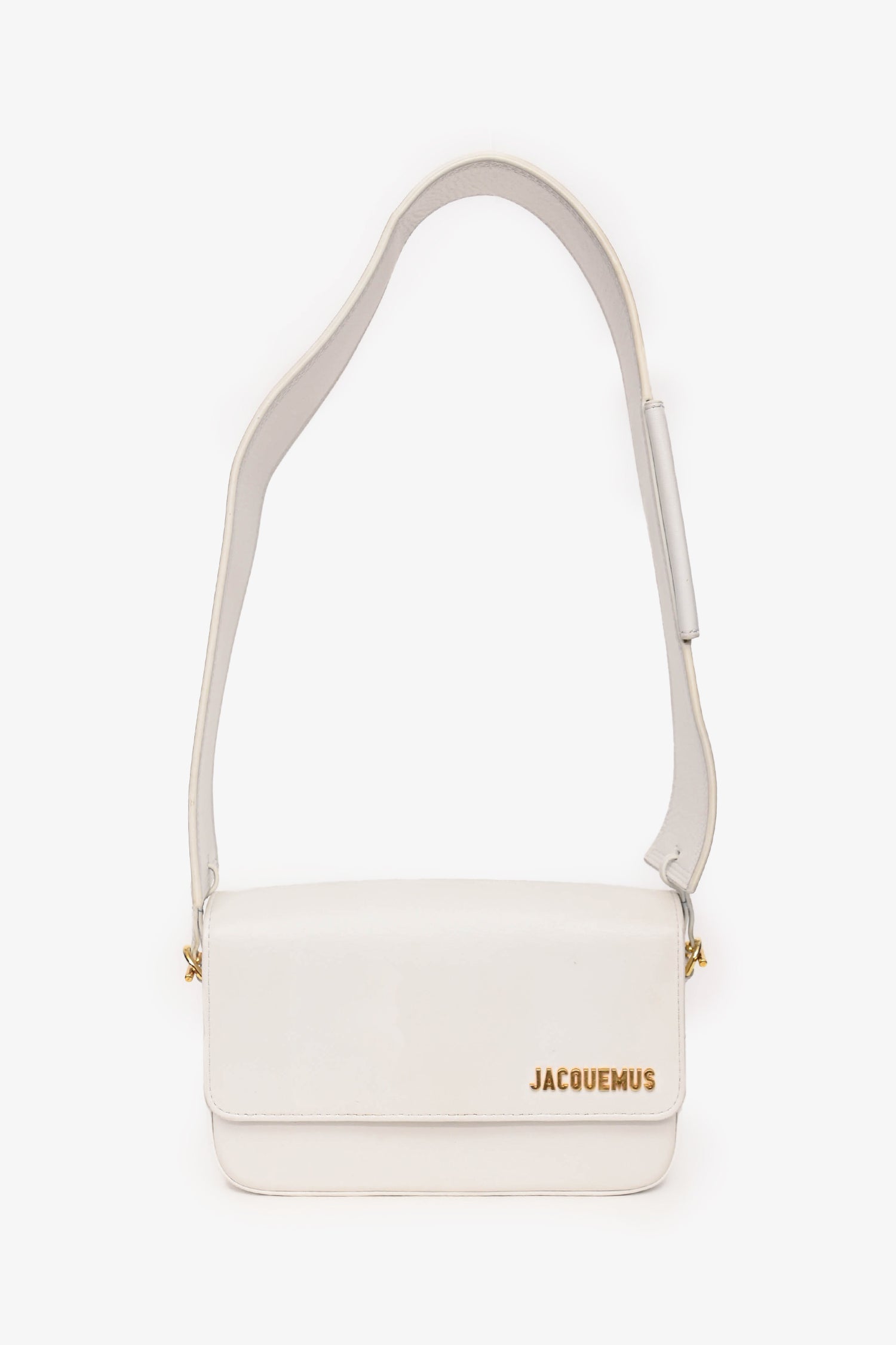 Refresh availabilityJacquemus White Leather 'Le Carinu' Bag. Front fold-over flap with magnetic button closure. Beige textile interior lining. Single interior wall slip pocket. Gold-tone hardware.