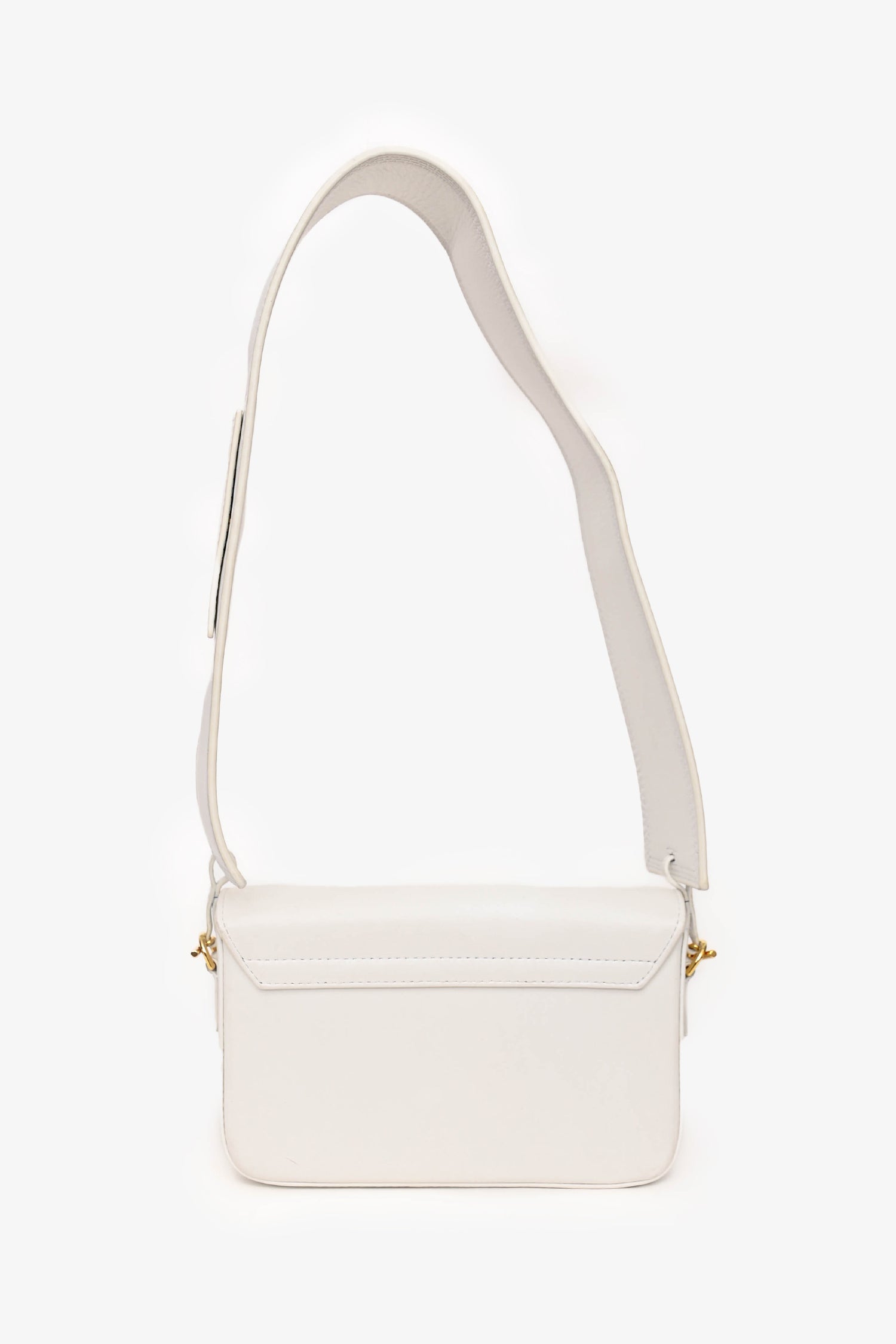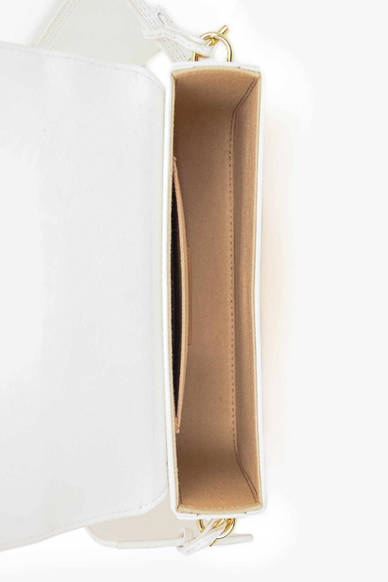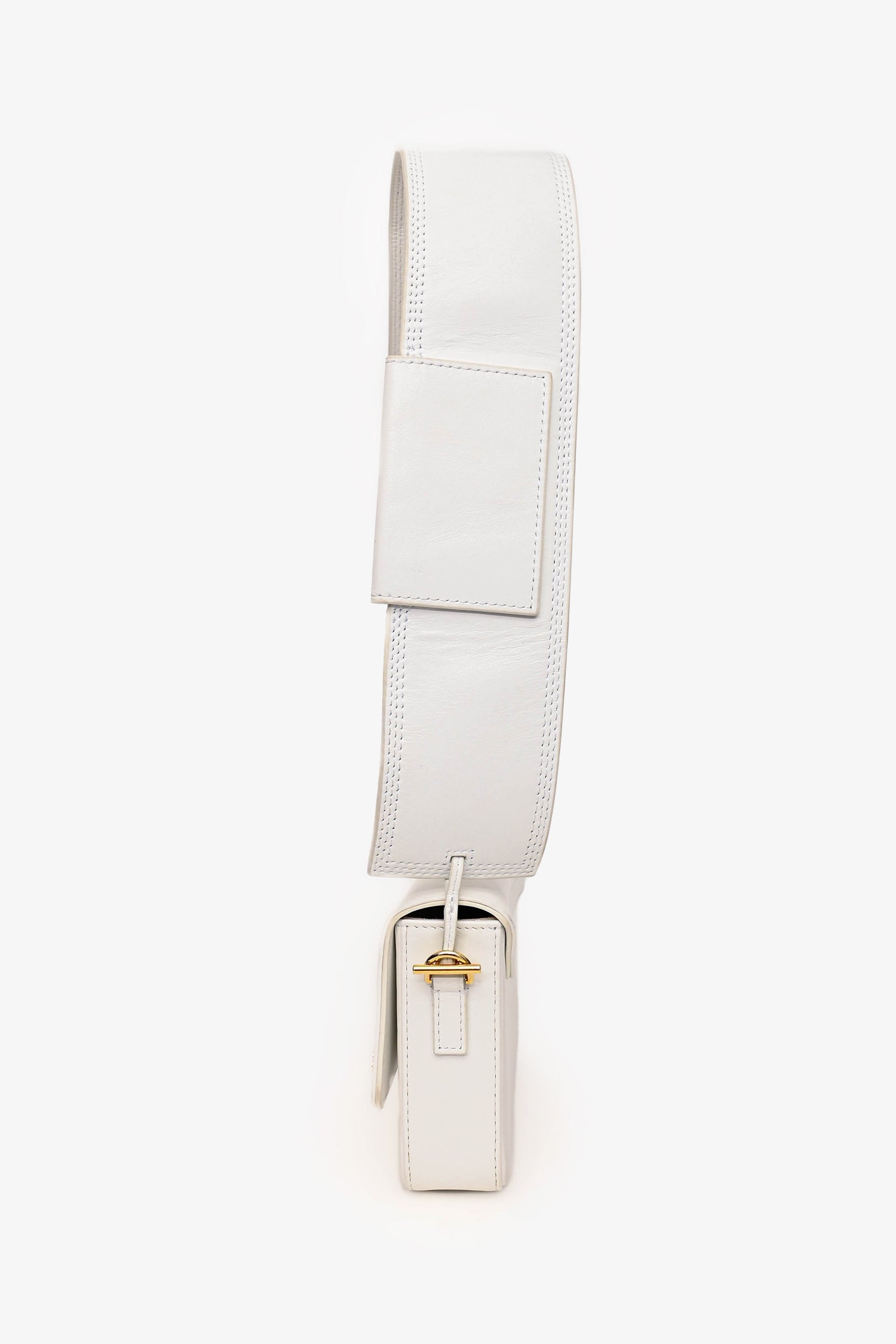 Refresh availabilityJacquemus White Leather 'Le Carinu' Bag. Front fold-over flap with magnetic button closure. Beige textile interior lining. Single interior wall slip pocket. Gold-tone hardware.