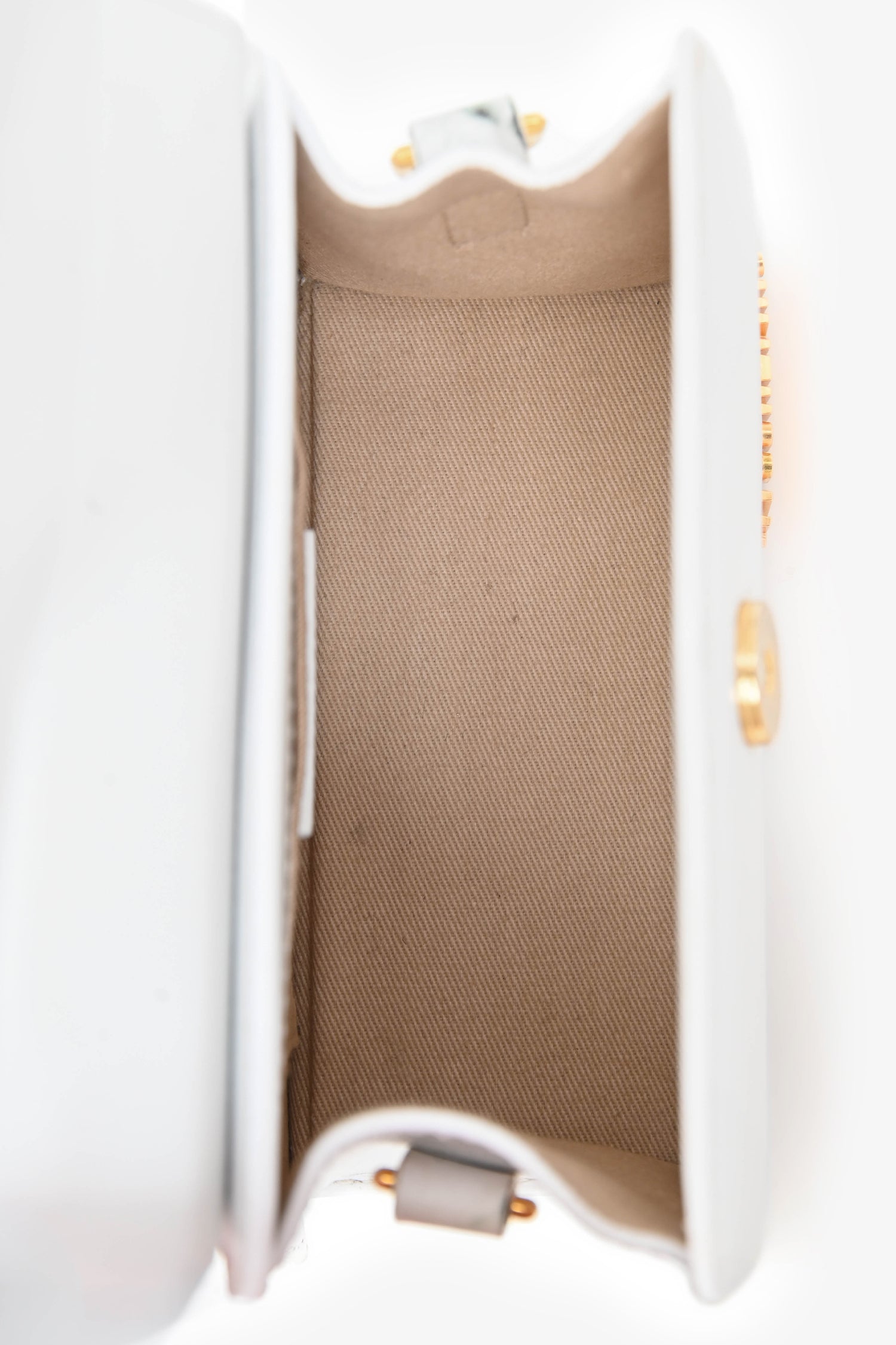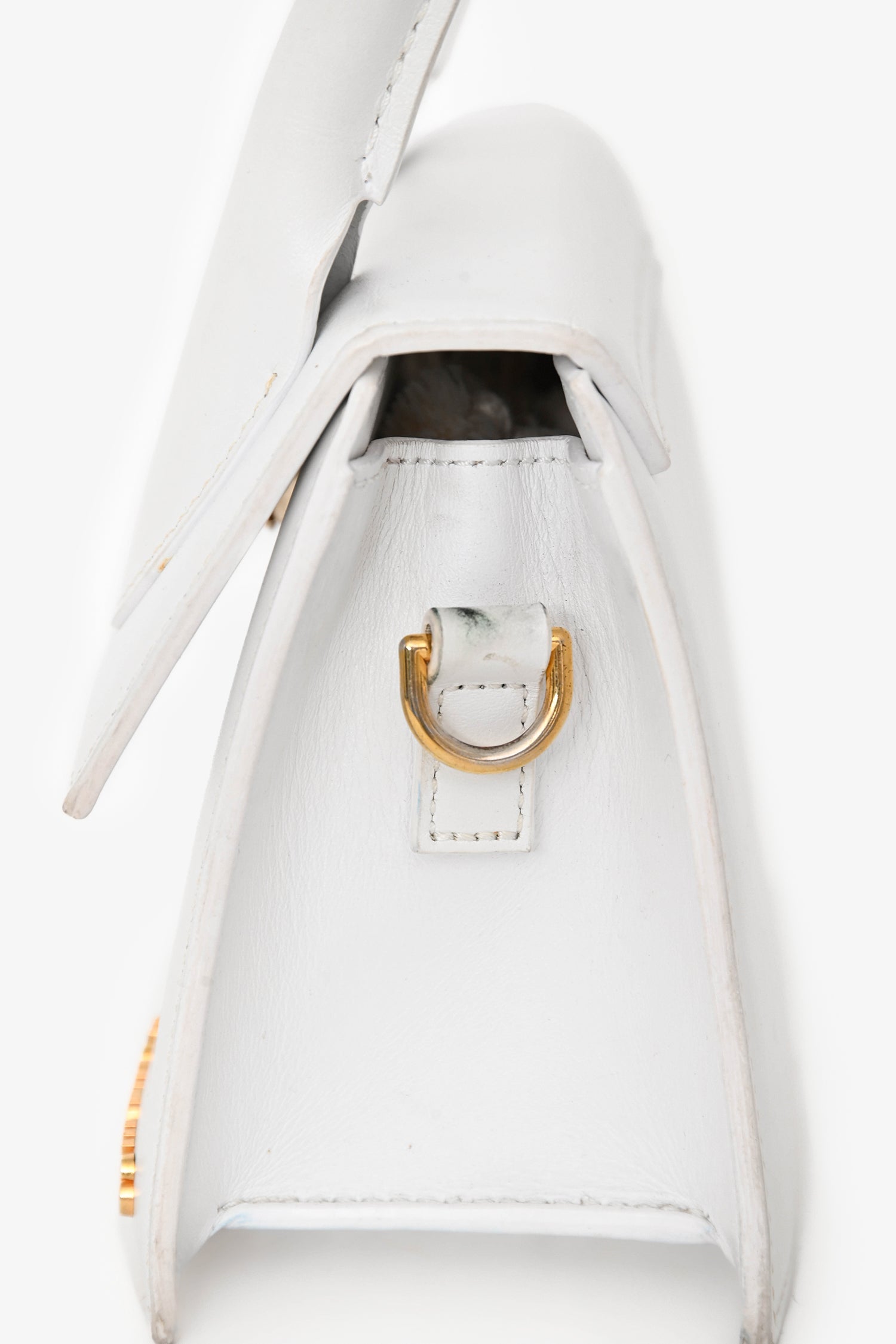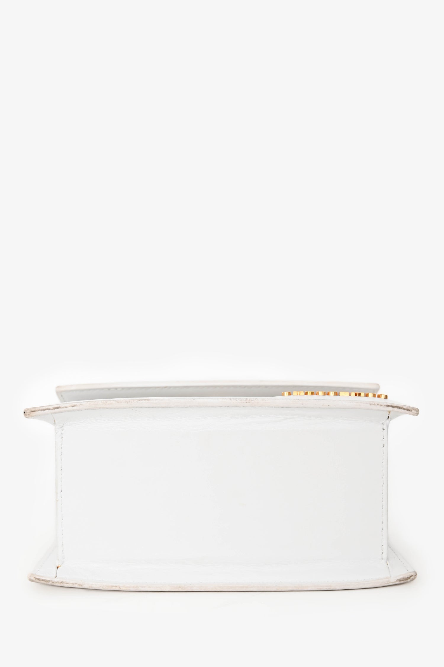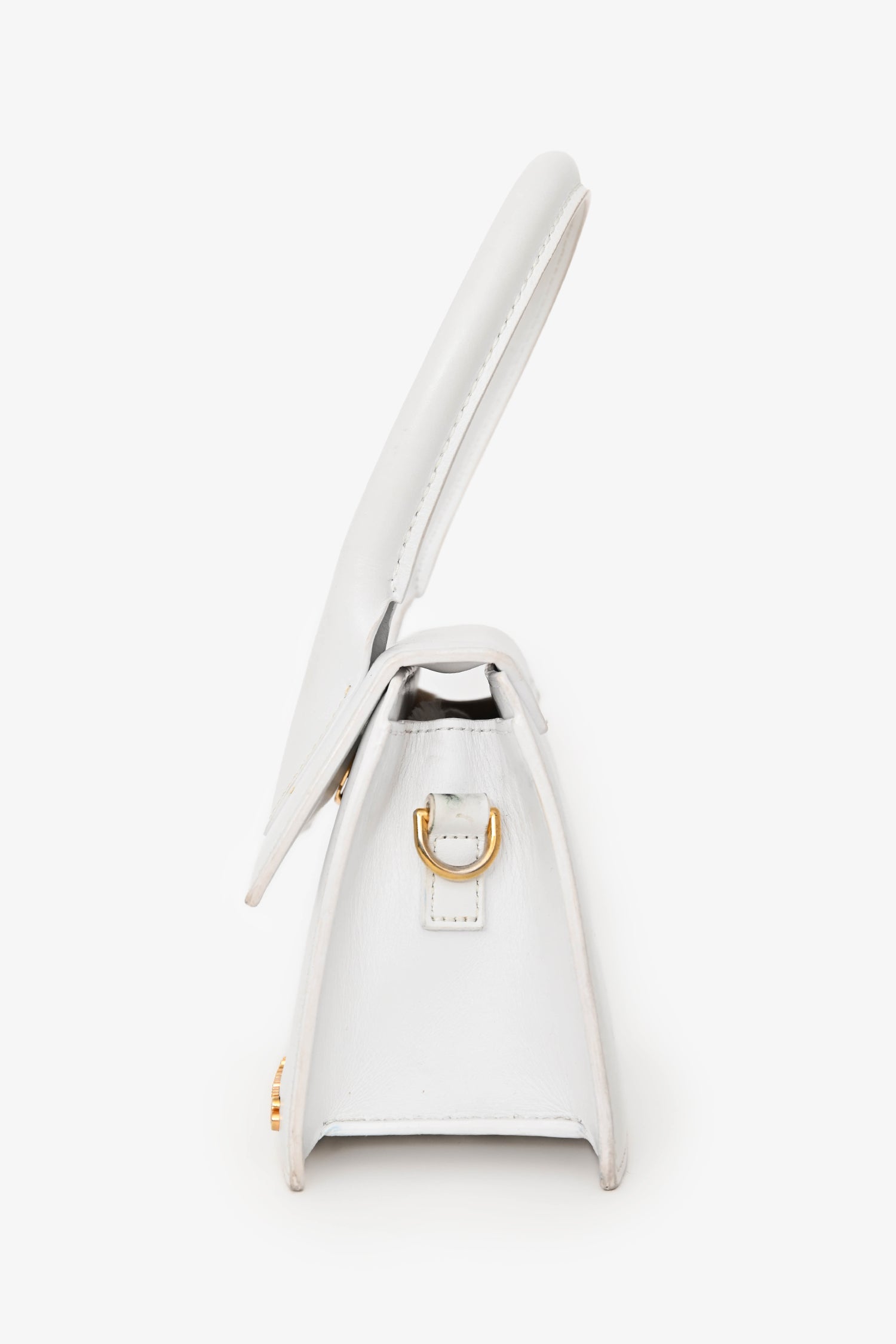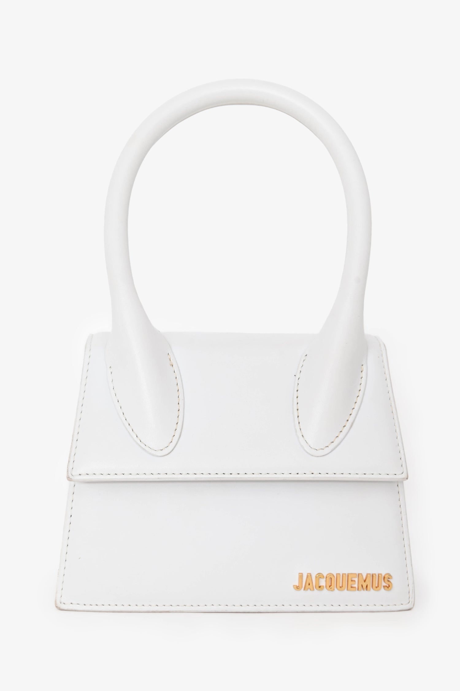 Refresh availabilityJacquemus White Leather 'Le Chiquito Moyen' Top Handle Bag. Fold-over flap with snap closure. Single rolled top handle. Removable crossbody strap. Lined canvas interior with a slip compartment. Gold-tone hardware. Tonal stitching.