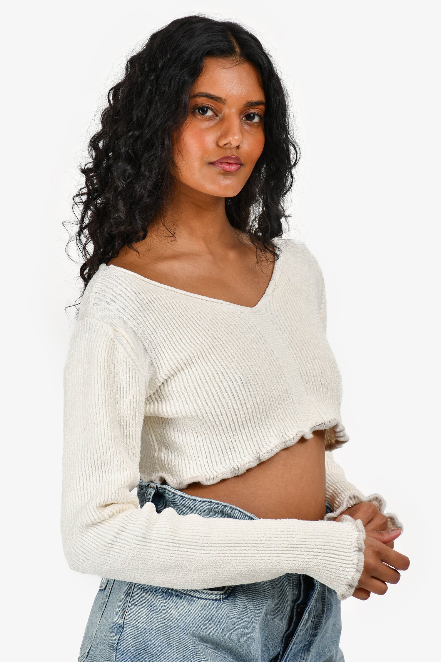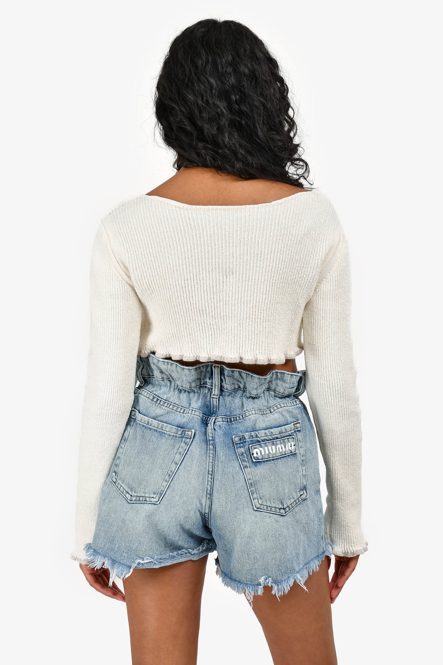 Jacquemus White Linen Ribbed Knit Long Sleeve Cropped Top Size 34