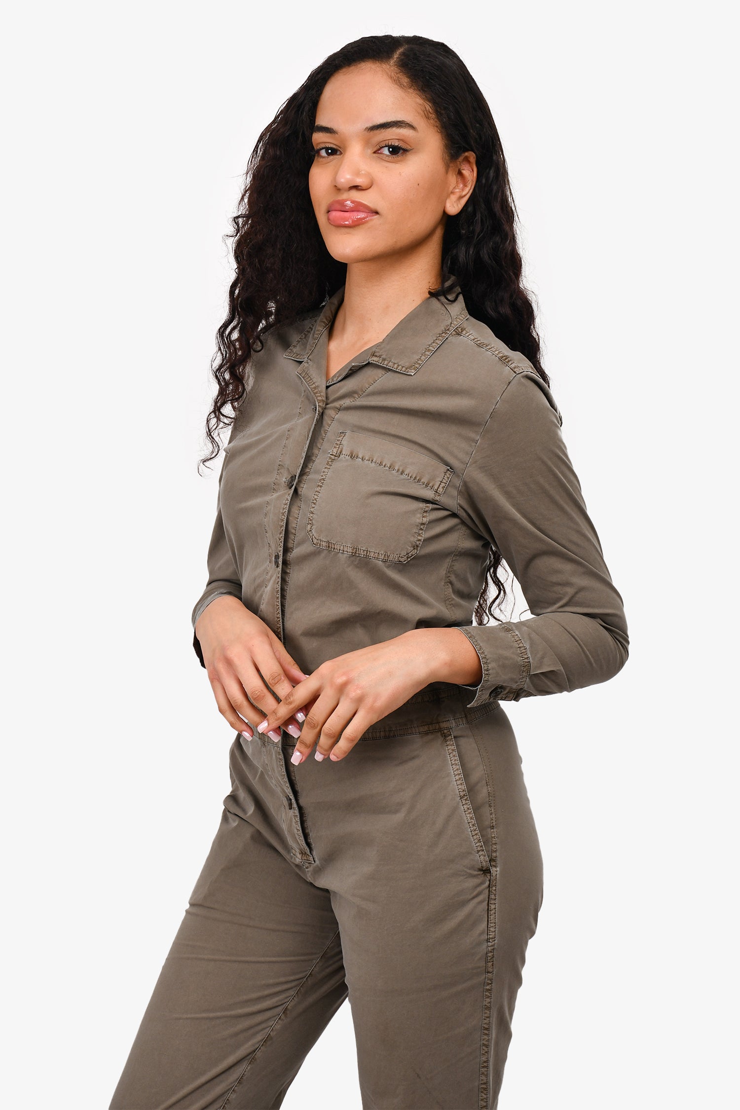 Refresh availabilityJames Perse Olive Green Canvas 'Ranch' Jumpsuit. Button-down closure. Tonal stitching.