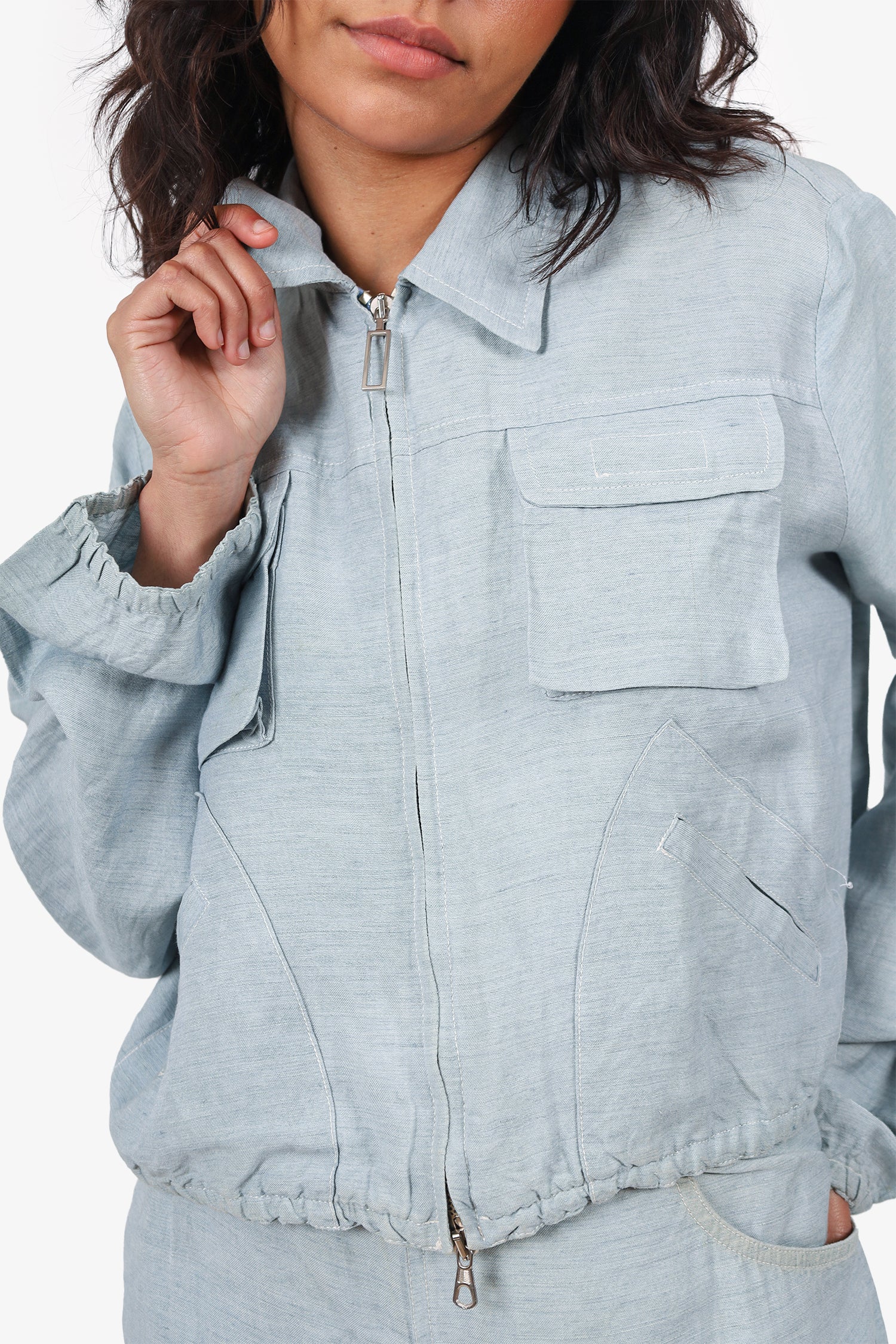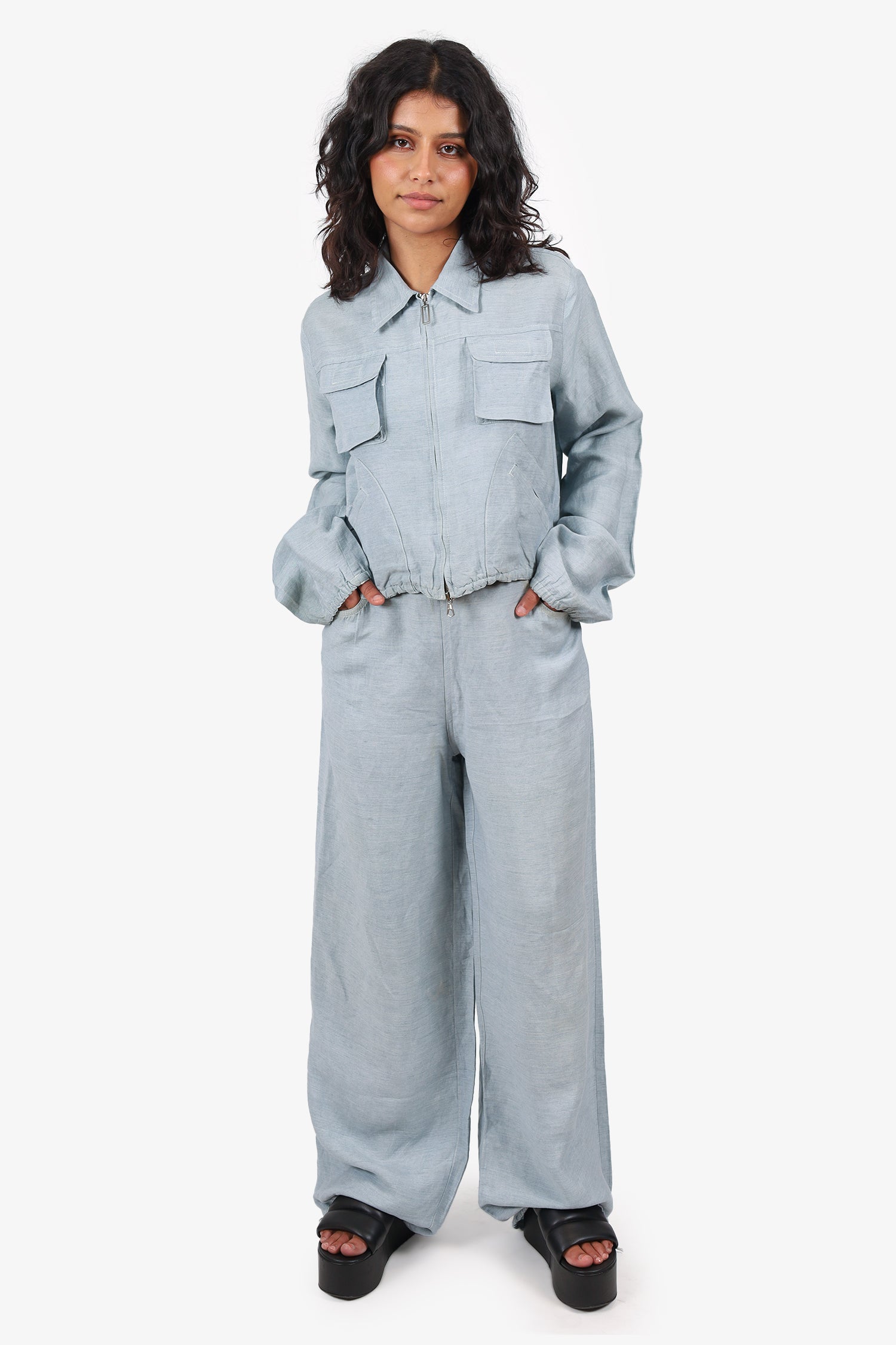 Refresh availabilityJean Paul Gaultier Blue Linen Zip-up Jacket With Wide Leg Pants Set. Jacket: Collared-neckline. Front 2-way zip closure. 4 exterior pockets; 2 side slip and 2 chest flap with velcro closure. Pants: Slip-on. Tie-up closure at ankle cuffs. Silver-tone hardware. Contrast stitching.