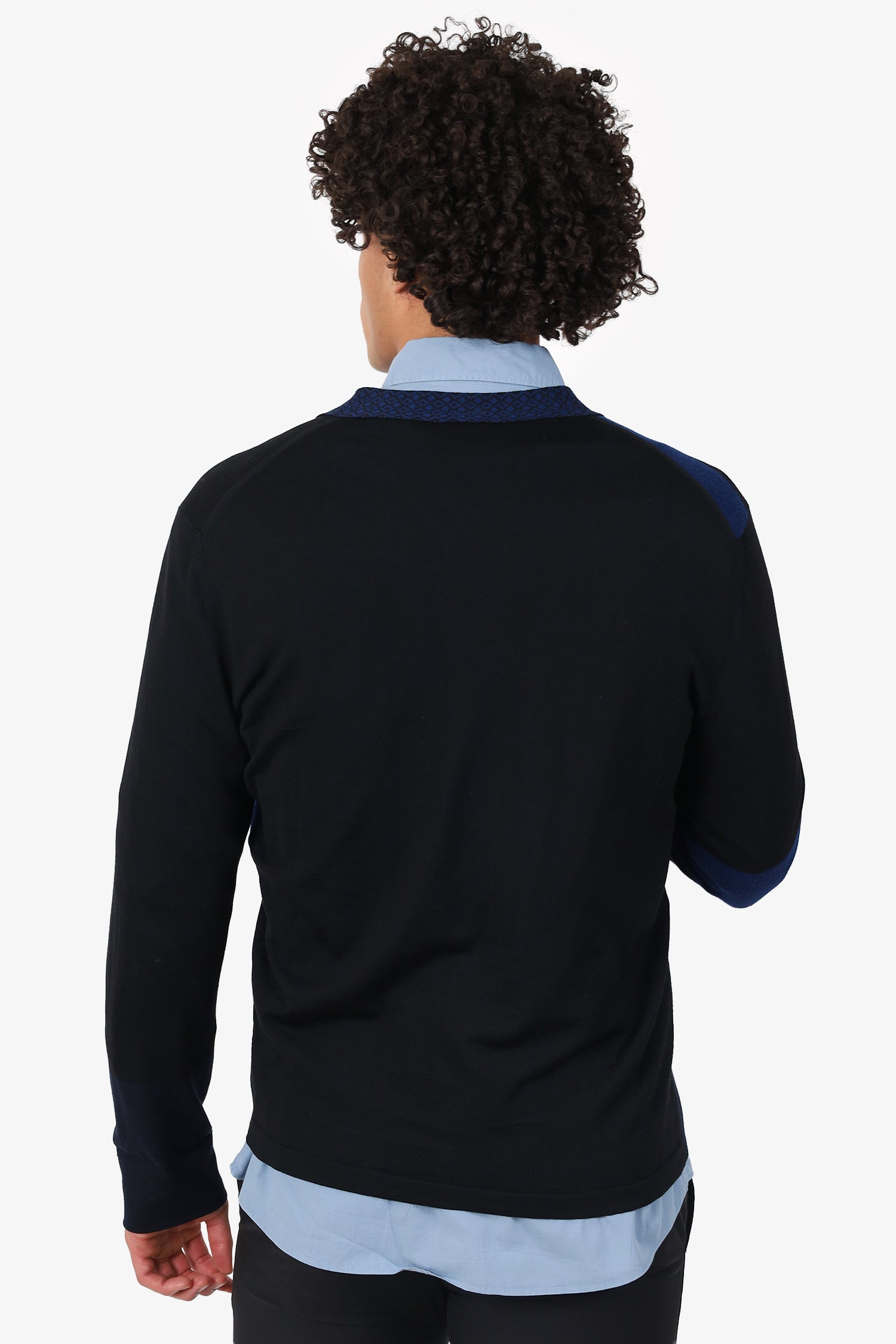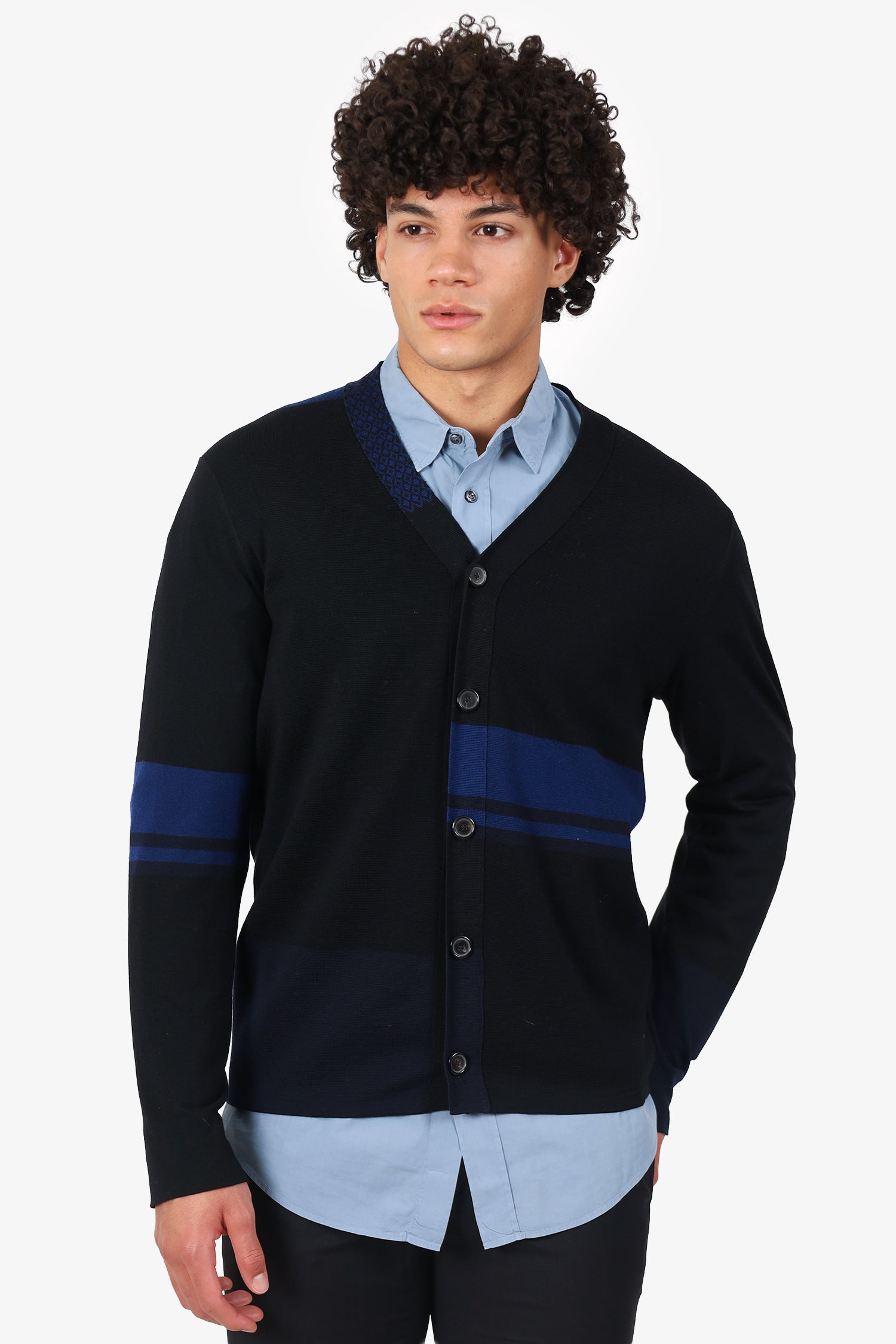 Refresh availabilityJil Sander Black/Blue Wool Striped Cardigan. Pull-on. V-neckline. Front button-up closure. Tonal stitching.