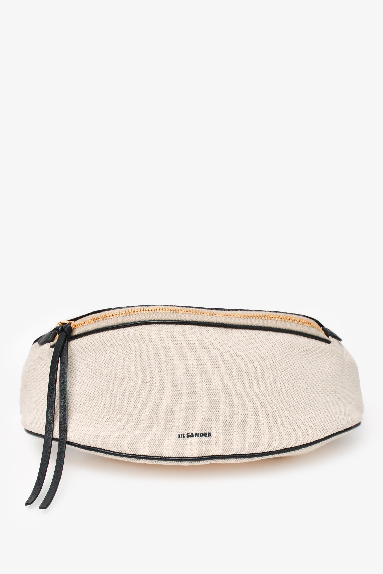 Refresh availabilityJil Sander Cream/Black Canvas/Leather Belt Bag. Front zipper closure. Adjustable strap. Gold-tone hardware. Tonal stitching.