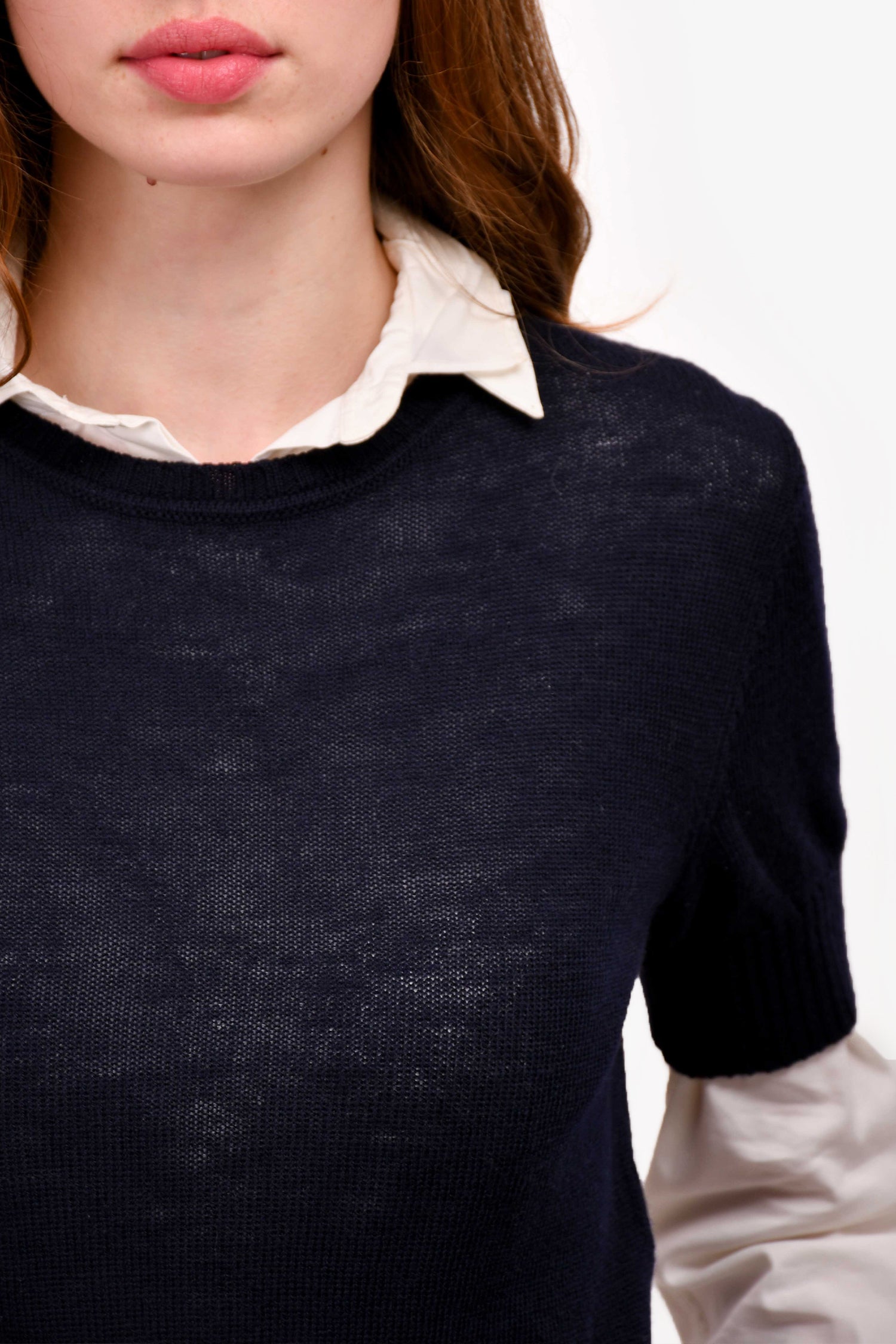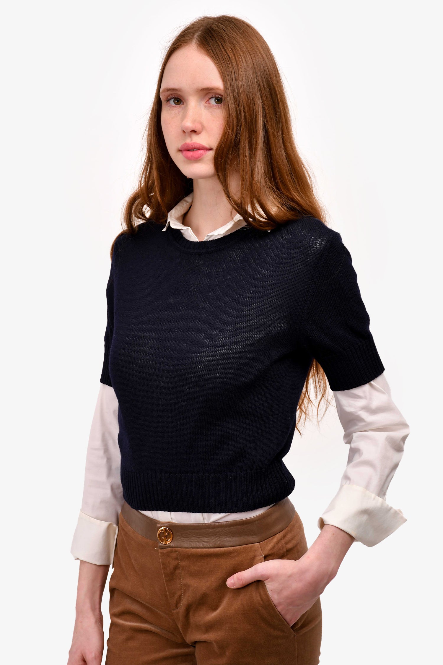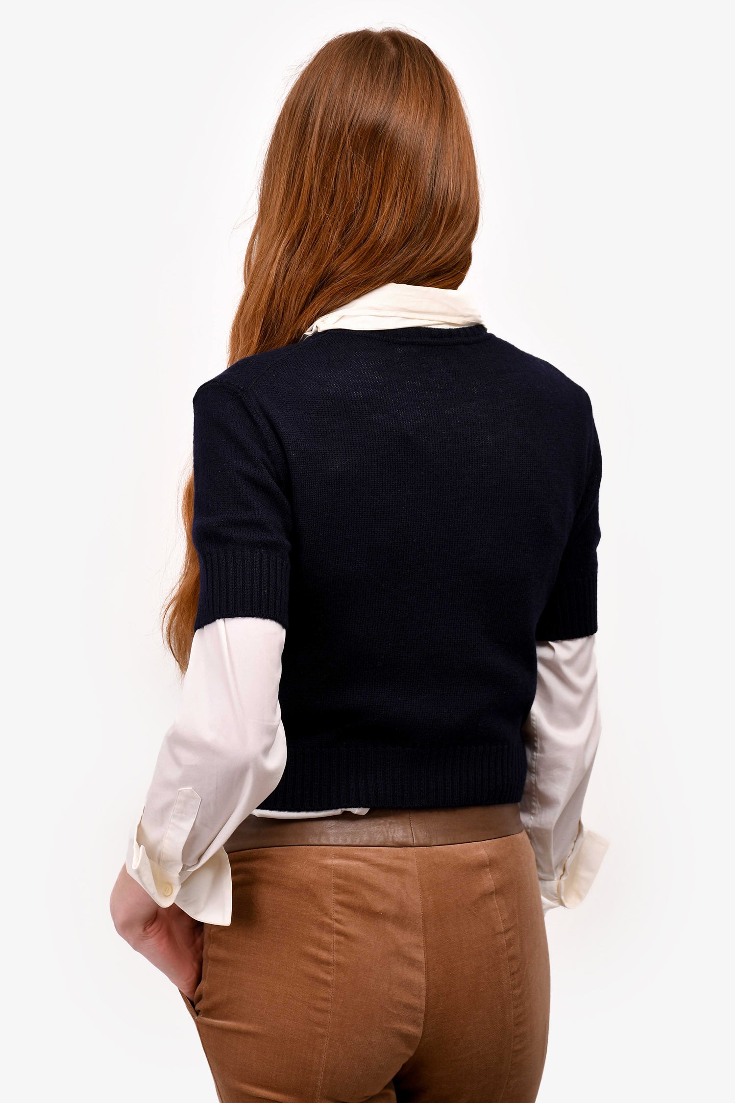 Refresh availabilityJil Sander Navy Blue Virgin Wool Knit Cropped Sweater. Round neck. Short sleeves.
