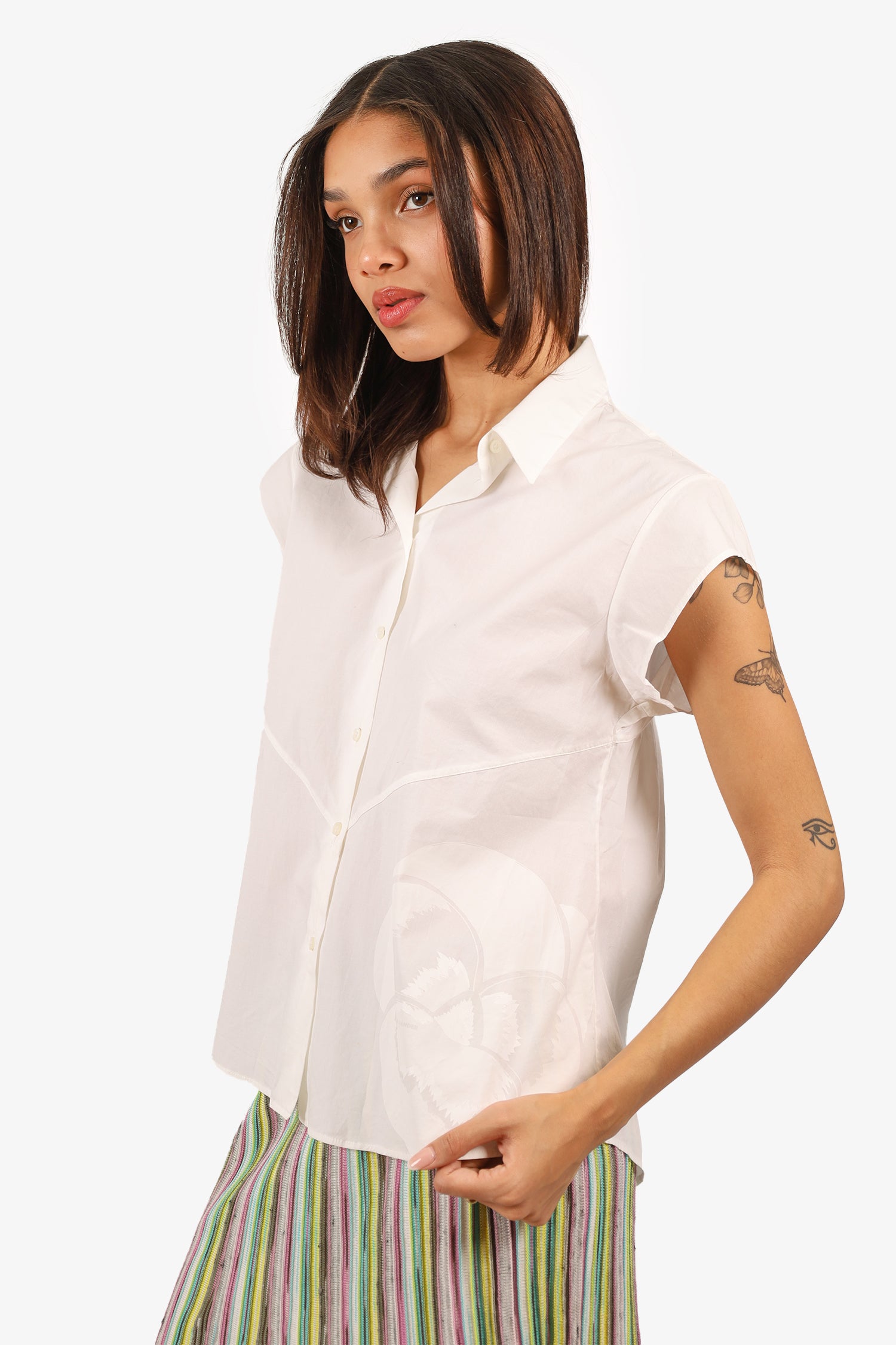 Refresh availabilityJil Sander White Short Sleeve Printed Button Up Blouse. Collared-neckline. Front button-up closure. Logo printed on front bottom left. Tonal stitching.