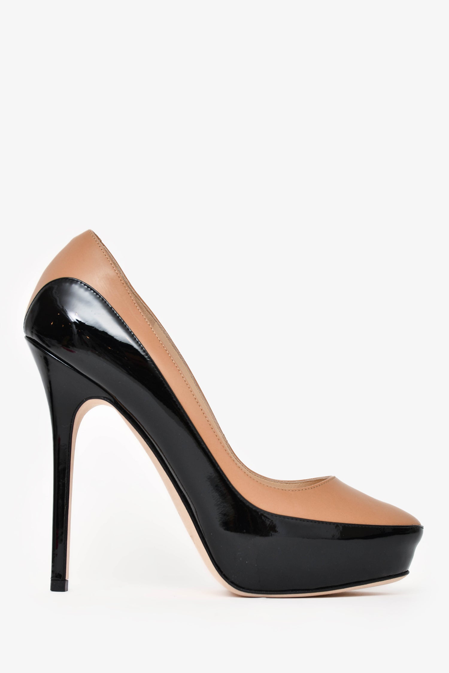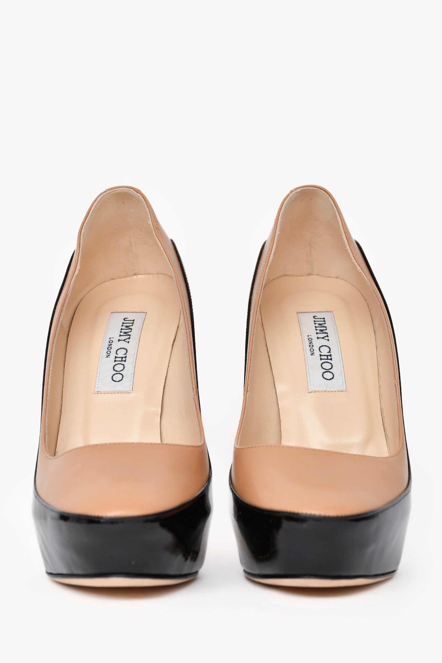 Refresh availabilityJimmy Choo Black/Beige Patent/Leather Heels. Slip-on style. Tonal stitching.
