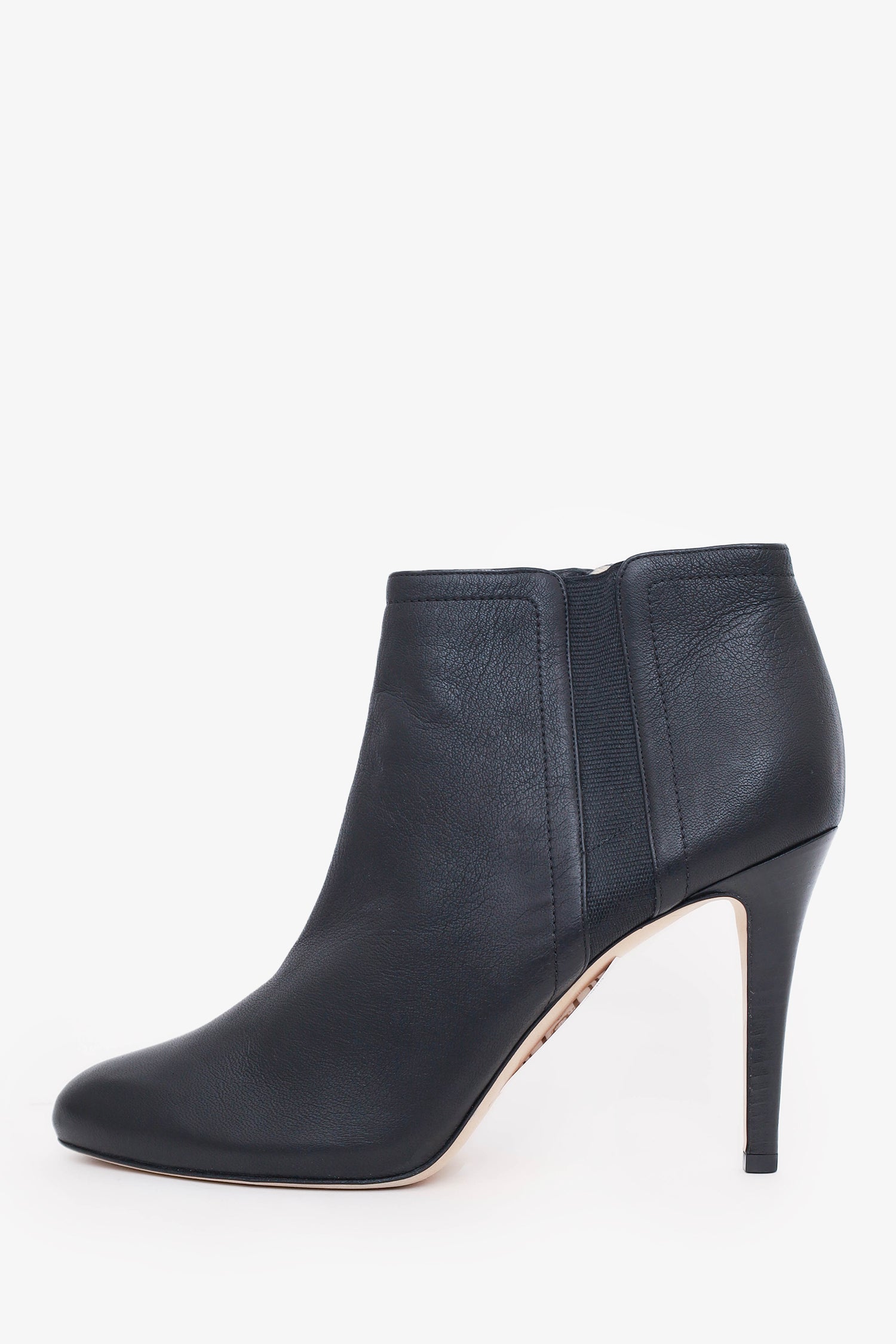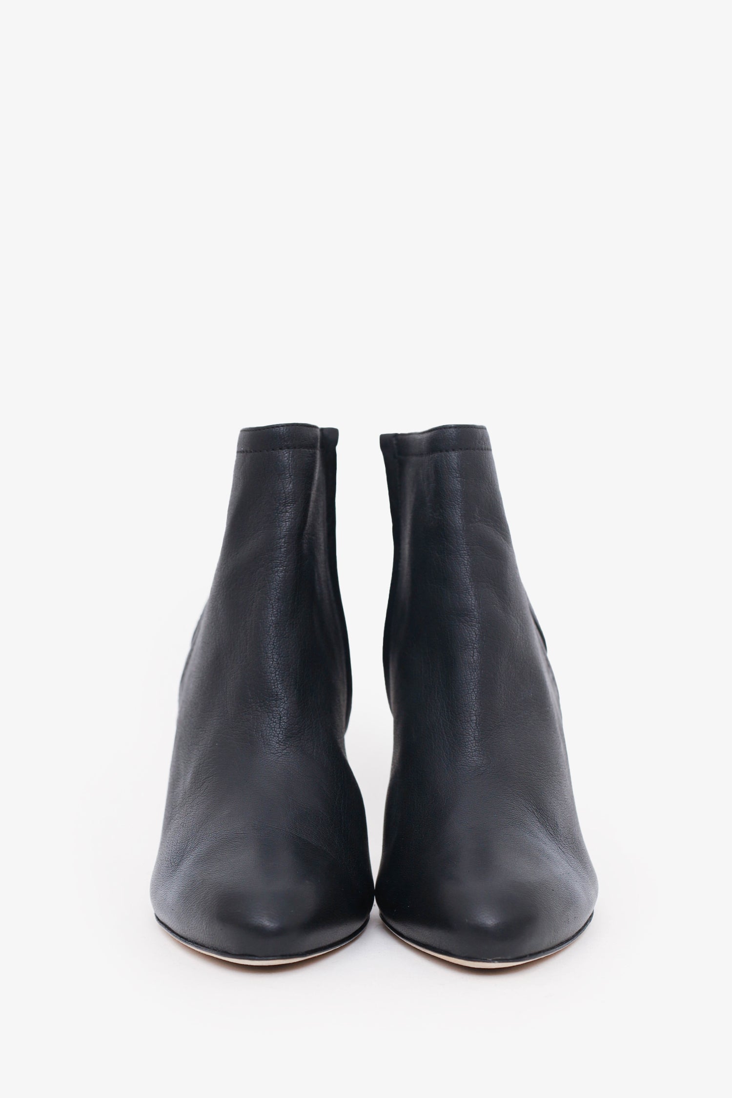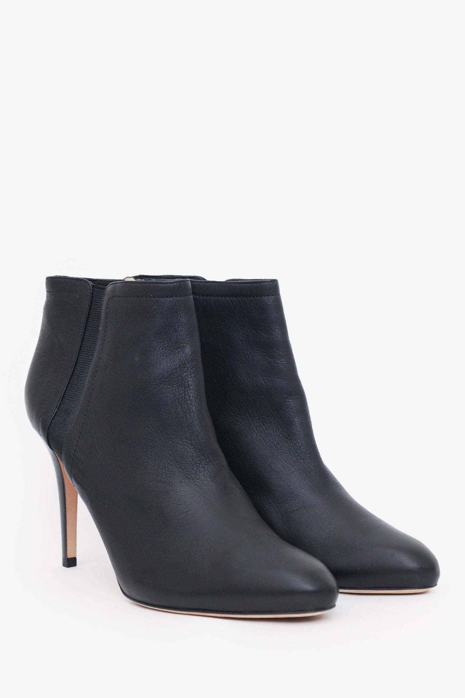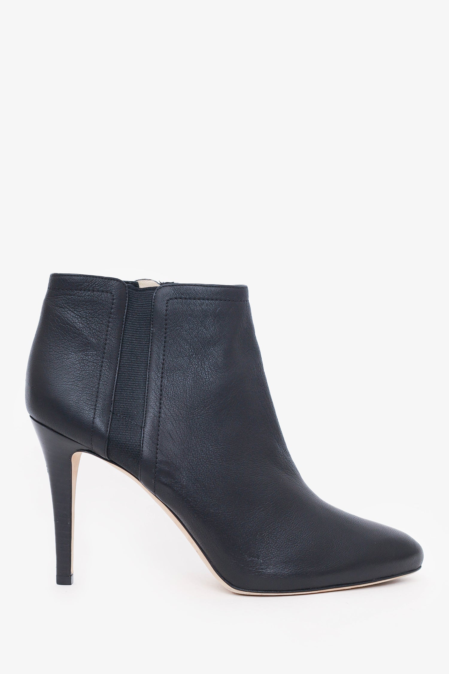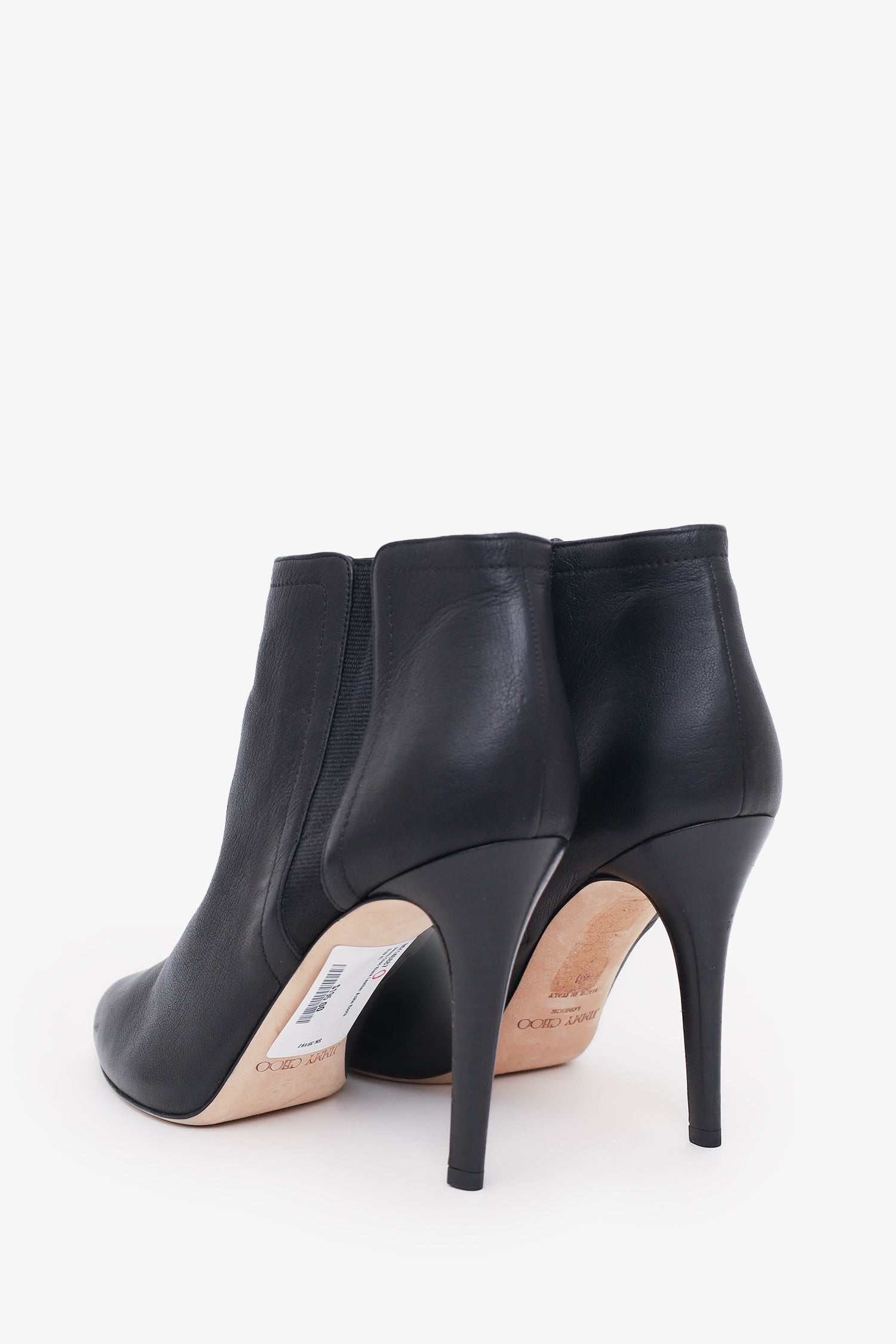 Refresh availabilityJimmy Choo Black Leather Ankle Boots. Slip on with side zip closure. Pointed toe. Elasticated detail on outer sides. Gold-tone hardware. Tonal stitching.