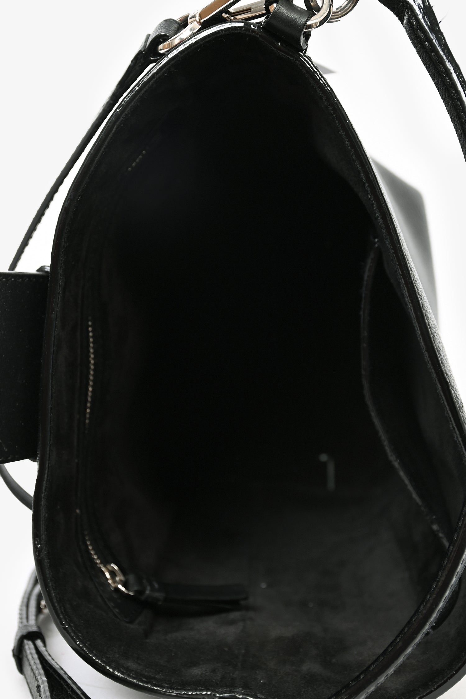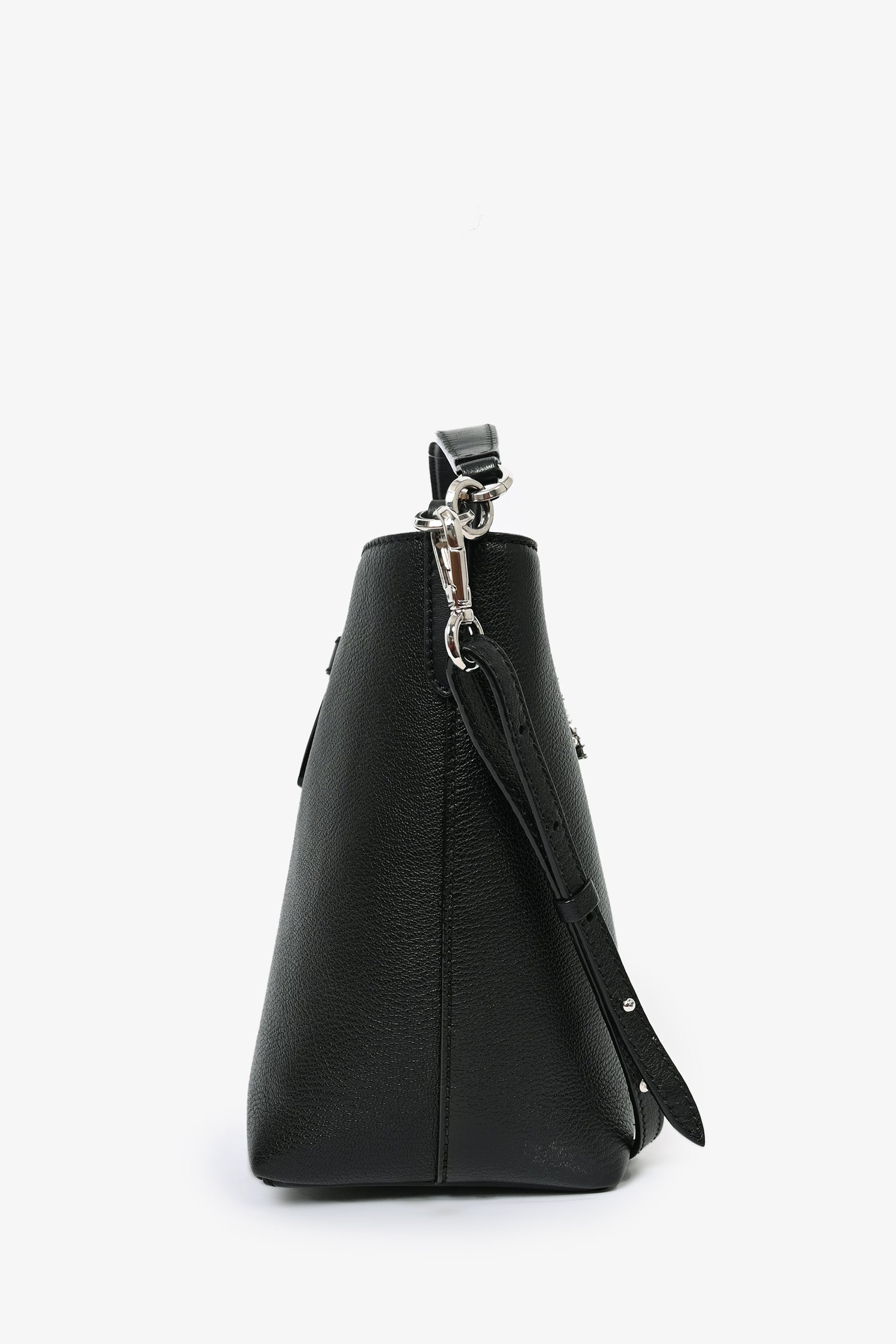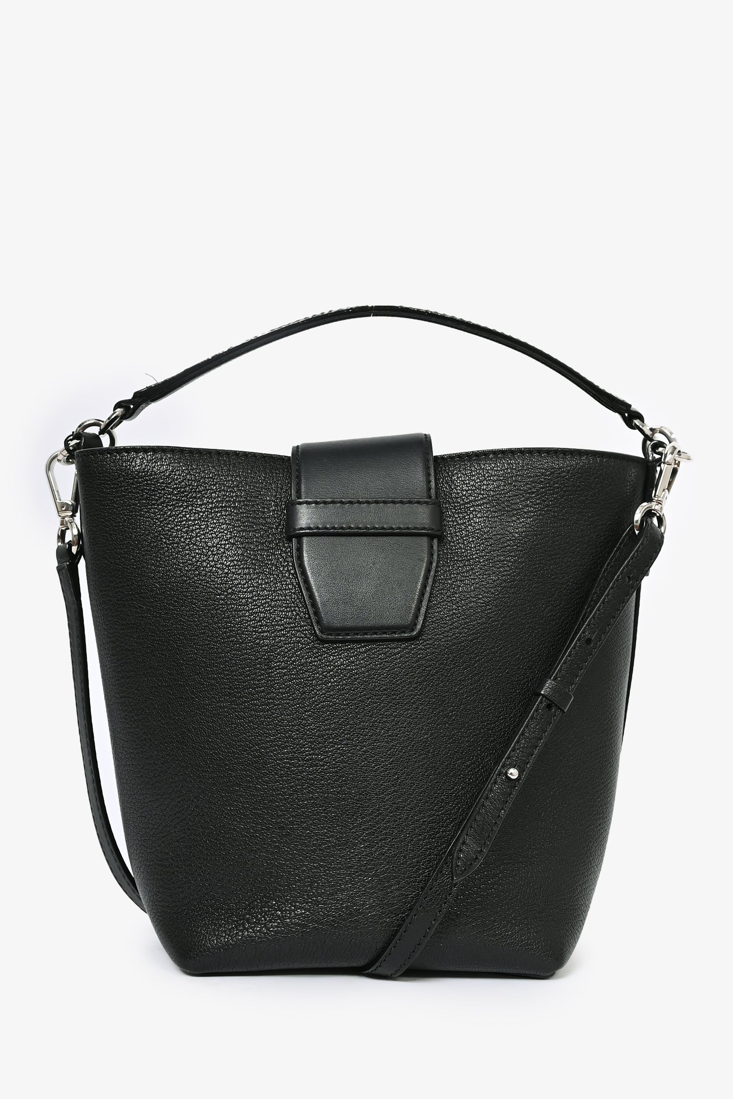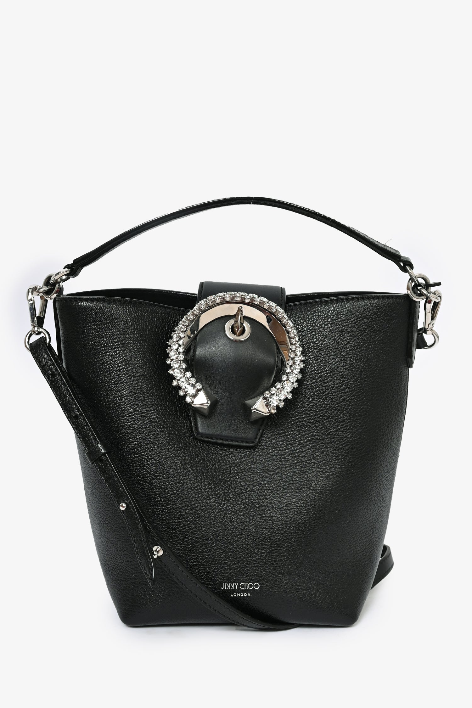 Refresh availabilityJimmy Choo Black Leather 'Madeline' Bucket Bag. Silver-toned hardware. Handle strap with silver-toned and leather accents. Attachable shoulder strap. Tonal stitching. Magnetic snap closure at front. Embellished closure. Suede lined interior with zippered compartment and pocket.