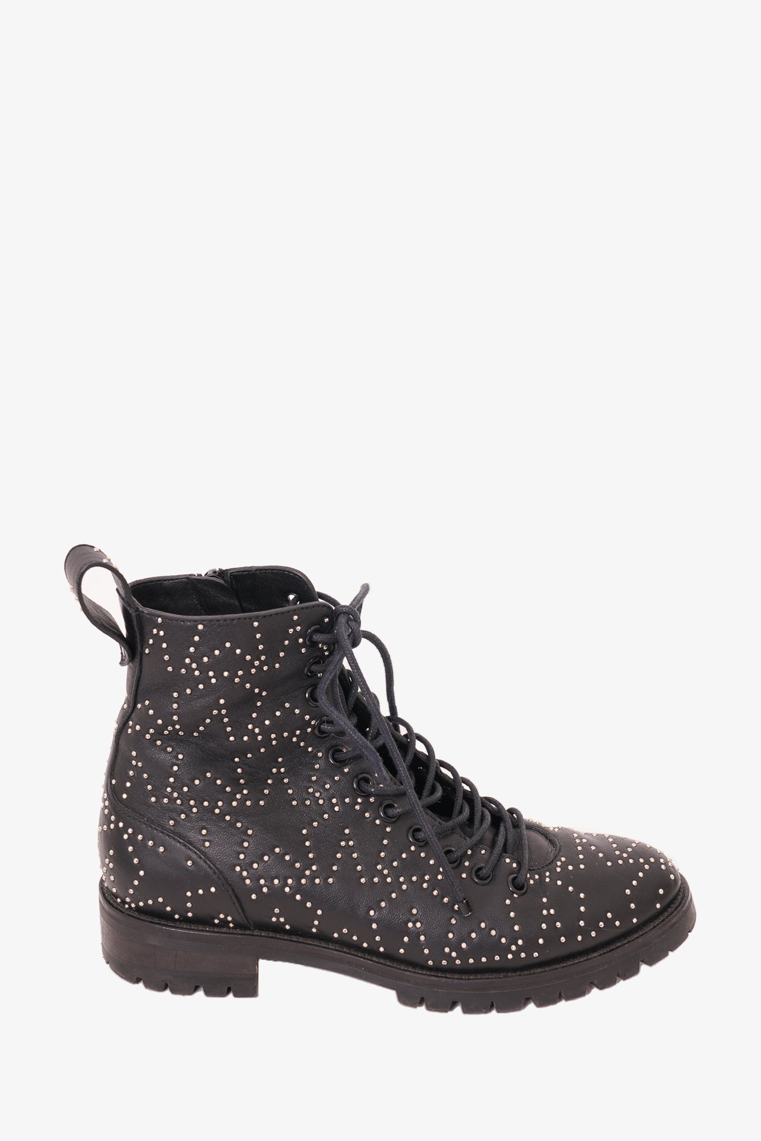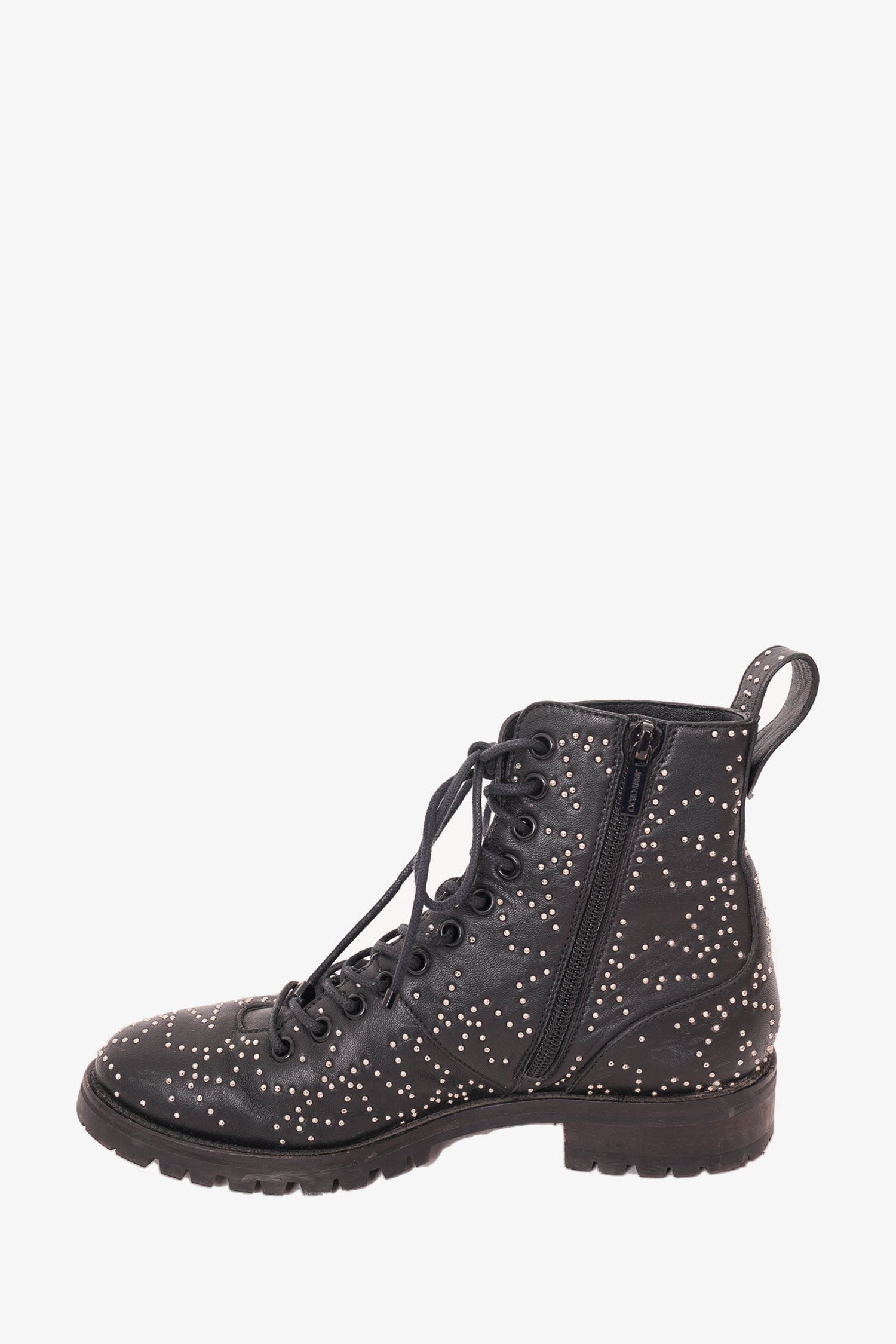 Refresh availabilityJimmy Choo Black Leather Studded Lace-Up Boots. Rounded toe. Side zip closure. Front Lace up closure. Silver-toned hardware. Tonal stitching.