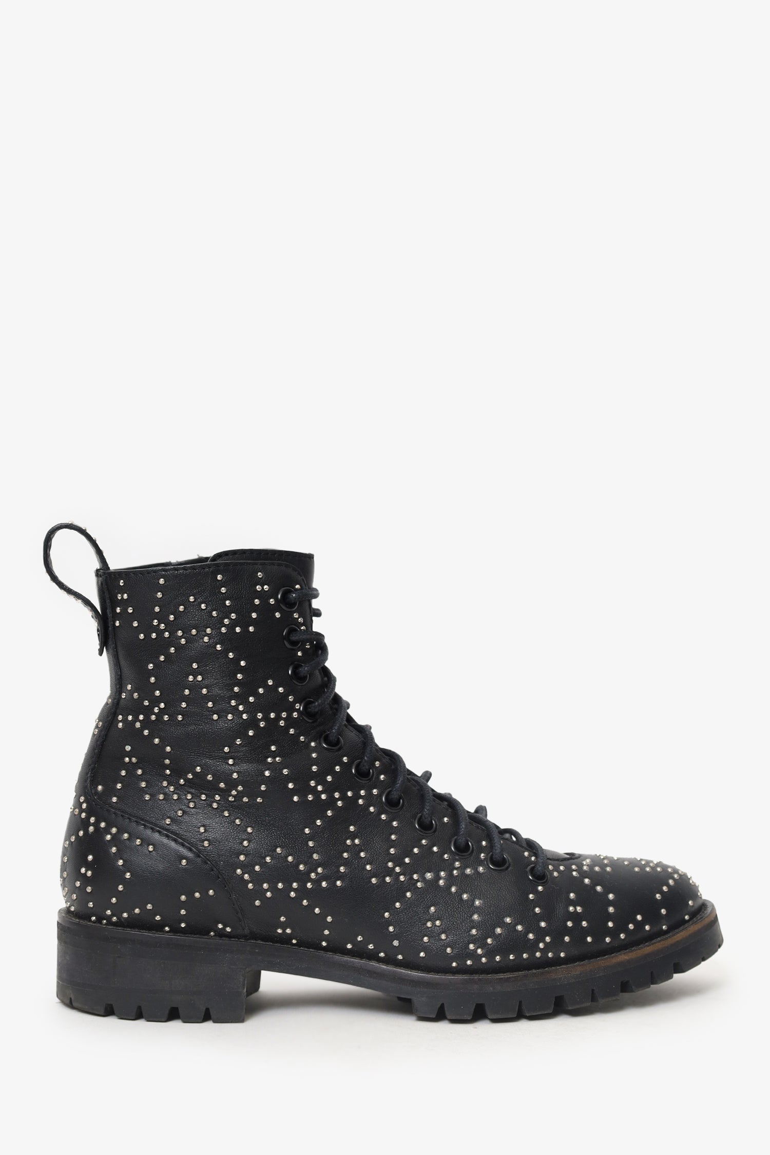 Refresh availabilityJimmy Choo Black Leather Studded Lace-Up Boots. Pull-on. Round neckline. Front lace-up closure. Side inner zio closure. Rear pull tabs. Leather-lined interior. Silver-tone hardware. Tonal stitching.