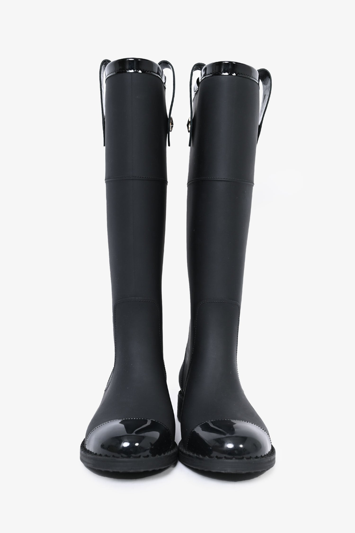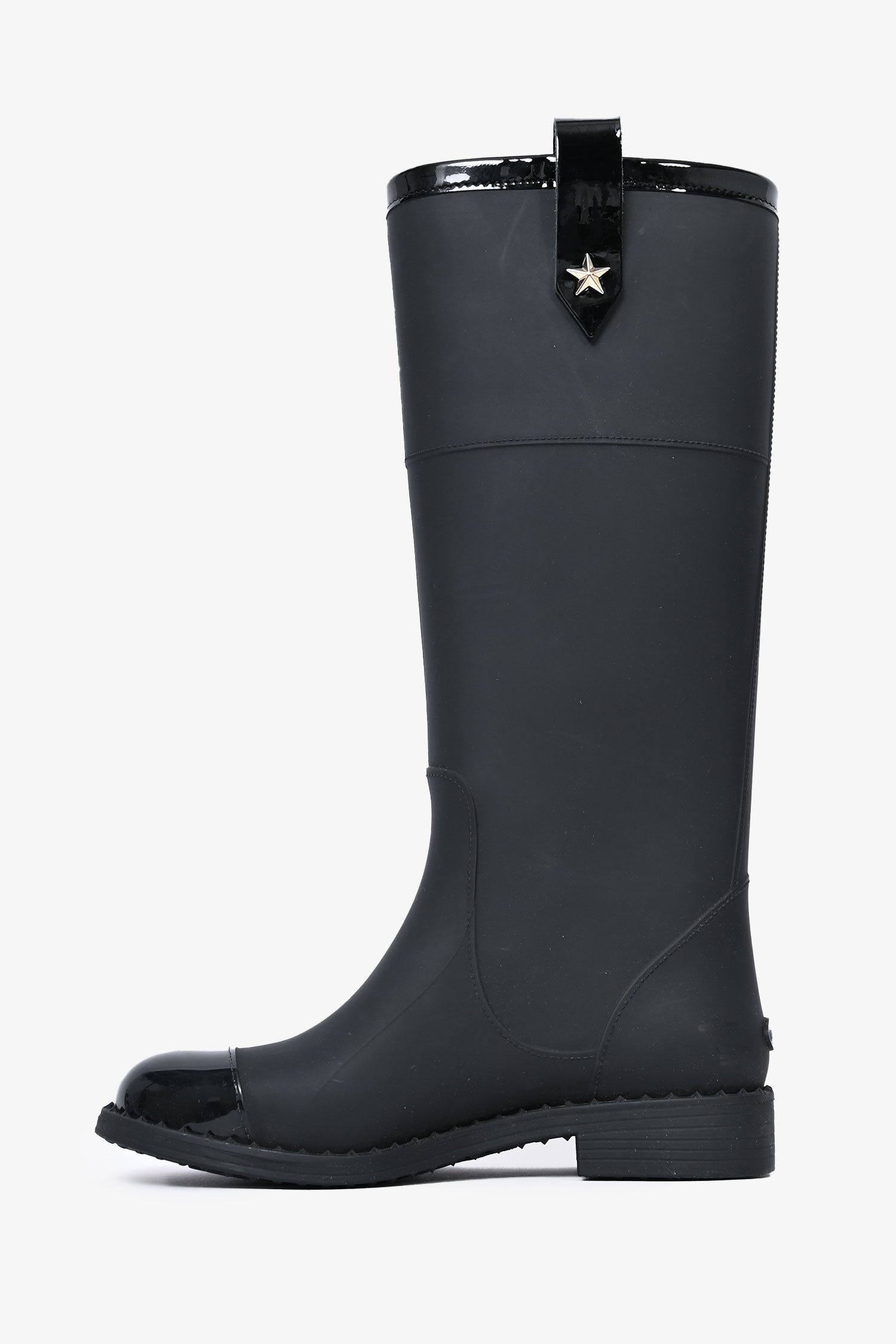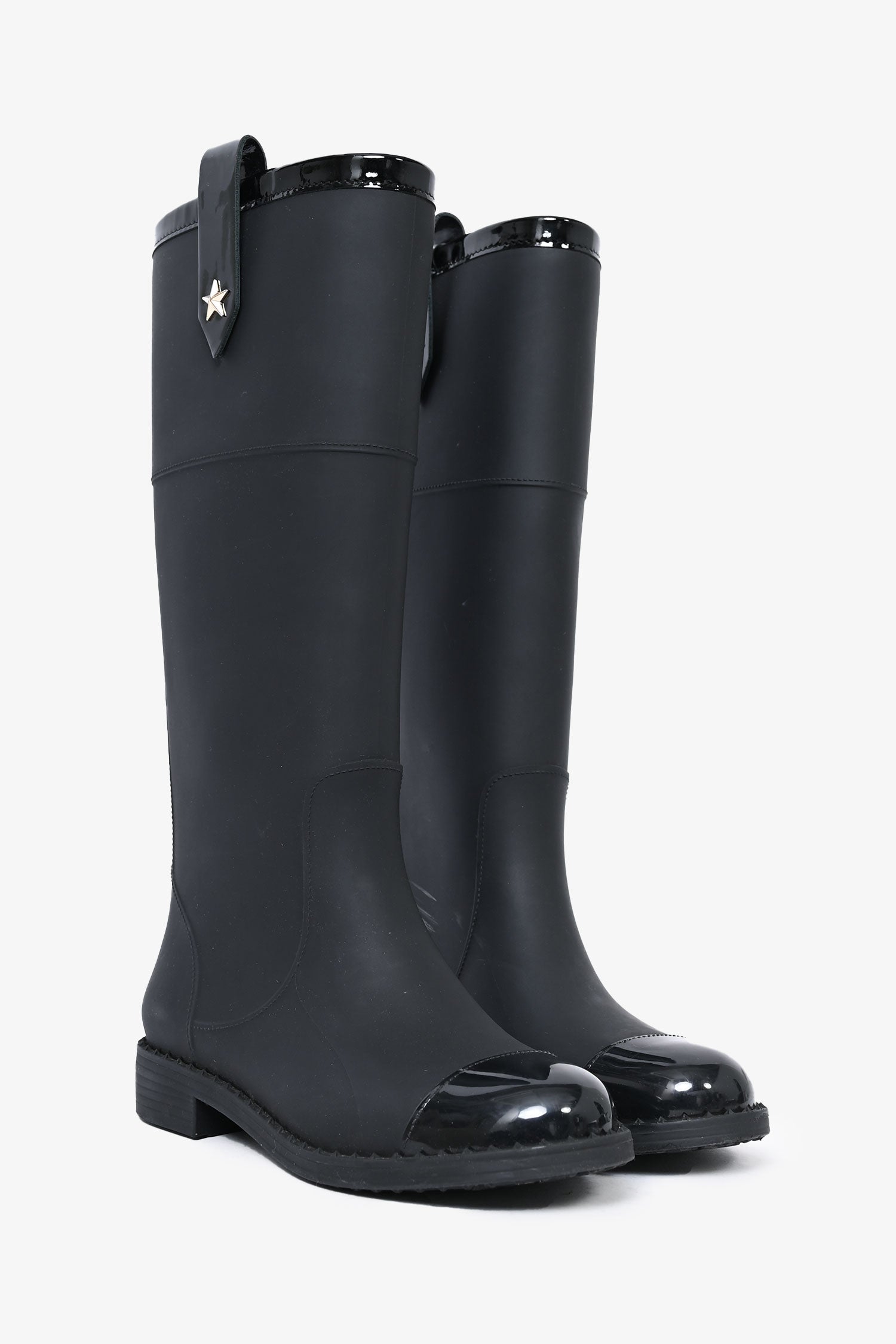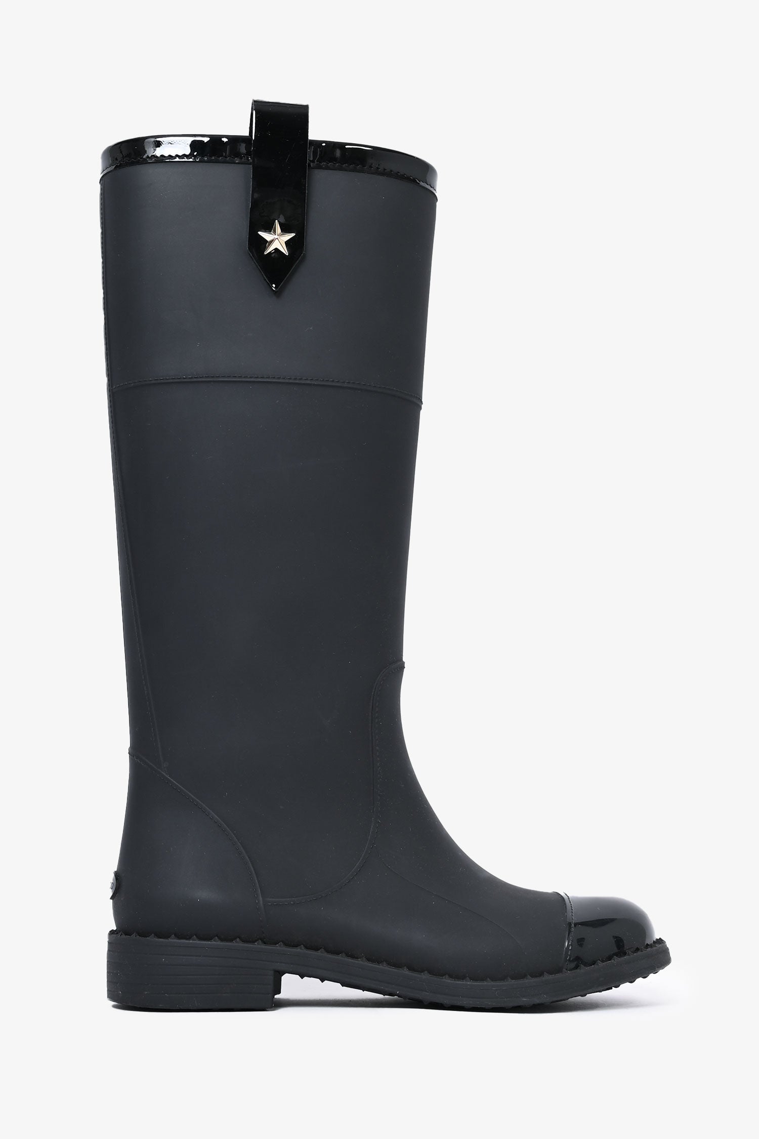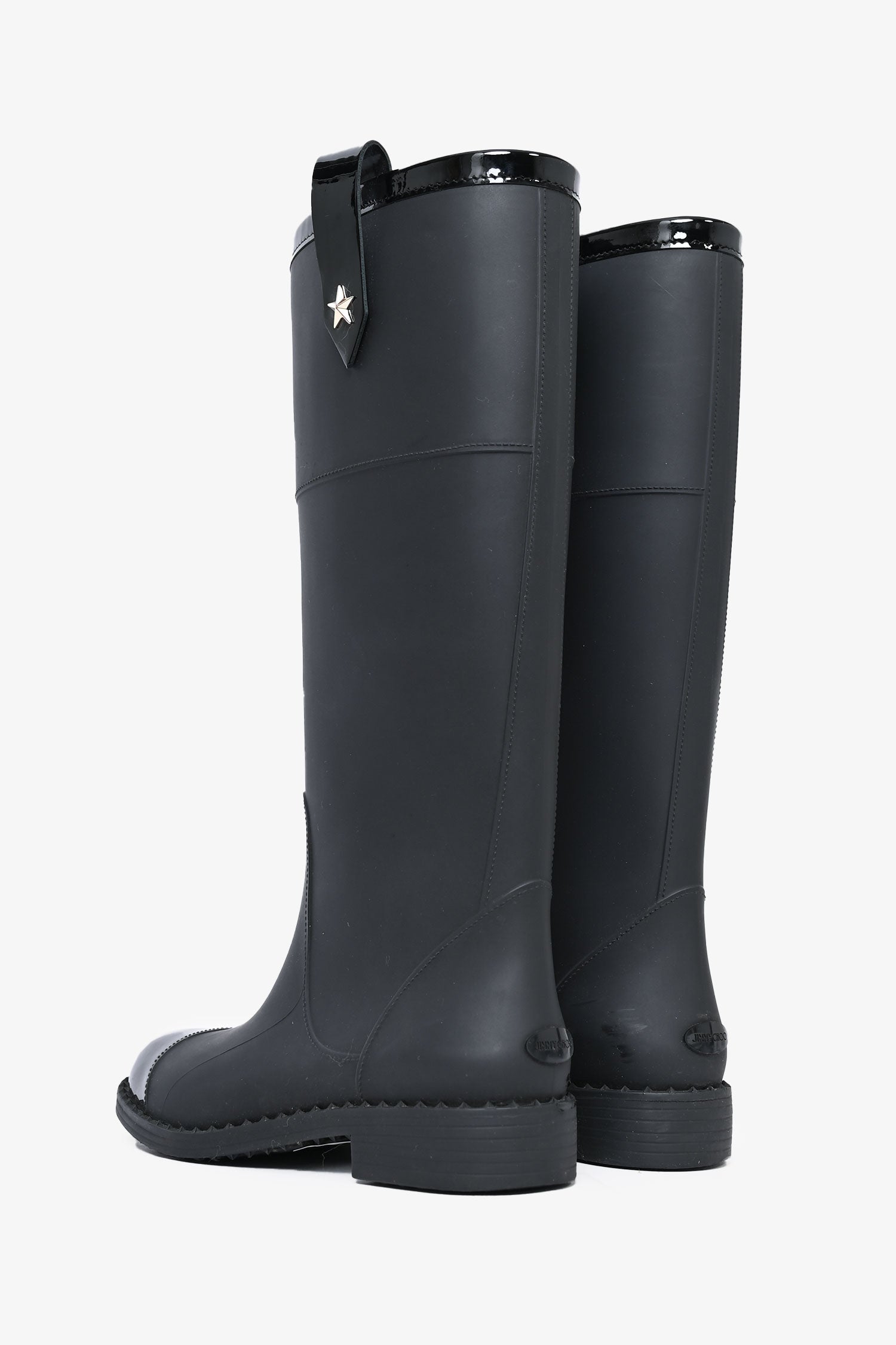Refresh availabilityJimmy Choo Black Rubber 'Edith' Boots. Round toe. Pull-on. Strap with star detail on the sides. Glossy cap toe.