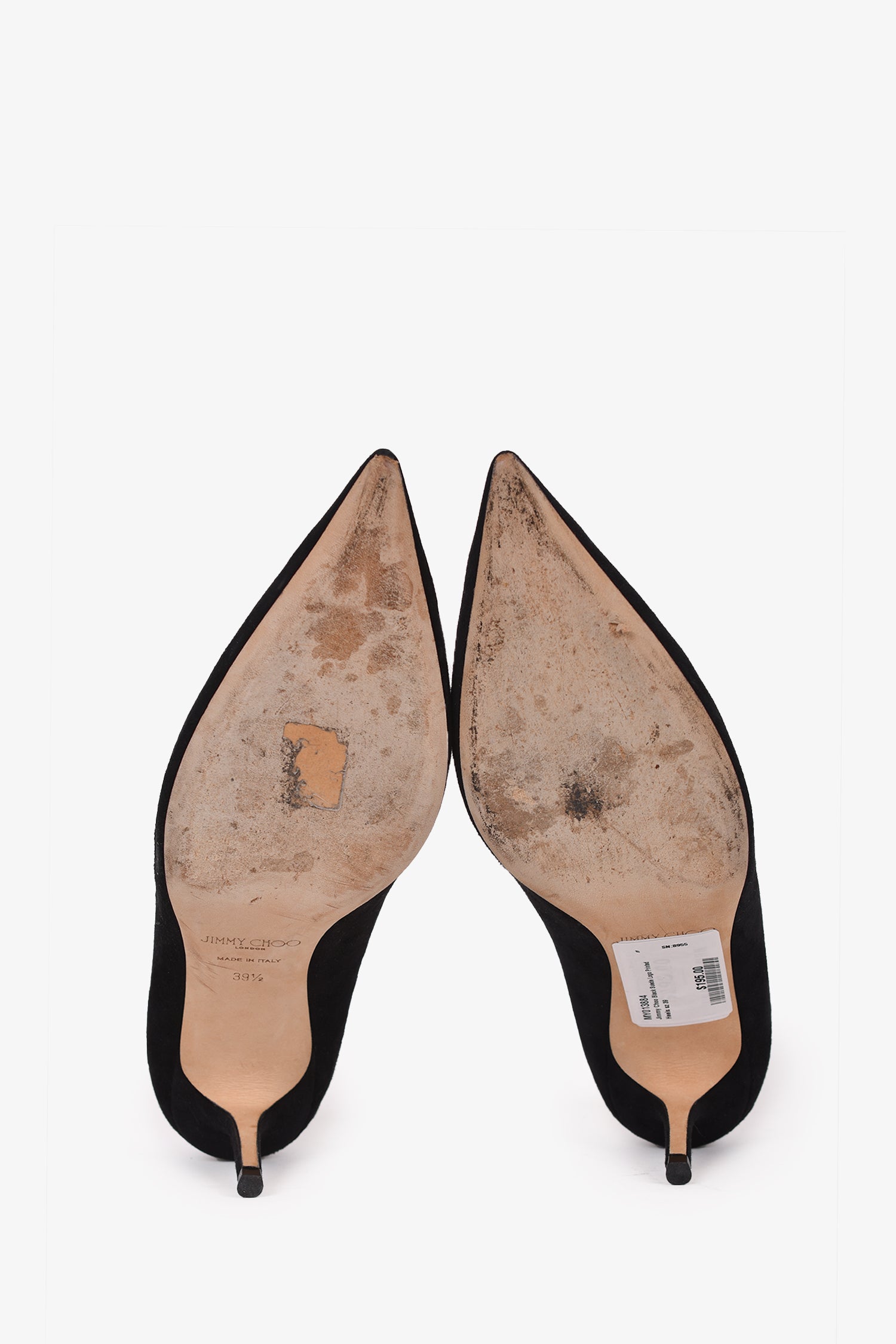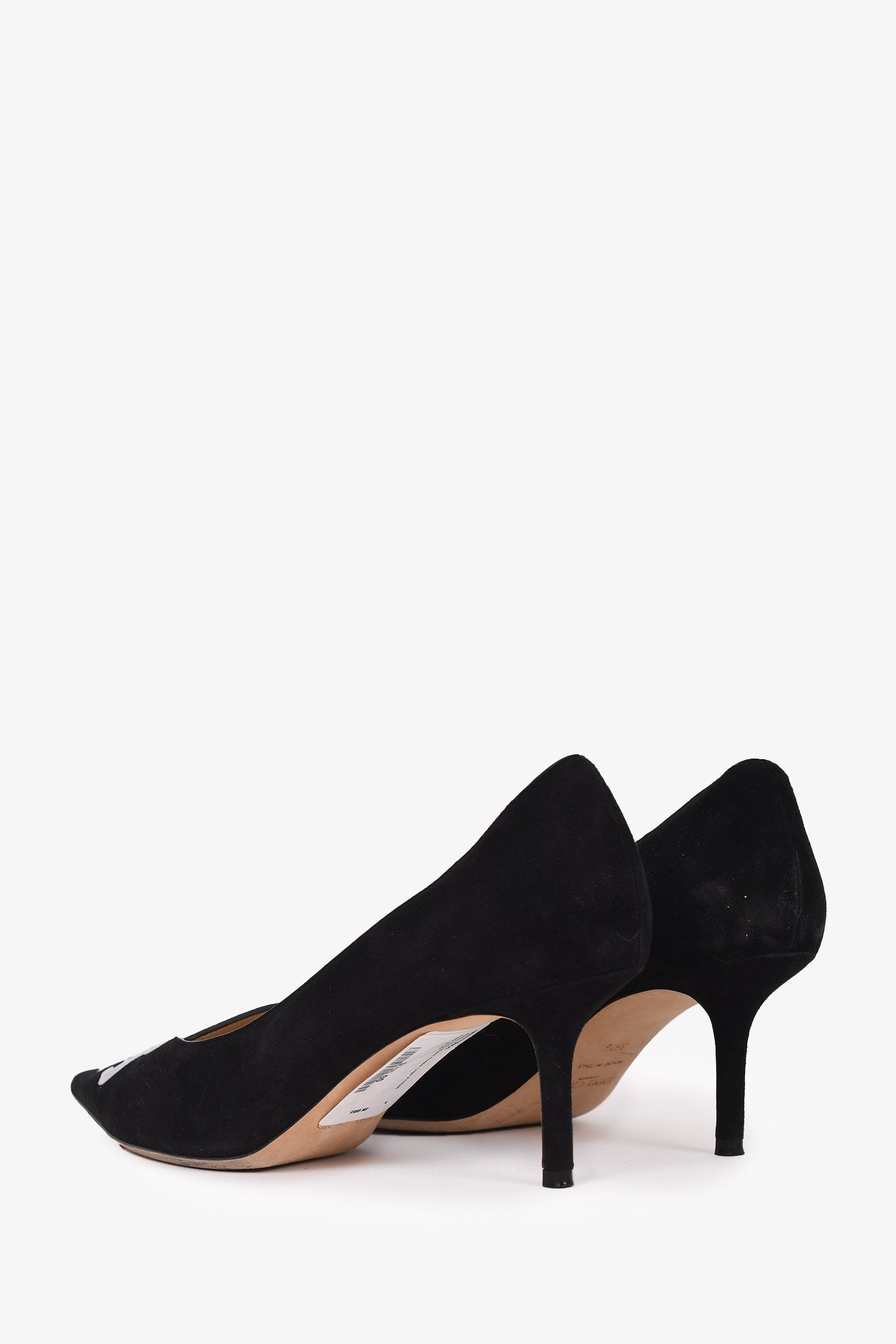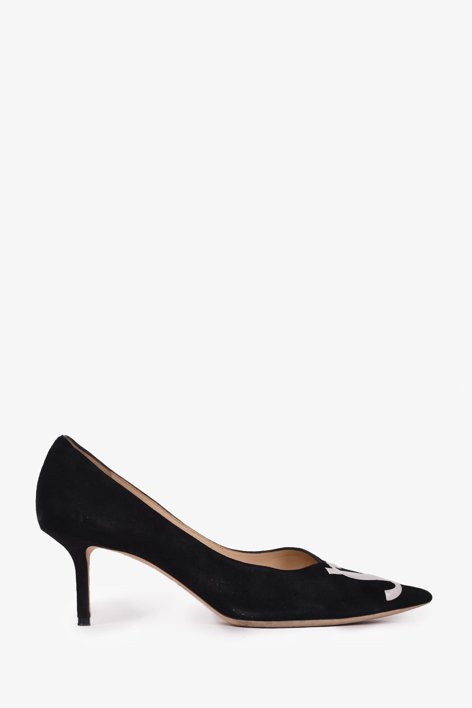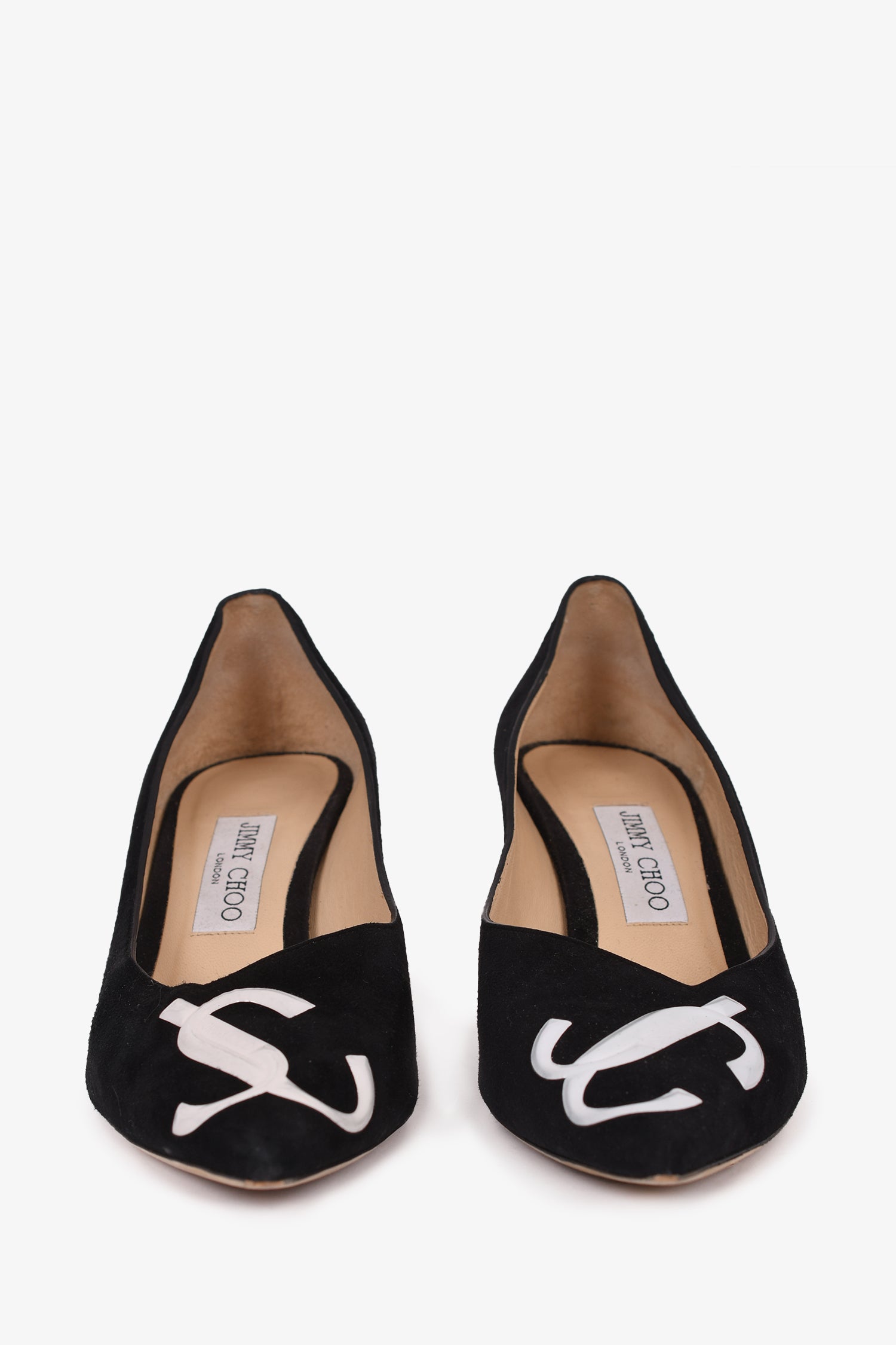 Refresh availabilityJimmy Choo Black Suede Logo Printed Heels. Slip-on. Pointed toe. Tonal stitching.
