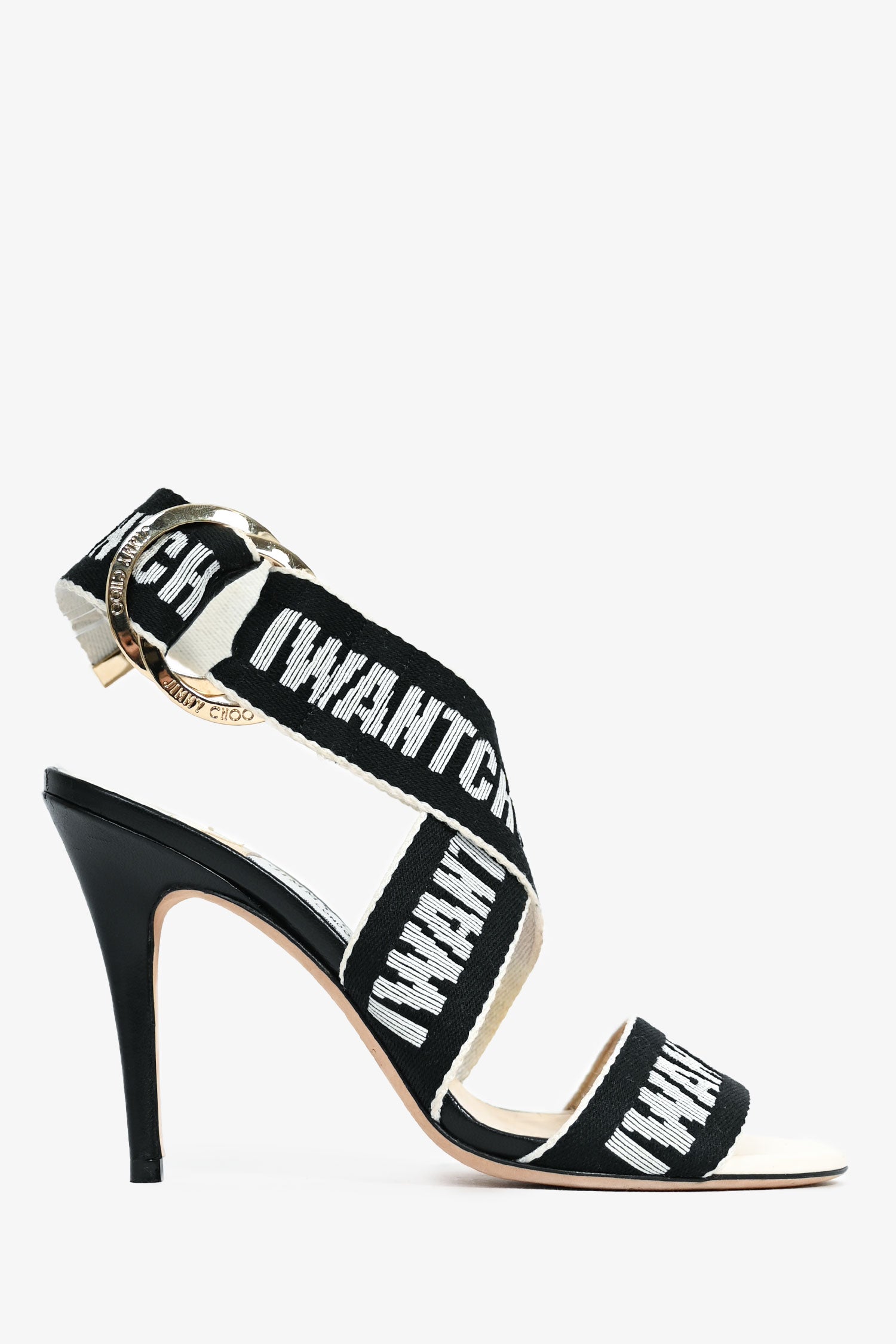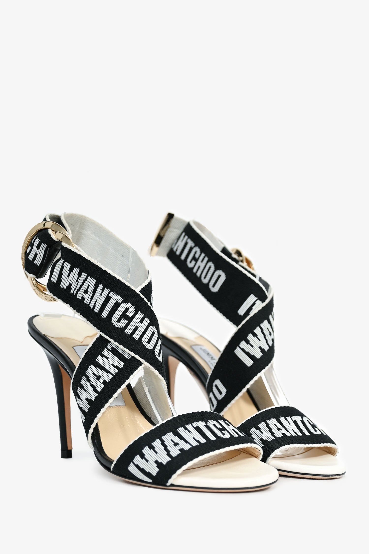 Refresh availabilityJimmy Choo Black/White Logo Wrap Canvas Heels. Open toe. Wrap-around buckle closure. Gold-tone hardware. Tonal stitching.