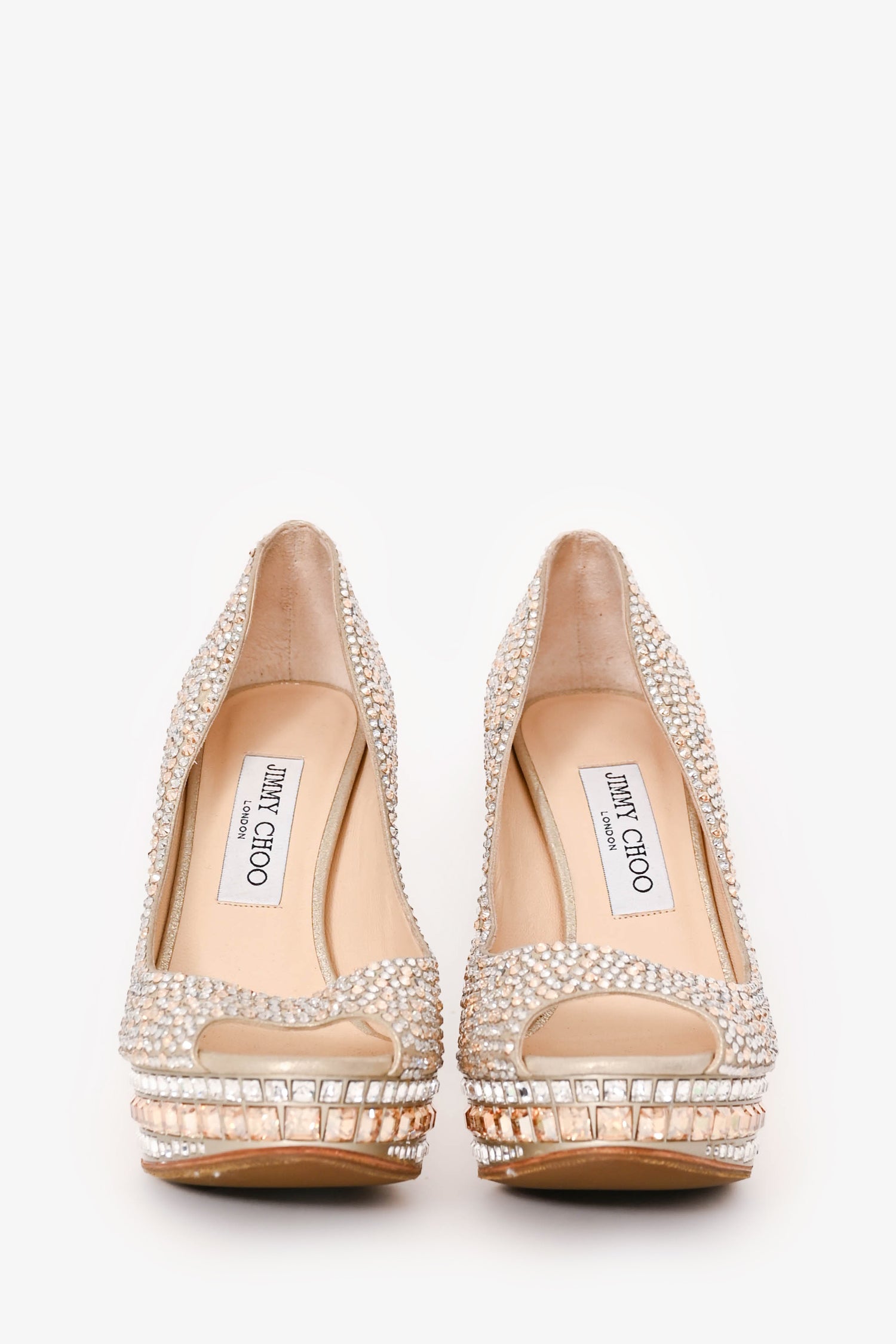 Refresh availabilityJimmy Choo Crystal Embellished 'Kendall' Peep-Toe Platform Heels. Slip-on. Leather lining and insole. Silver and gold-tone hardware. Tonal stitching.