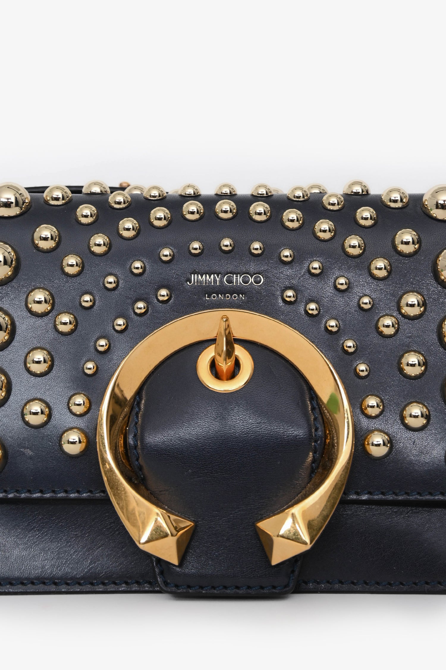 Refresh availabilityJimmy Choo Navy Leather 'Madeline' Crossbody Bag. Front fold-over flap with concealed magnetic closures. Adjustable crossbody strap. 1 exterior slip compartment. Suede-lined interior. 3 interior compartments. Gold-tone hardware. Tonal stitching.
